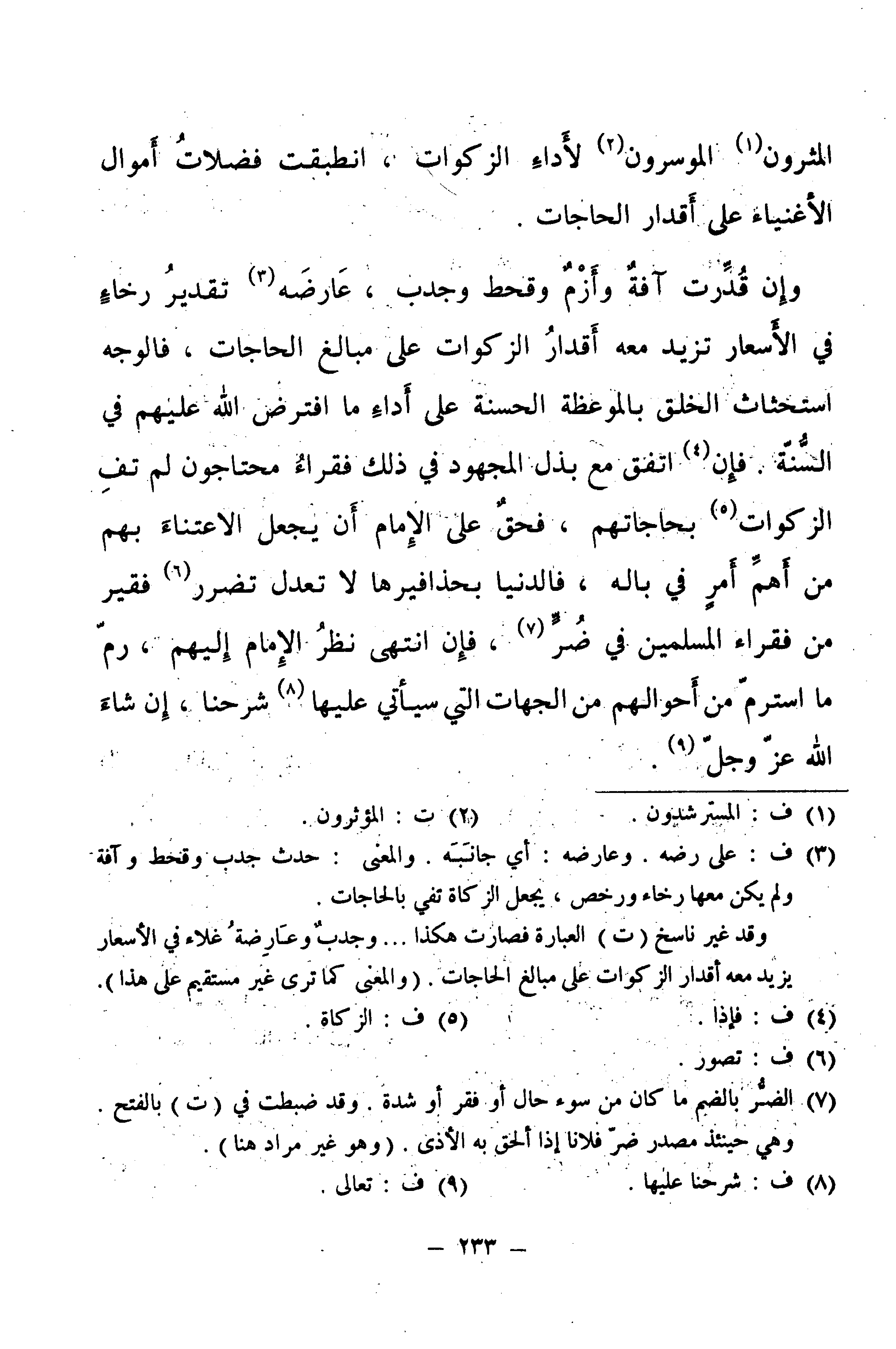 الْمُثْرُونَ الْمُوسِرُونَ لِأَدَاءِ الزَّكَوَاتِ، انْطَبَقَتْ فَضَلَاتُ أَمْوَالِ الْأَغْنِيَاءِ عَلَى أَقْدَارِ الْحَاجَاتِ.