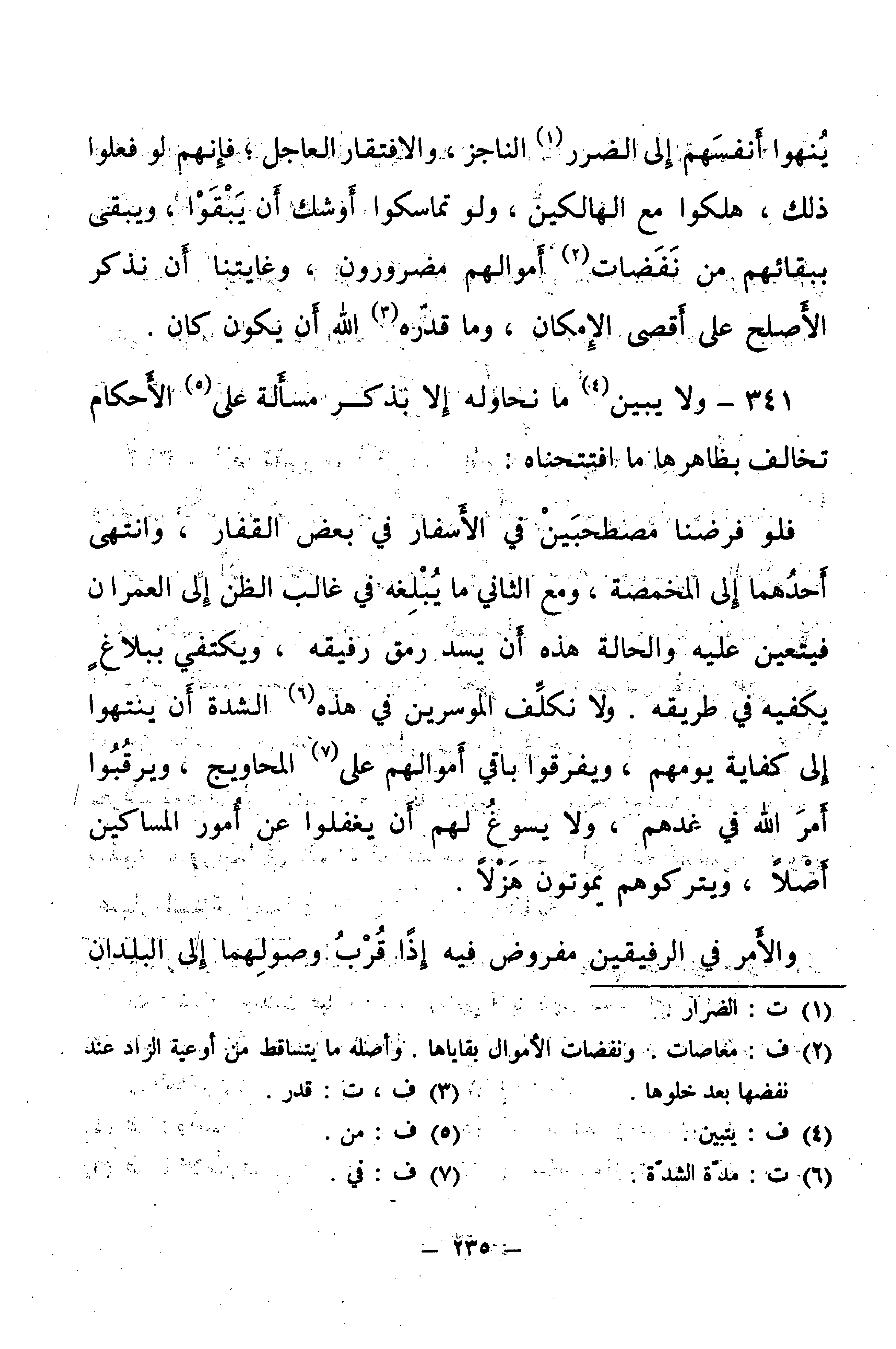 341 - وَلَا يَبِينُ مَا نُحَاوِلُهُ إِلَّا بِذِكْرِ مَسْأَلَةٍ عَلَى الْأَحْكَامِ تُخَالِفُ بِظَاهِرِهَا مَا افْتَتَحْنَاهُ: فَلَوْ فَرَضْنَا مُصْطَحِبَيْنِ فِي الْأَسْفَارِ فِي بَعْضِ الْقِفَارِ، وَانْتَهَى أَحَدُهُمَا إِلَى الْمَخْمَصَةِ، وَمَعَ الثَّانِي مَا يُبْلِغُهُ فِي غَالِبِ الظَّنِّ إِلَى الْعُمْرَانِ، فَيَتَعَيَّنُ عَلَيْهِ، وَالْحَالَةُ هَذِهِ أَنْ يَسُدَّ رَمَقَ رَفِيقِهِ، وَيَكْتَفِيَ بِبَلَاغٍ يَكْفِيهِ فِي طَرِيقِهِ. وَلَا نُكَلِّفُ الْمُوسِرِينَ فِي هَذِهِ الشِّدَّةِ أَنْ يَنْتَهُوا إِلَى كِفَايَةِ يَوْمِهِمْ، وَيُفَرِّقُوا بَاقِيَ أَمْوَالِهِمْ عَلَى الْمَحَاوِيجِ، وَيَرْقُبُوا أَمْرَ اللَّهِ فِي غَدِهِمْ، وَلَا يَسُوغُ لَهُمْ أَنْ يَغْفُلُوا عَنْ أُمُورِ الْمَسَاكِينِ أَصْلًا، وَيَتْرُكُوهُمْ يَمُوتُونَ هَزْلًا.