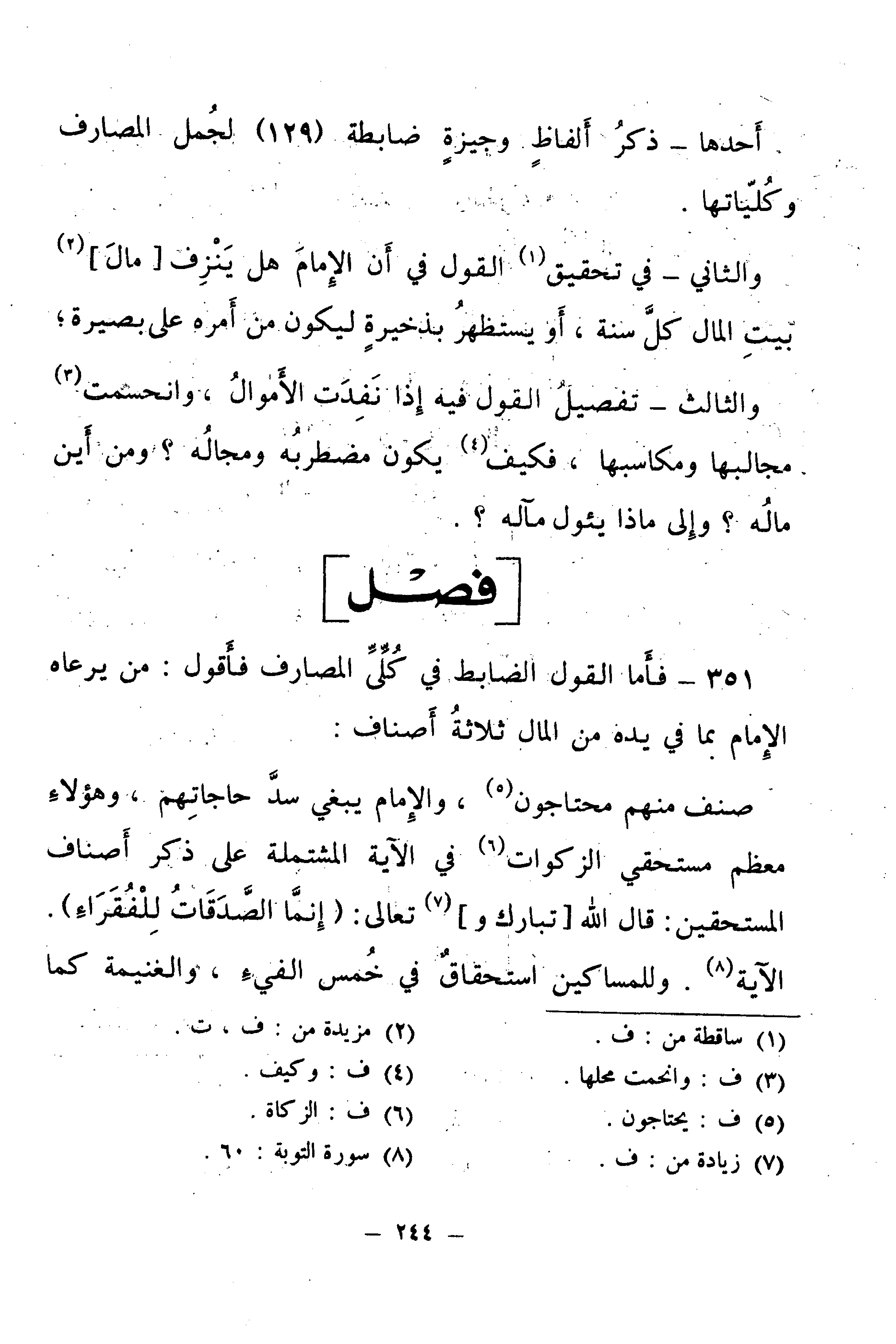 351 - فَأَمَّا الْقَوْلُ الضَّابِطُ فِي كُلِّيِّ الْمَصَارِفِ فَأَقُولُ: مَنْ يَرْعَاهُ الْإِمَامُ بِمَا فِي يَدِهِ مِنَ الْمَالِ ثَلَاثَةُ أَصْنَافٍ: صِنْفٌ مِنْهُمْ مُحْتَاجُونَ، وَالْإِمَامُ يَبْغِي سَدَّ حَاجَاتِهِمْ، وَهَؤُلَاءِ مُعْظَمُ مُسْتَحَقِّي الزَّكَوَاتِ فِي الْآيَةِ الْمُشْتَمِلَةِ عَلَى ذِكْرِ أَصْنَافِ الْمُسْتَحِقِّينَ: قَالَ اللَّهُ - تَبَارَكَ وَتَعَالَى -: {إِنَّمَا الصَّدَقَاتُ لِلْفُقَرَاءِ} الْآيَةَ. وَلِلْمَسَاكِينِ اسْتِحْقَاقٌ فِي خُمُسِ الْفَيْءِ وَالْغَنِيمَةِ كَمَا