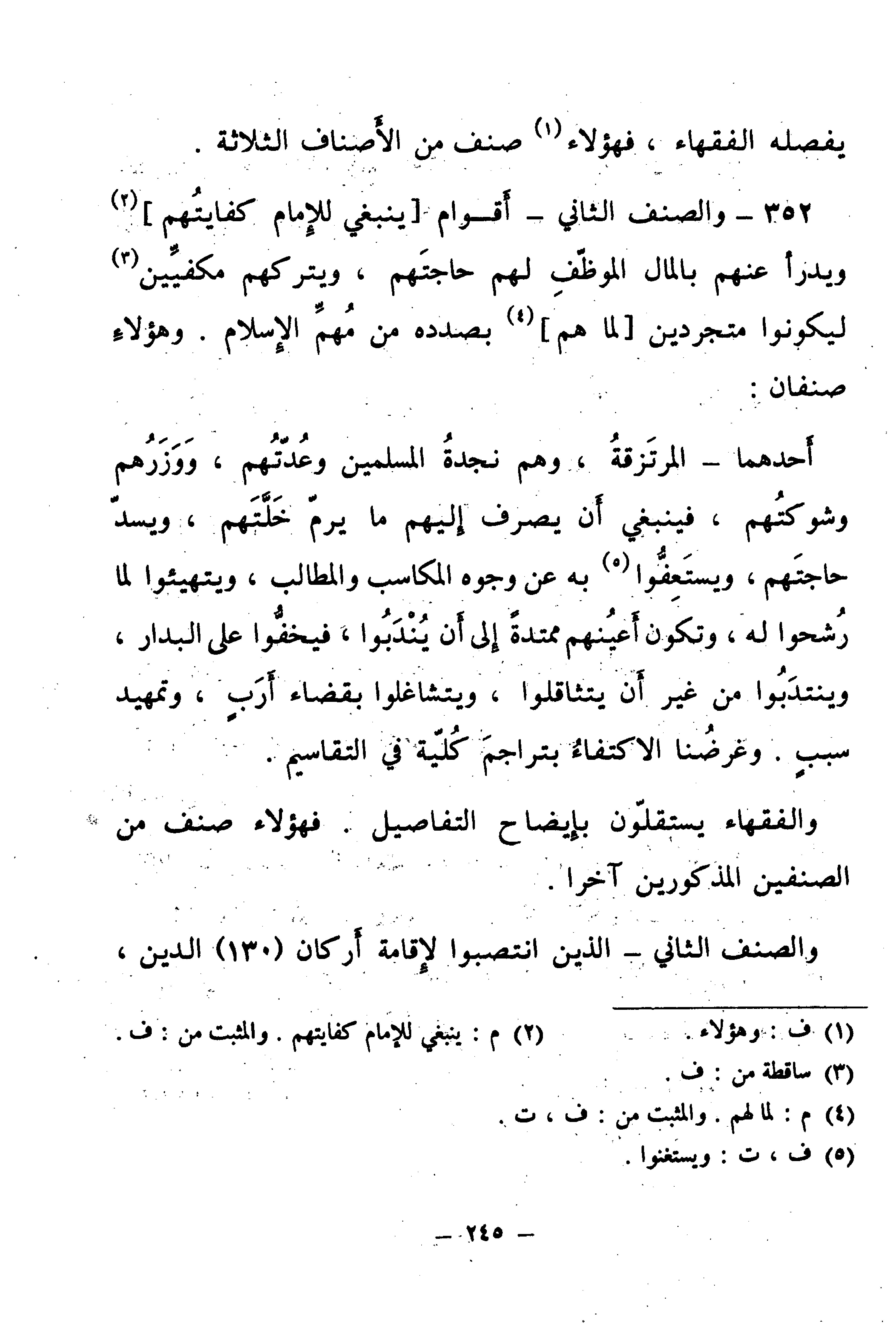 352 - وَالصِّنْفُ الثَّانِي: أَقْوَامٌ يَنْبَغِي لِلْإِمَامِ كِفَايَتُهُمْ، وَيَدْرَأُ عَنْهُمْ بِالْمَالِ الْمُوَظَّفِ لَهُمْ حَاجَتَهُمْ، وَيَتْرُكُهُمْ مَكْفِيِّينَ، لِيَكُونُوا مُتَجَرِّدِينَ لِمَا هُمْ بِصَدَدِهِ مِنْ مُهِمِّ الْإِسْلَامِ. وَهَؤُلَاءِ صِنْفَانِ: أَحَدُهُمَا: الْمُرْتَزِقَةُ، وَهُمْ نَجْدَةُ الْمُسْلِمِينَ وَعُدَّتُهُمْ، وَوَزَرُهُمْ وَشَوْكَتُهُمْ، فَيَنْبَغِي أَنْ يَصْرِفَ إِلَيْهِمْ مَا يَرُمُّ خَلَّتَهُمْ، وَيَسُدُّ حَاجَتَهُمْ، وَيَسْتَعِفُّوا بِهِ عَنْ وُجُوهِ الْمَكَاسِبِ وَالْمَطَالِبِ، وَيَتَهَيَّأُوا لِمَا رُشِّحُوا لَهُ، وَتَكُونُ أَعْيُنُهُمْ مُمْتَدَّةٌ إِلَى أَنْ يُنْدَبُوا فَيَخِفُّوا عَلَى الْبِدَارِ، وَيُنْتَدَبُوا مِنْ غَيْرِ أَنْ يَتَثَاقَلُوا، وَيَتَشَاغَلُوا بِقَضَاءِ أَرَبٍ، وَتَمْهِيدِ سَبَبٍ، وَغَرَضُنَا الِاكْتِفَاءُ بِتَرَاجِمَ كُلِّيَّةٍ فِي التَّقَاسِيمِ.
