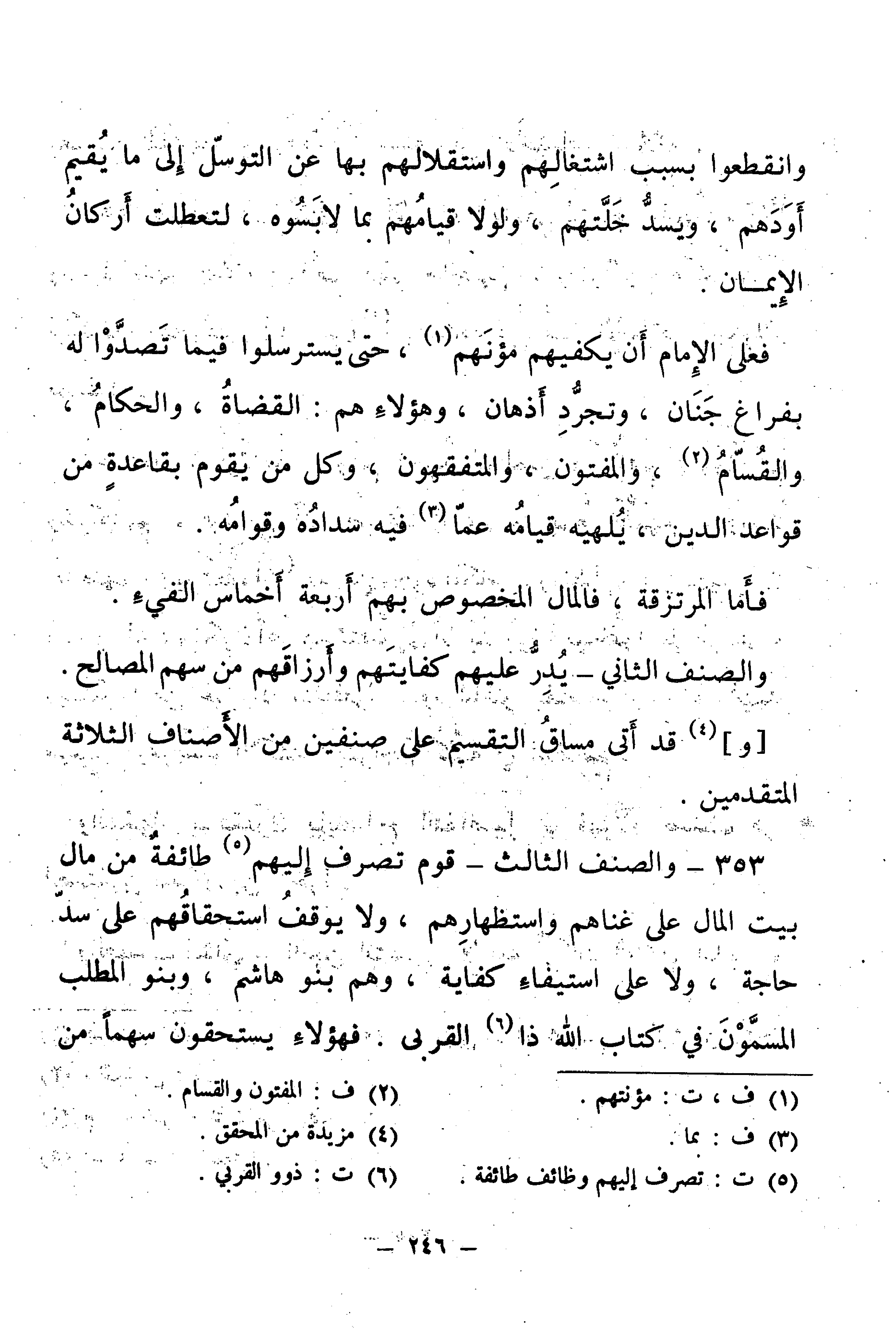 353 - وَالصِّنْفُ الثَّالِثُ: قَوْمٌ تُصْرَفُ إِلَيْهِمْ طَائِفَةٌ مِنْ مَالِ بَيْتِ الْمَالِ عَلَى غِنَاهُمْ وَاسْتِظْهَارِهِمْ، وَلَا يُوقَفُ اسْتِحْقَاقُهُمْ عَلَى سَدِّ حَاجَةٍ، وَلَا اسْتِبْقَاءِ كِفَايَةٍ، وَهُمْ بَنُو هَاشِمٍ، وَبَنُو الْمُطَّلِبِ الْمُسَمَّوْنَ فِي كِتَابِ اللَّهِ ذَا الْقُرْبَى. فَهَؤُلَاءِ يَسْتَحِقُّونَ سَهْمًا مِنْ