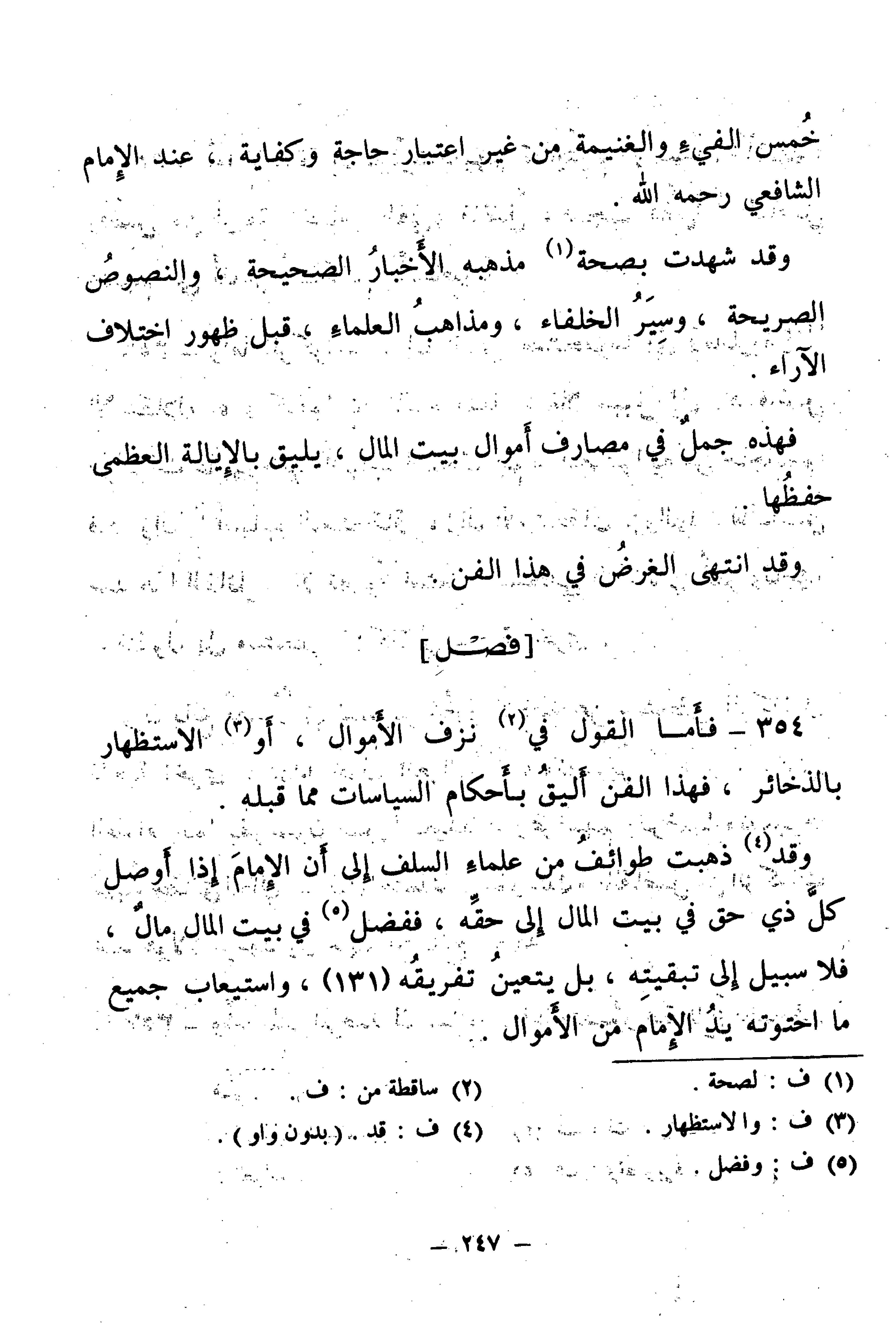 354 - فَأَمَّا الْقَوْلُ فِي نَزْفِ الْأَمْوَالِ، أَوْ الِاسْتِظْهَارِ بِالذَّخَائِرِ، فَهَذَا الْفَنُّ أَلْيَقُ بِأَحْكَامِ السِّيَاسَاتِ مِمَّا قَبْلَهُ.