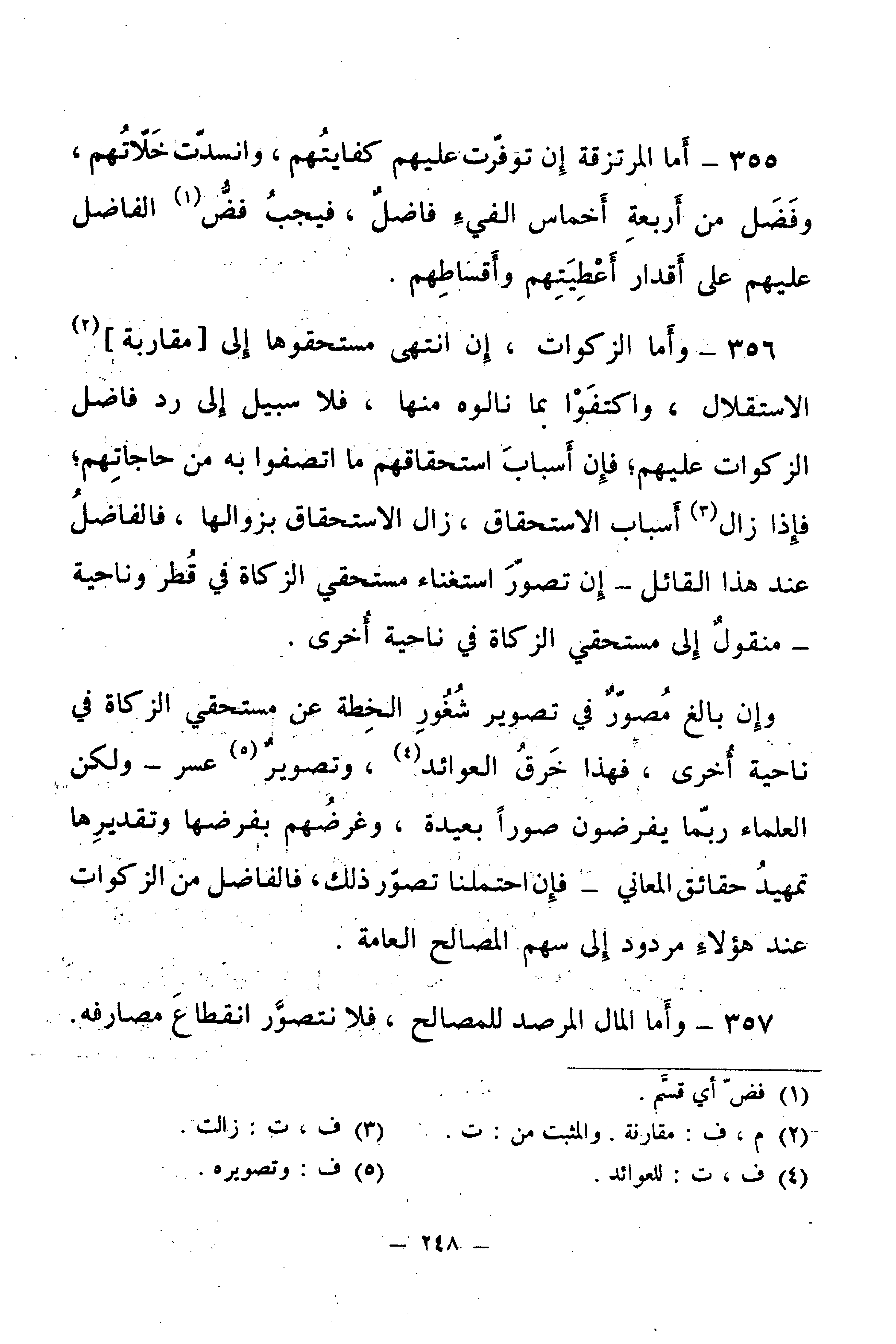 356 - وَأَمَّا الزَّكَوَاتُ، إِنِ انْتَهَى مُسْتَحِقُّوهَا إِلَى مُقَارَبَةِ الِاسْتِقْلَالِ، وَاكْتَفَوْا بِمَا نَالُوهُ مِنْهَا، فَلَا سَبِيلَ إِلَى رَدِّ فَاضِلِ الزَّكَوَاتِ عَلَيْهِمْ ; فَإِنَّ أَسْبَابَ اسْتِحْقَاقِهِمْ مَا اتَّصَفُوا بِهِ مِنْ حَاجَاتِهِمْ ; فَإِذَا زَالَ أَسْبَابُ الِاسْتِحْقَاقِ، زَالَ الِاسْتِحْقَاقُ بِزَوَالِهَا، فَالْفَاضِلُ عِنْدَ هَذَا الْقَائِلِ - إِنْ تُصُوِّرَ اسْتِغْنَاءُ مُسْتَحَقِّي الزَّكَاةِ فِي قُطْرٍ وَنَاحِيَةٍ - مَنْقُولٌ إِلَى مُسْتَحِقِّي الزَّكَاةِ فِي نَاحِيَةٍ أُخْرَى.