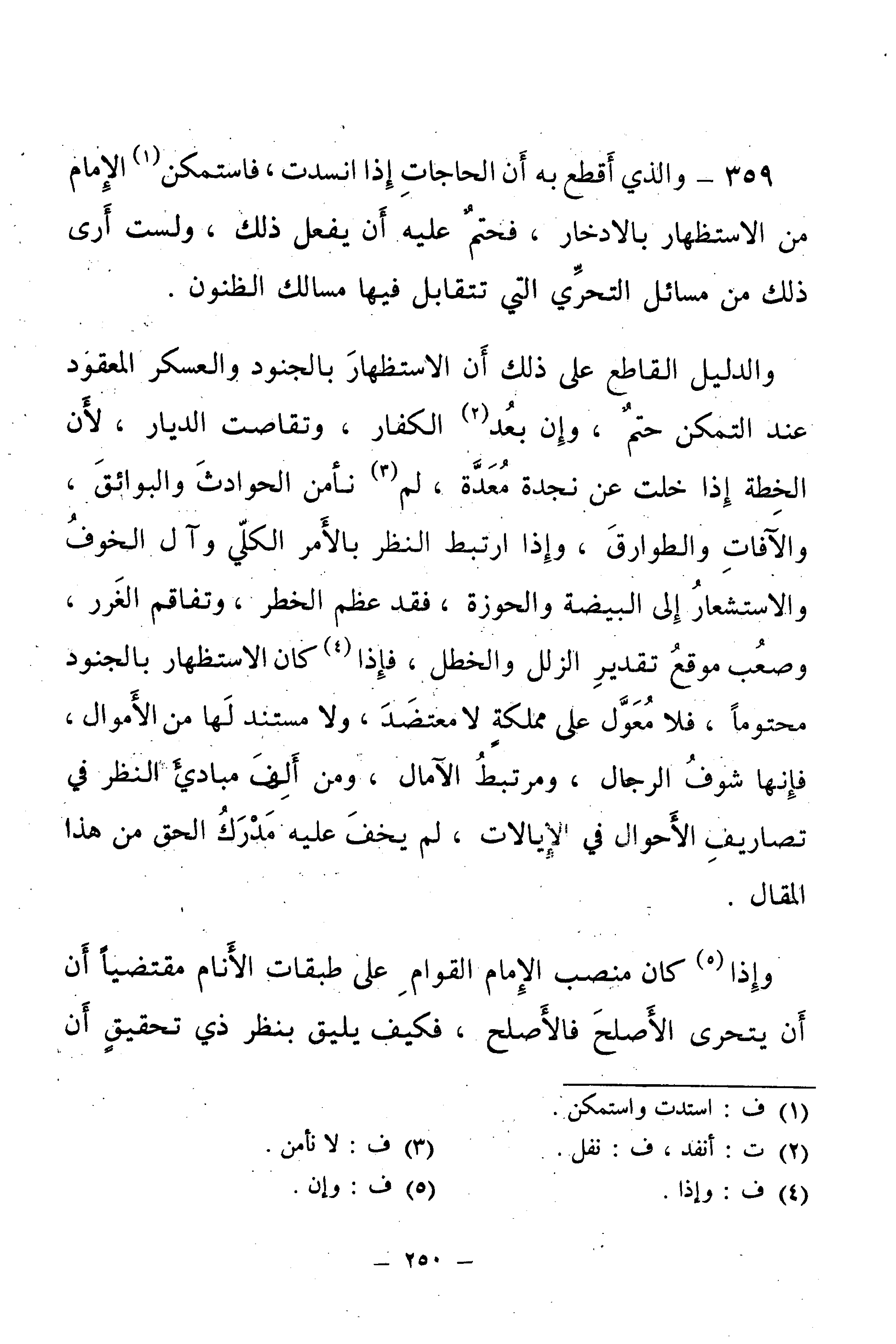 وَالدَّلِيلُ الْقَاطِعُ عَلَى ذَلِكَ أَنَّ الِاسْتِظْهَارَ بِالْجُنُودِ وَالْعَسْكَرِ الْمَعْقُودَ عِنْدَ التَّمَكُّنِ حَتْمٌ، وَإِنْ بَعُدَ الْكُفَّارُ، وَتَقَاصَتِ الدِّيَارُ، لِأَنَّ الْخِطَّةَ إِذَا خَلَتْ عَنْ نَجْدَةٍ مُعَدَّةٍ، لَمْ نَأْمَنِ الْحَوَادِثَ وَالْبَوَائِقَ وَالْآفَاتِ وَالطَّوَارِقَ، وَإِذَا ارْتَبَطَ النَّظَرُ بِالْأَمْرِ الْكُلِّيِّ، وَآلَ الْخَوْفُ وَالِاسْتِشْعَارُ إِلَى الْبَيْضَةِ وَالْحَوْزَةِ، فَقَدْ عَظُمَ الْخَطَرُ، وَتَفَاقَمَ الْغَرَرُ، وَصَعُبَ مَوْقِعُ تَقْدِيرِ الزَّلَلِ وَالْخَطَلِ، وَإِذَا كَانَ الِاسْتِظْهَارُ بِالْجُنُودِ مَحْتُومًا، فَلَا مُعَوَّلَ عَلَى مَمْلَكَةٍ لَا مُعْتَضَدَ، وَلَا مُسْتَنَدَ لَهَا مِنَ الْأَمْوَالِ، فَإِنَّهَا شَوْفُ الرِّجَالِ، وَمُرْتَبَطُ الْآمَالِ، وَمَنْ أَلِفَ مَبَادِئَ النَّظَرِ فِي تَصَارِيفِ الْأَحْوَالِ فِي الْإِيَالَاتِ، لَمْ يَخْفَ عَلَيْهِ مَدْرَكُ الْحَقِّ فِي هَذَا الْمَقَالِ.