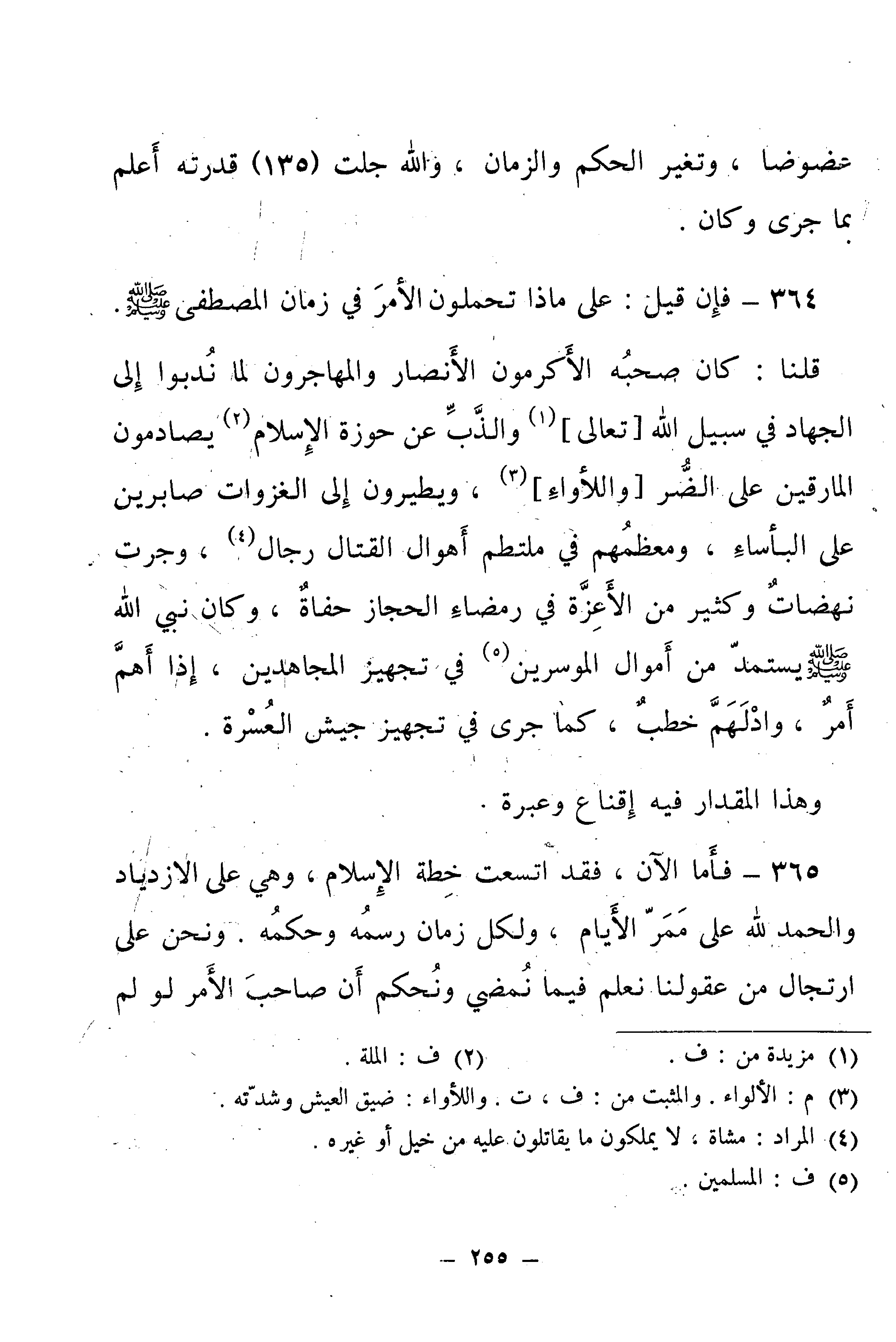 قُلْنَا: كَانَ صَحْبُهُ الْأَكْرَمُونَ الْأَنْصَارُ وَالْمُهَاجِرُونَ لَمَّا نُدِبُوا إِلَى الْجِهَادِ فِي سَبِيلِ اللَّهِ [تَعَالَى] ، وَالذَّبِّ عَنْ حَوْزَةِ الْإِسْلَامِ يُصَادِمُونَ الْمَارِقِينَ عَلَى الضُّرِّ [وَاللَّأْوَاءِ] ، وَيَطِيرُونَ إِلَى الْغَزَوَاتِ صَابِرِينَ عَلَى الْبَأْسَاءِ، وَمُعْظَمُهُمْ فِي مُلْتَطِمِ أَهْوَالِ الْقِتَالِ رِجَالٌ، وَجَرَتْ نَهَضَاتٌ وَكَثِيرٌ مِنَ الْأَعِزَّةِ فِي رَمْضَاءِ الْحِجَازِ حُفَاةٌ، وَكَانَ نَبِيُّ اللَّهِ - صَلَّى اللَّهُ عَلَيْهِ وَسَلَّمَ - يَسْتَمِدُّ مِنْ أَمْوَالِ الْمُوسِرِينَ فِي تَجْهِيزِ الْمُجَاهِدِينَ، إِذَا أَهَمَّ أَمْرٌ، وَادْلَهَمَّ خَطْبٌ، كَمَا جَرَى فِي تَجْهِيزِ جَيْشِ الْعُسْرَةِ.