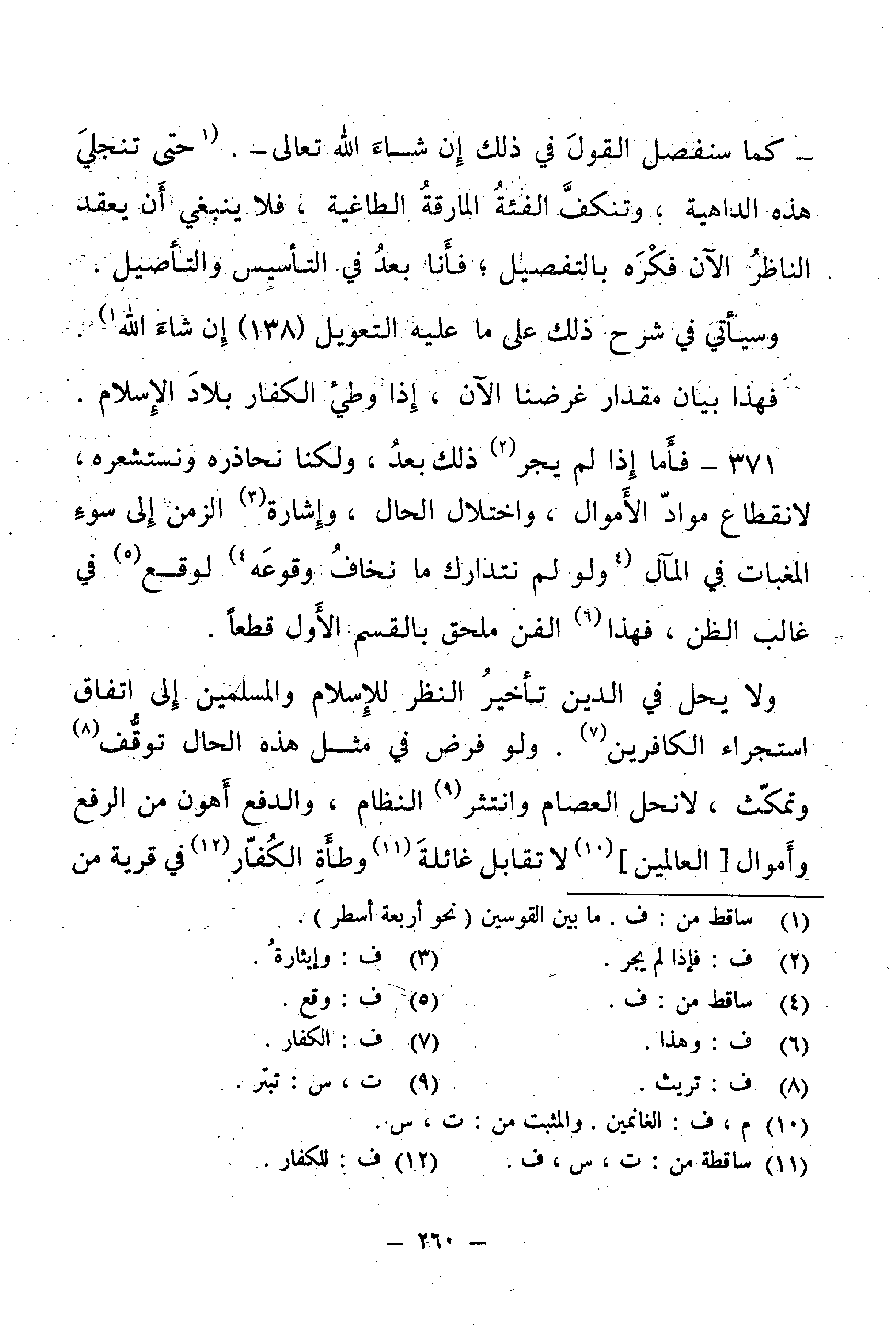 وَلَا يَحِلُّ فِي الدِّينِ تَأْخِيرُ النَّظَرِ لِلْإِسْلَامِ وَالْمُسْلِمِينَ إِلَى اتِّفَاقِ اسْتِجْرَاءِ الْكَافِرِينَ. وَلَوْ فُرِضَ فِي مِثْلِ هَذَا الْحَالِ تَوَقُّفٌ وَتَمَكُّثٌ، لَانْحَلَّ الْعِصَامُ وَانْتَثَرَ النِّظَامُ، وَالدَّفْعُ أَهْوَنُ مِنَ الرَّفْعِ وَأَمْوَالُ [الْعَالَمِينَ] لَا تُقَابِلُ غَائِلَةَ وَطْأَةِ الْكُفَّارِ فِي قَرْيَةٍ مِنْ