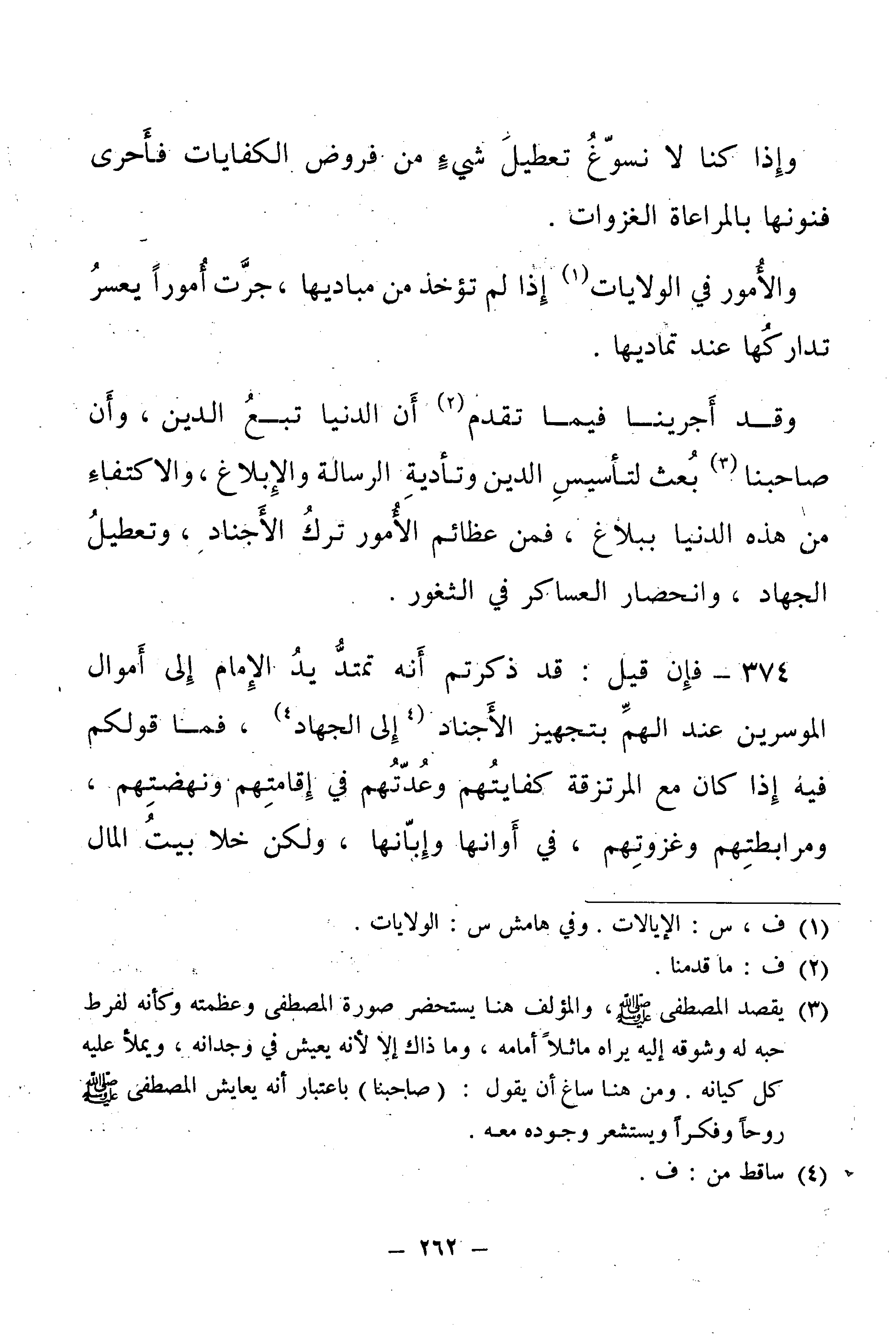 وَقَدْ أَجْرَيْنَا فِيمَا تَقَدَّمَ أَنَّ الدُّنْيَا تَبَعُ الدِّينِ، وَأَنَّ صَاحِبَنَا بُعِثَ لِتَأْسِيسِ الدِّينِ، وَتَأْدِيَةِ الرِّسَالَةِ، وَالْإِبْلَاغِ وَالِاكْتِفَاءِ مِنْ هَذِهِ الدُّنْيَا بِبَلَاغٍ، فَمِنْ عَظَائِمِ الْأُمُورِ تَرْكُ الْأَجْنَادِ، وَتَعْطِيلُ الْجِهَادِ، وَانْحِصَارُ الْعَسَاكِرِ فِي الثُّغُورِ.