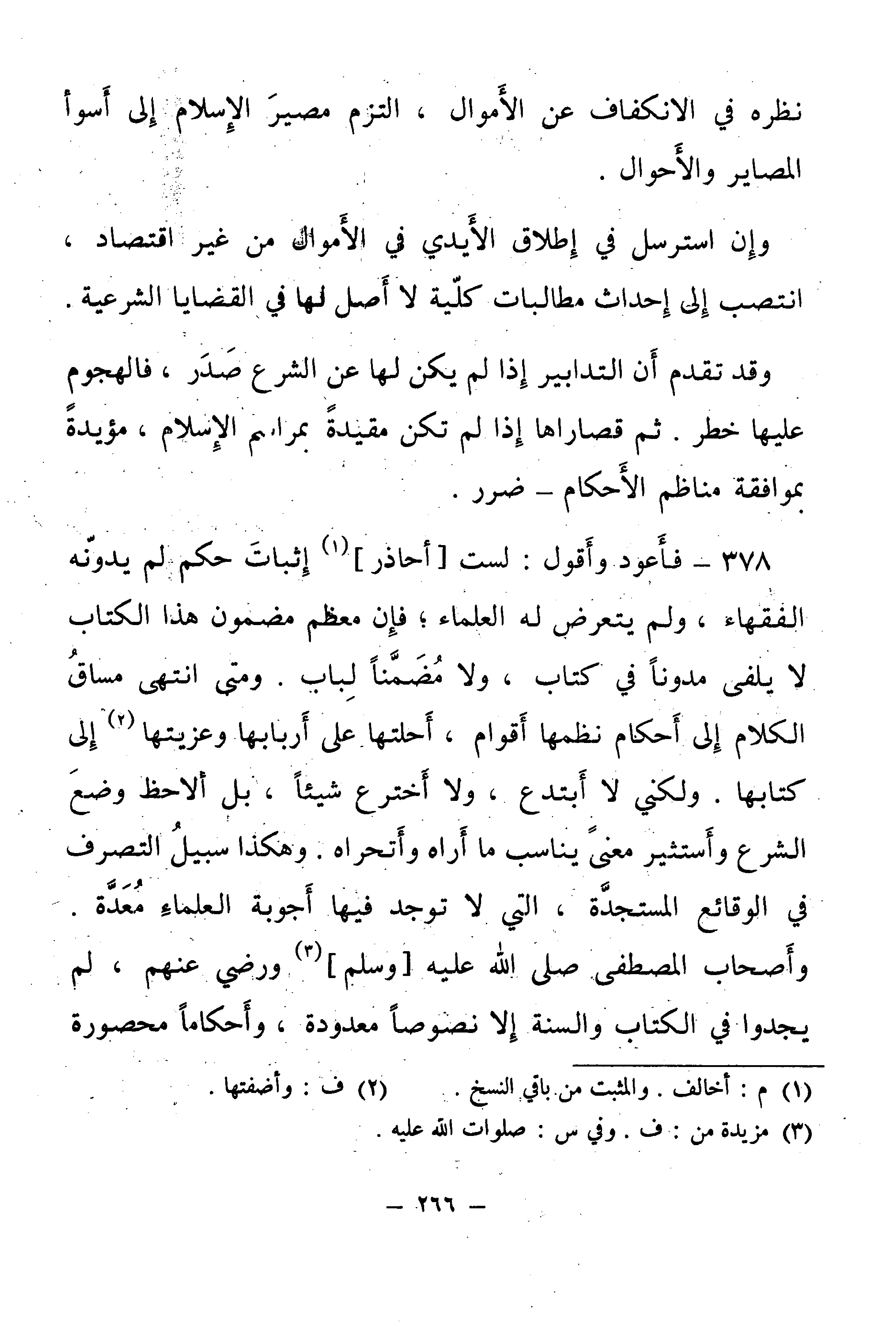 378 - فَأَعُودُ وَأَقُولُ: لَسْتُ [أُحَاذِرُ] إِثْبَاتَ حُكْمٍ لَمْ يُدَوِّنْهُ الْفُقَهَاءُ، وَلَمْ يَتَعَرَّضْ لَهُ الْعُلَمَاءُ، فَإِنَّ مُعْظَمَ مَضْمُونِ هَذَا الْكِتَابِ لَا يُلْفَى مُدَوَّنًا فِي كِتَابٍ، وَلَا مُضَمَّنًا لِبَابٍ.