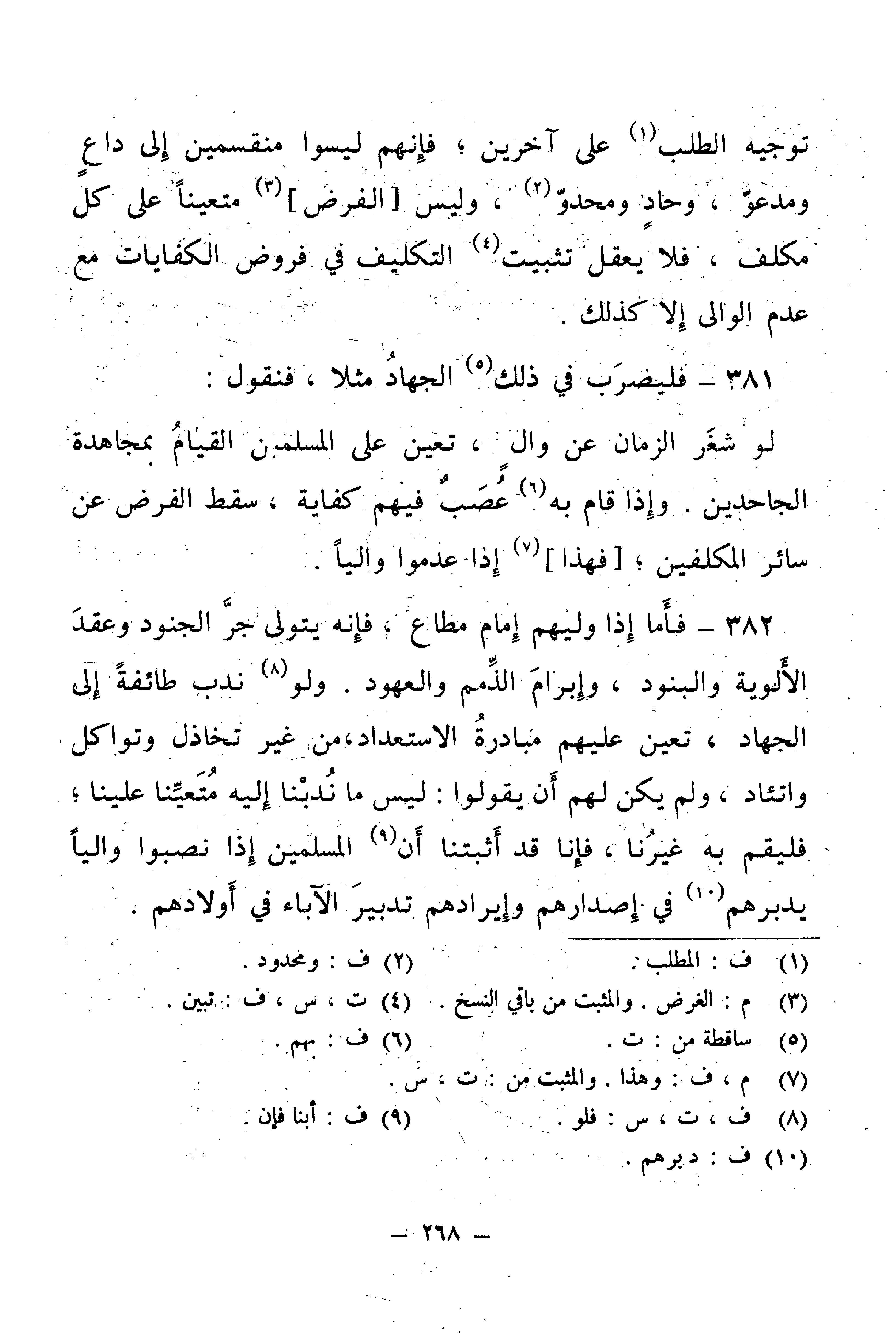 تَوْجِيهُ الطَّلَبِ عَلَى آخَرِينَ فَإِنَّهُمْ لَيْسُوا مُنْقَسِمِينَ إِلَى دَاعٍ وَمَدْعُوٍّ، وَحَادٍ وَمَحْدُوٍّ، وَلَيْسَ [الْفَرْضُ] مُتَعَيِّنًا عَلَى كُلِّ مُكَلَّفٍ، فَلَا يُعْقَلُ تَثْبِيتُ التَّكْلِيفِ فِي فُرُوضِ الْكِفَايَاتِ مَعَ عَدَمِ الْوَالِي إِلَّا كَذَلِكَ.