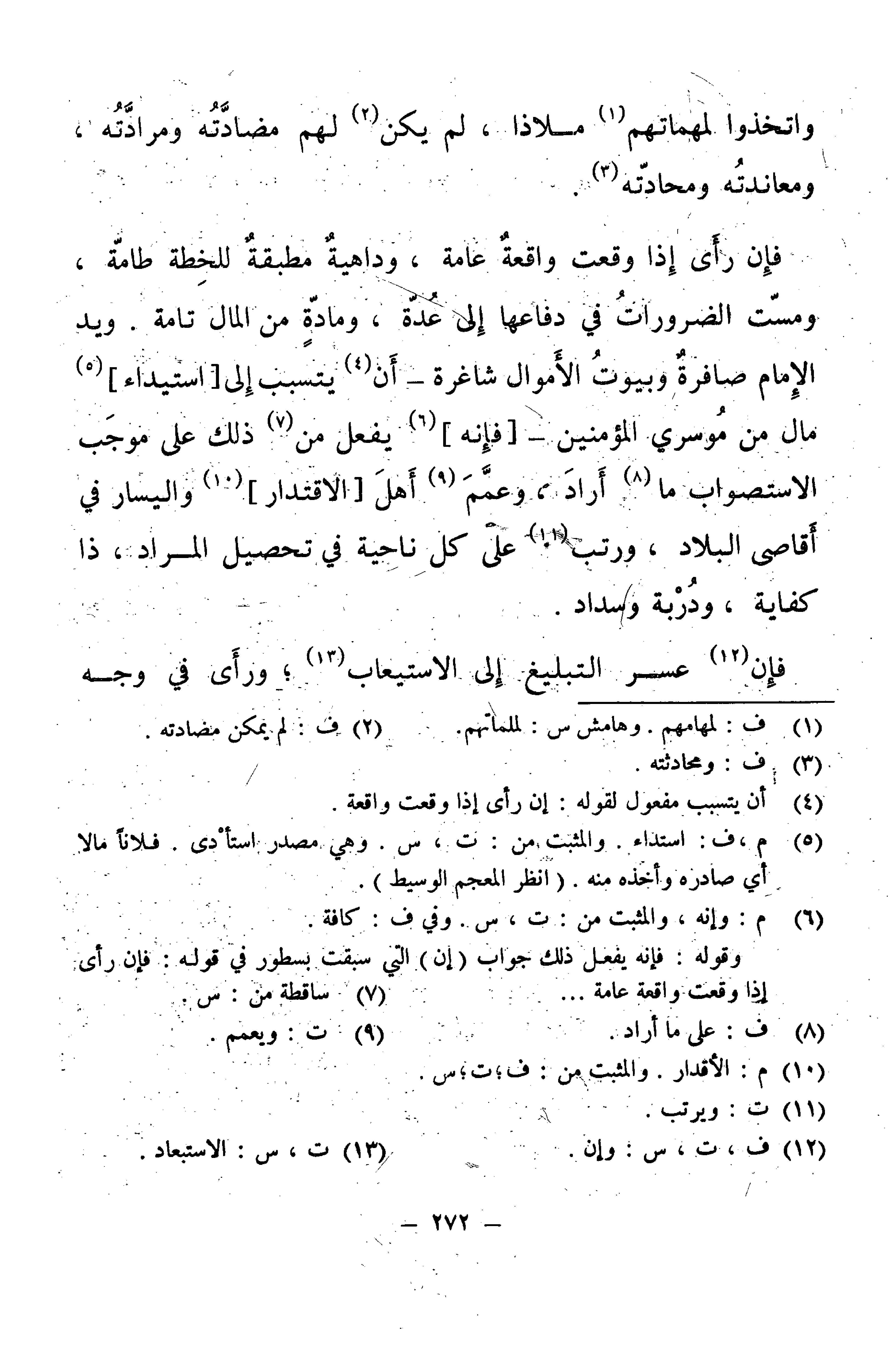 فَإِنْ رَأَى إِذَا وَقَعَتْ وَاقِعَةٌ عَامَّةٌ، وَدَاهِيَةٌ مُطْبِقَةٌ لِلْخُطَّةِ طَامَّةٌ، وَمَسَّتِ الضَّرُورَاتُ فِي دِفَاعِهَا إِلَى عُدَّةٍ، وَمَادَّةٍ مِنَ الْمَالِ تَامَّةٍ.