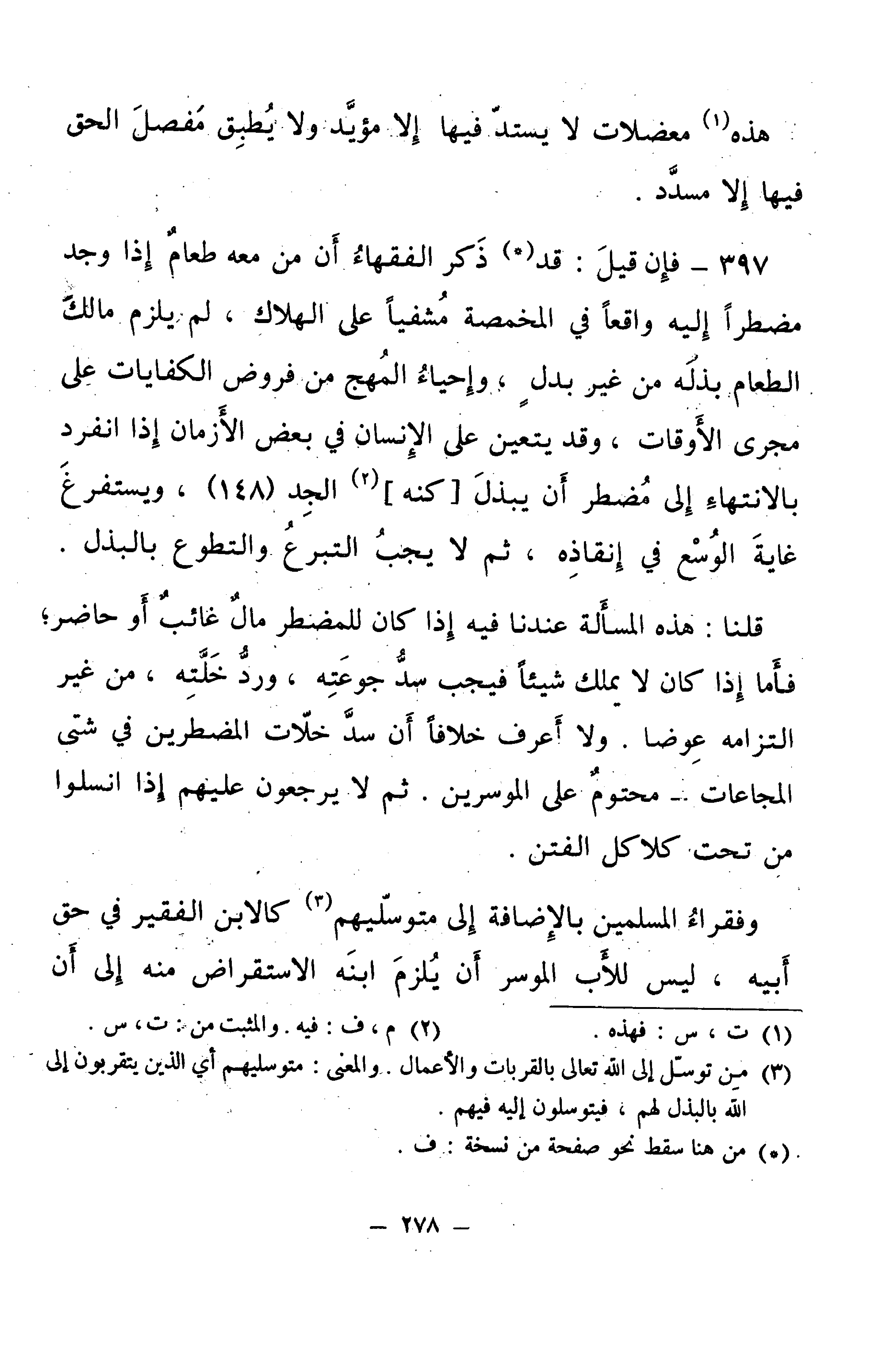 397 - فَإِنْ قِيلَ: قَدْ ذَكَرَ الْفُقَهَاءُ أَنَّ مَنْ مَعَهُ طَعَامٌ إِذَا وَجَدَ مُضْطَرًّا إِلَيْهِ وَاقِعًا فِي الْمَخْمَصَةِ، مُشْفِيًا عَلَى الْهَلَاكِ، لَمْ يَلْزَمْ مَالِكَ الطَّعَامِ بَذْلُهُ مِنْ غَيْرِ بَدَلٍ، وَإِحْيَاءُ الْمُهَجِ مِنْ فُرُوضِ الْكِفَايَاتِ عَلَى مَجْرَى الْأَوْقَاتِ، وَقَدْ يَتَعَيَّنُ عَلَى الْإِنْسَانِ فِي بَعْضِ الْأَزْمَانِ إِذَا انْفَرَدَ بِالِانْتِهَاءِ إِلَى مُضْطَرٍّ أَنْ يَبْذُلَ [كُنْهَ] الْجِدِّ (148) وَيَسْتَفْرِغُ غَايَةَ الْوُسْعِ فِي إِنْقَاذِهِ، ثُمَّ لَا يَجِبُ التَّبَرُّعُ وَالتَّطَوُّعُ بِالْبَذْلِ.