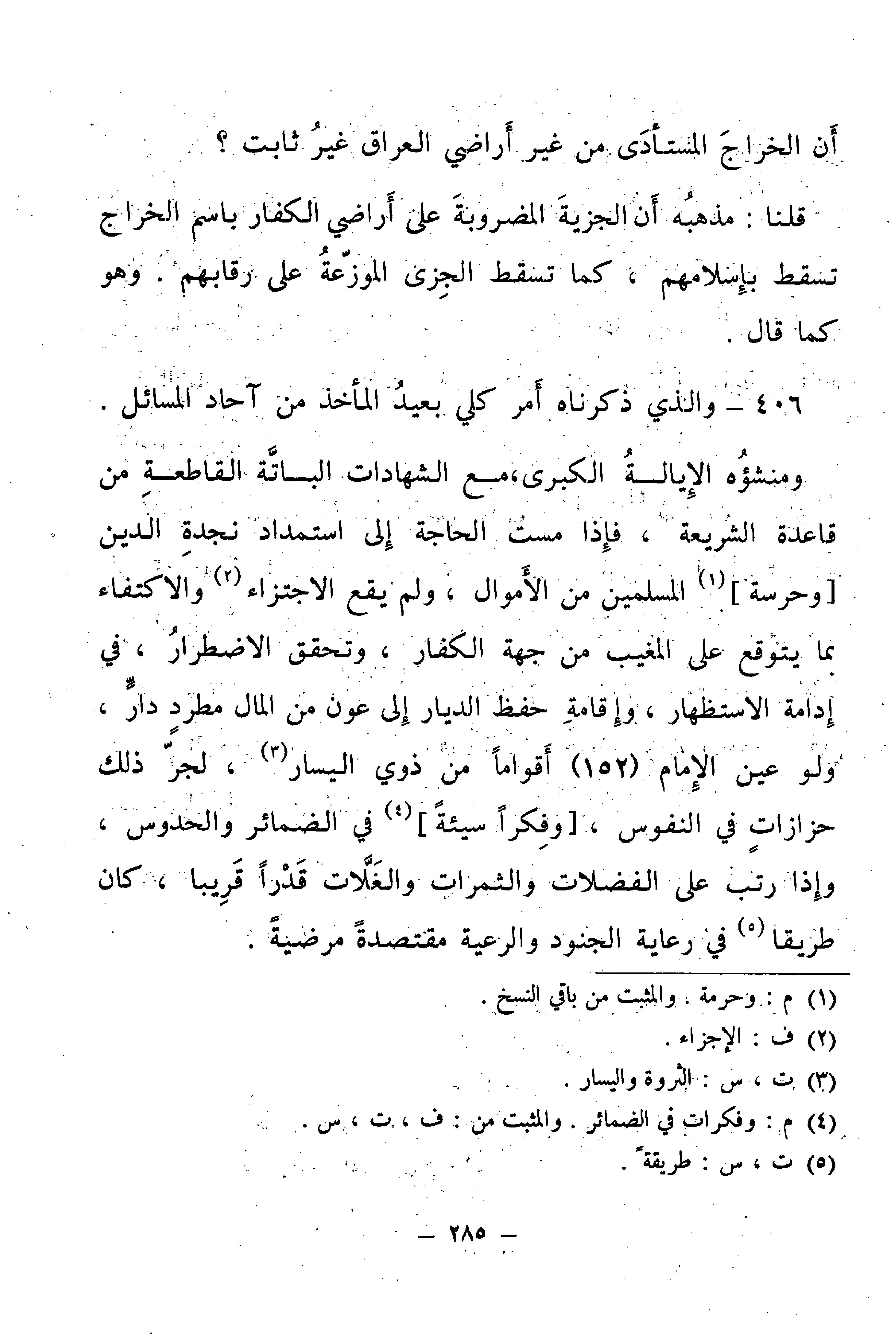 406 - وَالَّذِي ذَكَرْنَاهُ أَمْرٌ كُلِّيٌّ بَعِيدُ الْمَأْخَذِ مِنْ آحَادِ الْمَسَائِلِ. وَمَنْشَؤُهُ الْإِيَالَةُ الْكُبْرَى، مَعَ الشَّهَادَاتِ الْبَاتَّةِ الْقَاطِعَةِ مِنْ قَاعِدَةِ الشَّرِيعَةِ، فَإِذَا مَسَّتِ الْحَاجَةُ إِلَى اسْتِمْدَادِ نَجْدَةِ الدِّينِ [وَحِرْسَةِ] الْمُسْلِمِينَ مِنَ الْأَمْوَالِ، وَلَمْ يَقَعِ الِاجْتِزَاءُ وَالِاكْتِفَاءُ بِمَا يَتَوَقَّعُ عَلَى الْمَغِيبِ مِنْ جِهَةِ الْكُفَّارِ، وَتَحَقُّقِ الِاضْطِرَارِ، فِي إِدَامَةِ الِاسْتِظْهَارِ، وَإِقَامَةِ حِفْظِ الدِّيَارِ إِلَى عَوْنٍ مِنَ الْمَالِ مُطَّرِدٍ دَارٍّ، وَلَوْ عَيَّنَ الْإِمَامُ (152) أَقْوَامًا مِنْ ذَوِي الْيَسَارِ، لَجَرَّ ذَلِكَ حَزَازَاتٍ فِي النُّفُوسِ، [وَفِكَرًا سَيِّئَةً] فِي الضَّمَائِرِ وَالْحُدُوسِ، وَإِذَا رَتَّبَ عَلَى الْفَضَلَاتِ وَالثَّمَرَاتِ وَالْغَلَّاتِ قَدْرًا قَرِيبًا كَانَ طَرِيقًا فِي رِعَايَةِ الْجُنُودِ وَالرَّعِيَّةِ مُقْتَصِدَةً مَرْضِيَّةً.