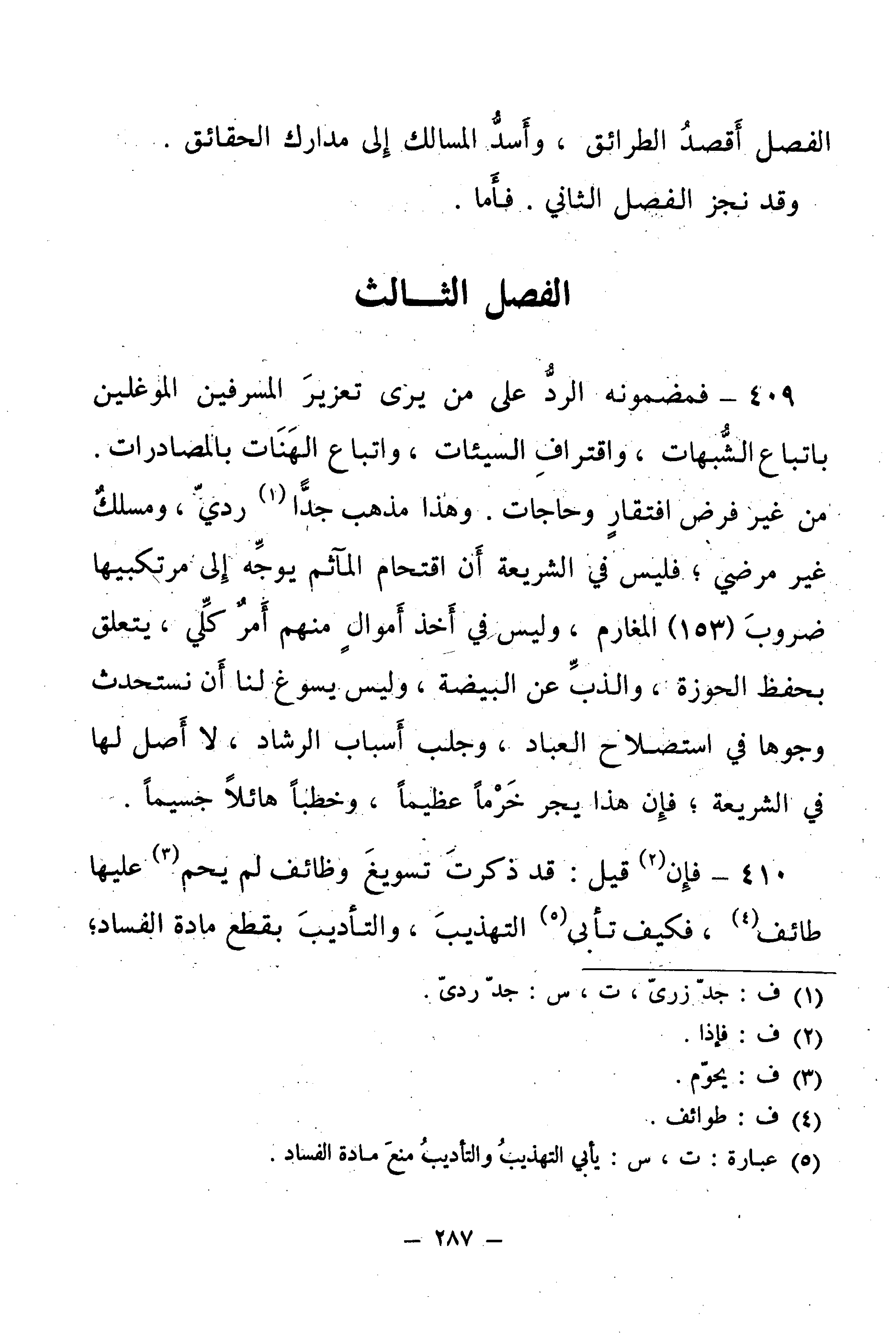 410 - فَإِنْ قِيلَ: قَدْ ذَكَرْتَ تَسْوِيغَ وَظَائِفَ لَمْ يَحُمْ عَلَيْهَا طَائِفٌ، فَكَيْفَ تَأْبَى التَّهْذِيبَ وَالتَّأْدِيبَ بِقَطْعِ مَادَّةِ الْفَسَادِ