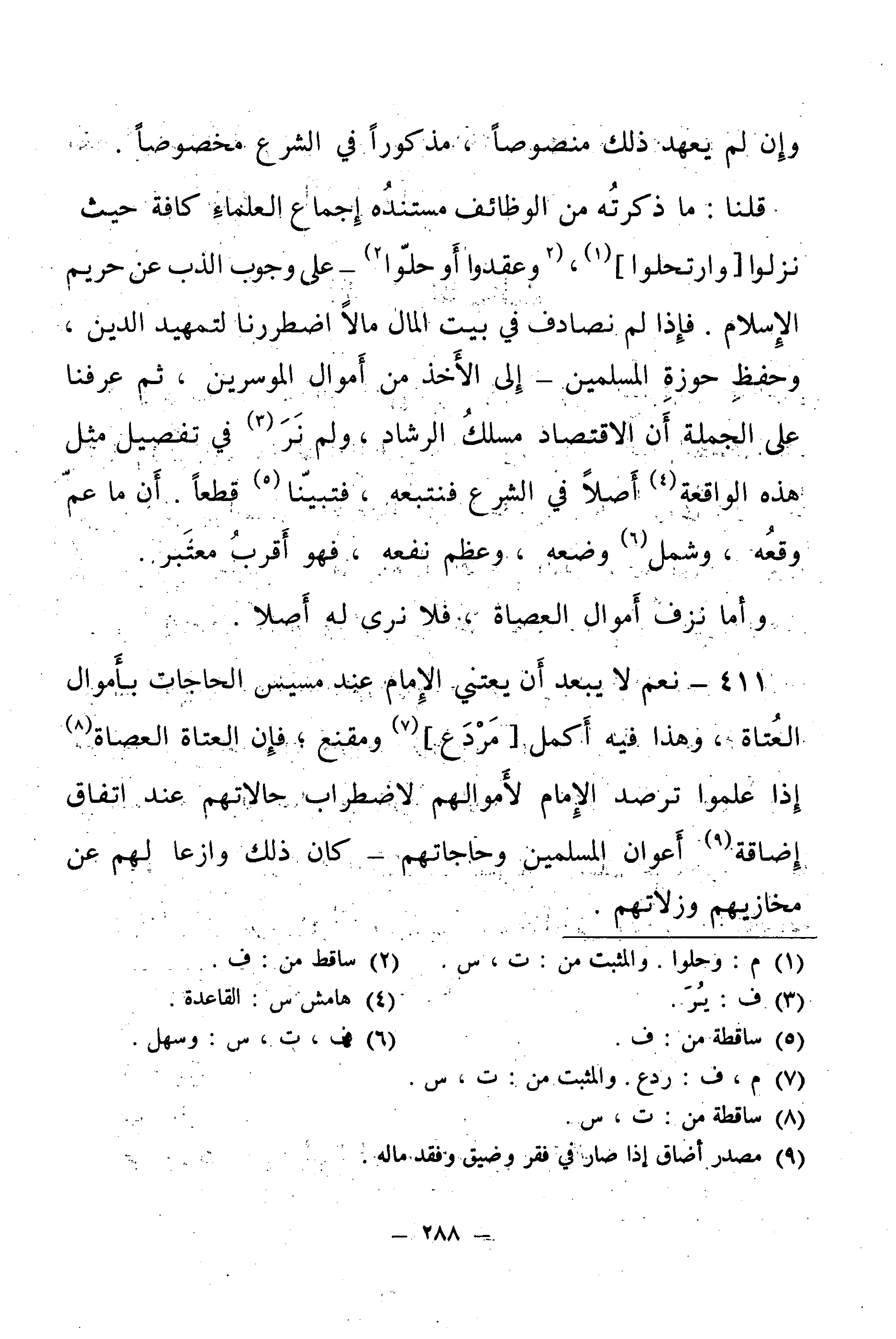 411 - نَعَمْ لَا يَبْعُدُ أَنْ يَعْتَنِيَ الْإِمَامُ عِنْدَ مَسِيسِ الْحَاجَاتِ بِأَمْوَالِ الْعُتَاةِ، وَهَذَا فِيهِ أَكْمَلُ مَرْدَعٍ وَمَقْنَعٍ، فَإِنَّ الْعُتَاةَ الْعُصَاةَ إِذَا عَلِمُوا تَرَصُّدَ الْإِمَامِ لِأَمْوَالِهِمْ لِاضْطِرَابِ حَالَاتِهِمْ عِنْدَ اتِّفَاقِ إِضَافَةِ أَعْوَانِ الْمُسْلِمِينَ وَحَاجَاتِهِمْ - كَانَ ذَلِكَ وَازِعًا لَهُمْ عَنْ مَخَازِيهِمْ وَزَلَّاتِهِمْ.