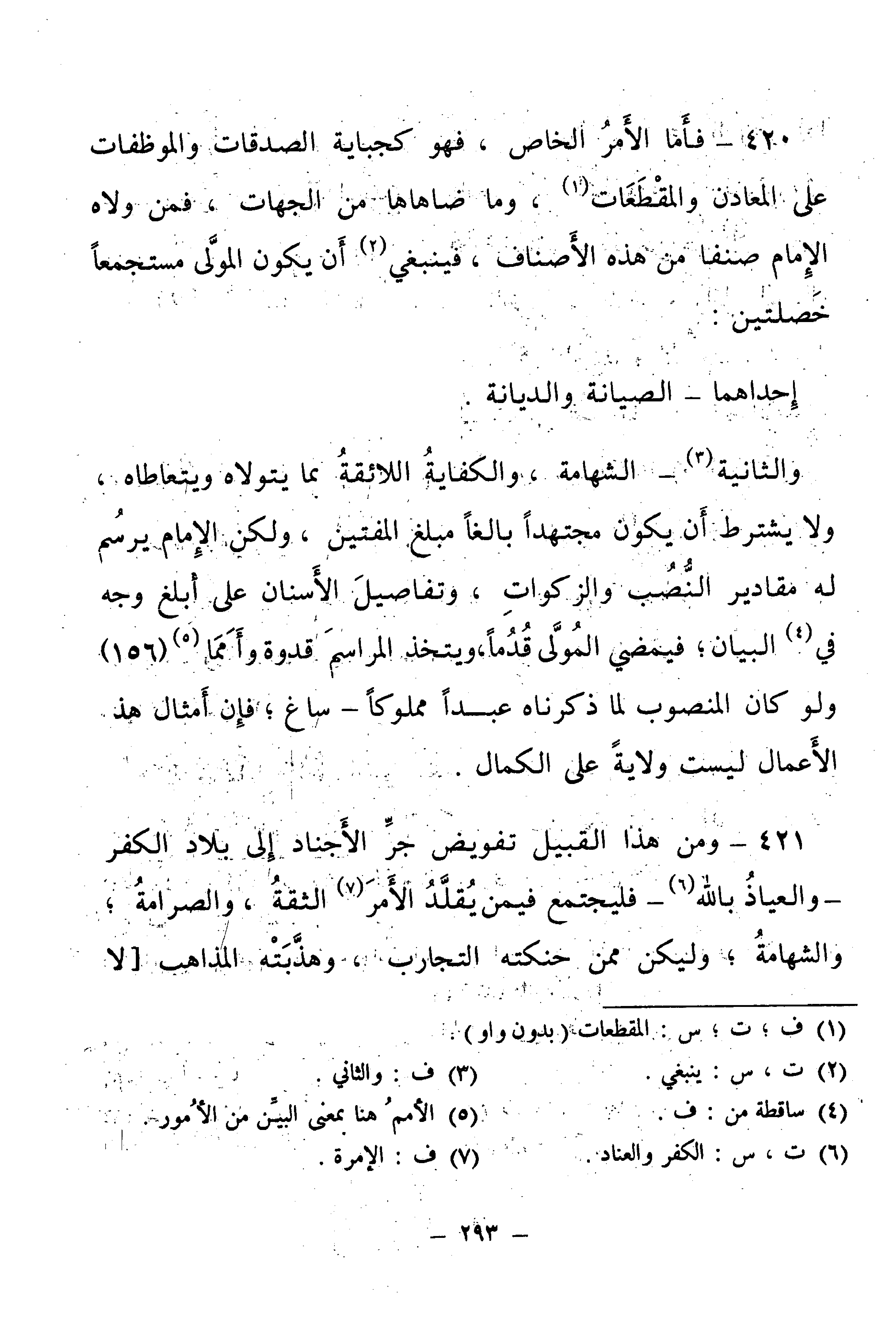 420 - فَأَمَّا الْأَمْرُ الْخَاصُّ، فَهُوَ كَجِبَايَةِ الصَّدَقَاتِ وَالْمُوَظَّفَاتِ عَلَى الْمَعَادِنِ وَالْمَقْطَعَاتِ، وَمَا ضَاهَاهَا مِنَ الْجِهَاتِ، فَمَنْ وَلَّاهُ الْإِمَامُ صِنْفًا مِنْ هَذِهِ الْأَصْنَافِ، يَنْبَغِي أَنْ يَكُونَ الْمُوَلَّى مُسْتَجْمِعًا خَصْلَتَيْنِ: