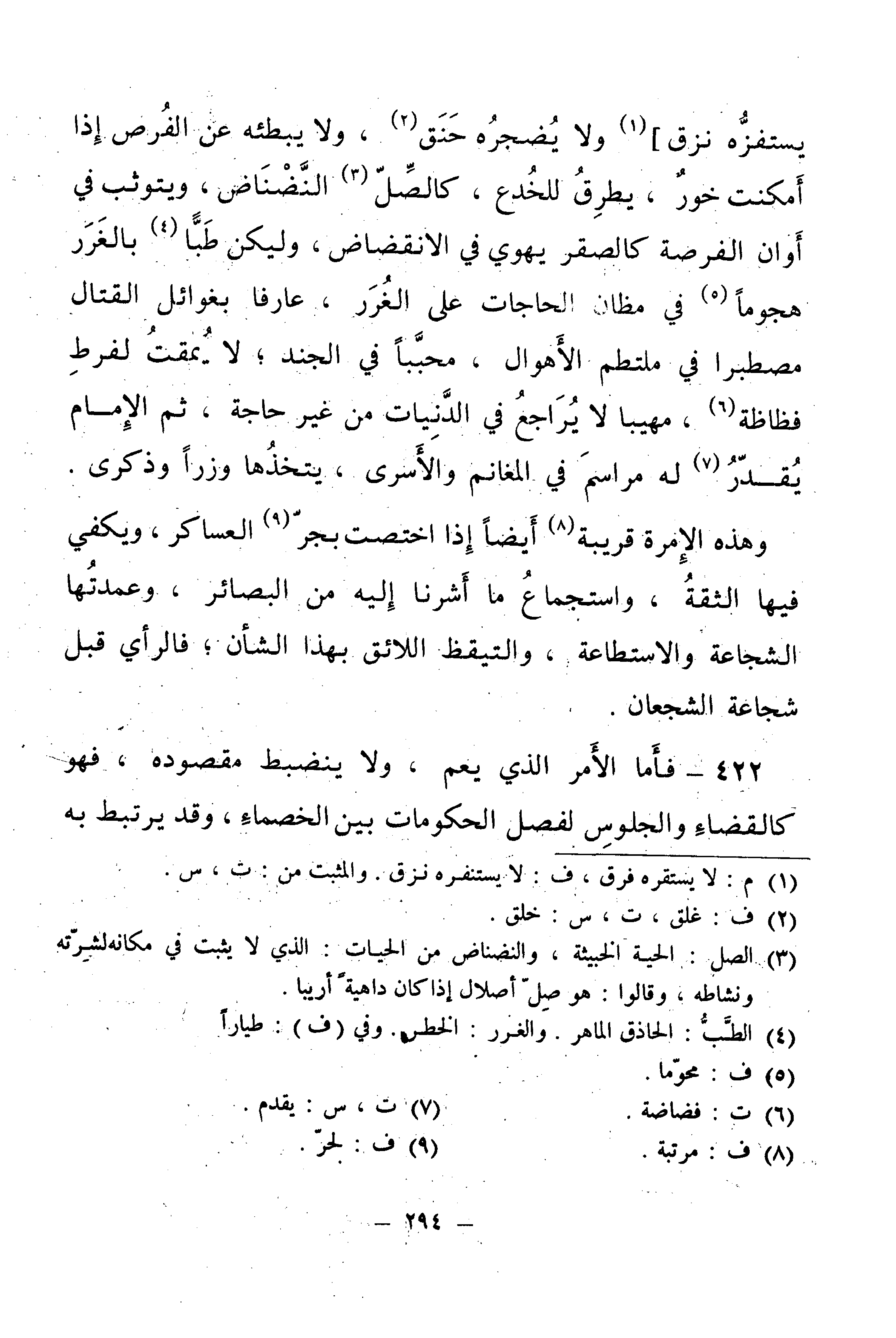 يَسْتَفِزُّهُ نَزَقٌ] وَلَا يُضْجِرُهُ حَنَقٌ، وَلَا يُبْطِئُهُ عَنِ الْفُرَصِ إِذَا أَمْكَنَتْ خَوَرٌ، بِطُرُقٍ لِلْخُدَعِ، كَالصُّلِّ النَّضْنَاضِ، وَيَتَوَثَّبُ فِي أَوَانِ الْفُرْصَةِ كَالصَّقْرِ يَهْوِي فِي الِانْقِضَاضِ، وَلْيَكُنْ طَبًّا بِالْغَرَرِ هُجُومًا فِي مَظَانِّ الْحَاجَاتِ عَلَى الْغُرَرِ.