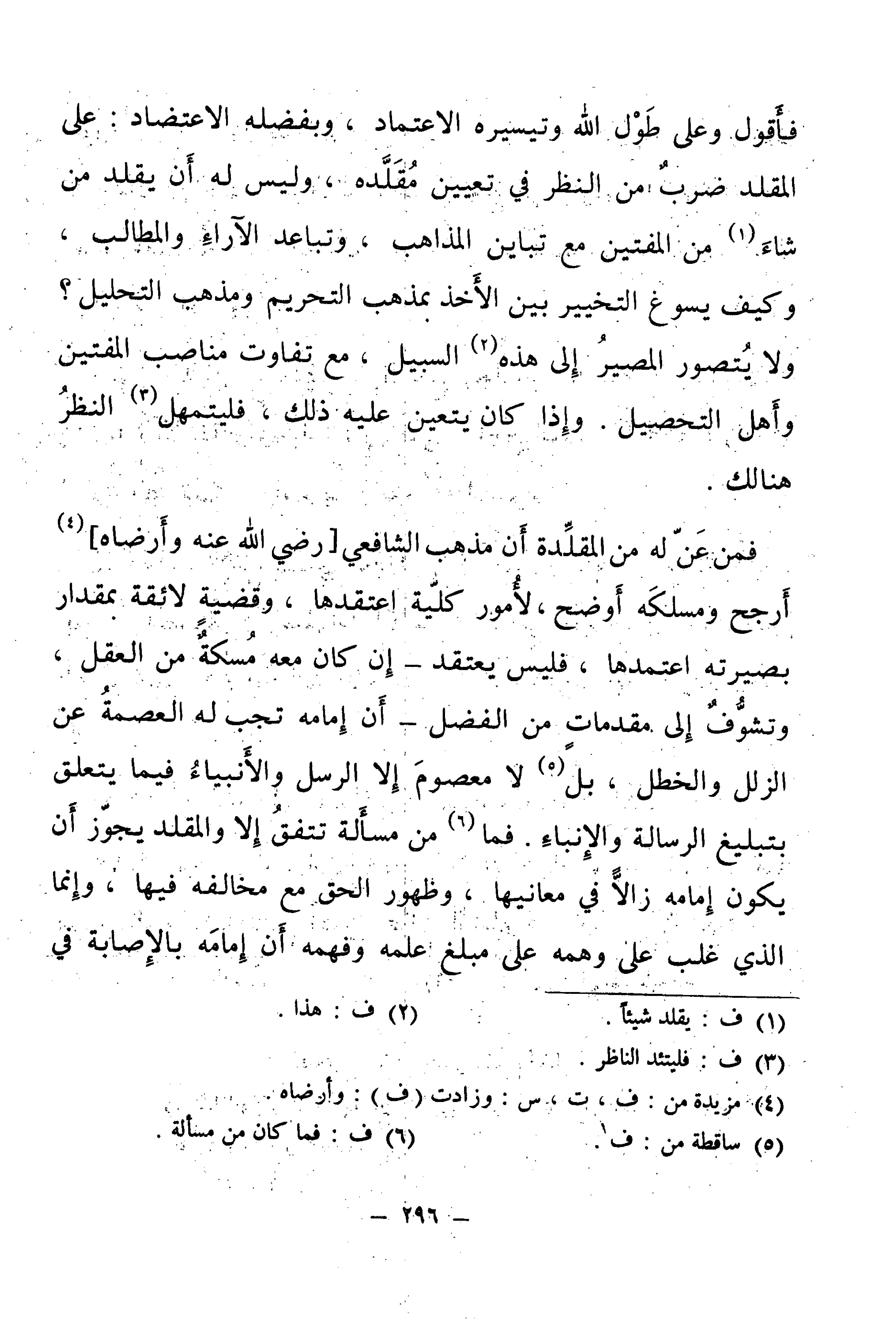 فَمَنْ عَنَّ لَهُ مِنَ الْمُقَلِّدَةِ أَنَّ مَذْهَبَ الشَّافِعِيِّ -[رَضِيَ اللَّهُ عَنْهُ وَأَرْضَاهُ]- أَرْجَحُ، وَمَسْلَكُهُ أَوْضَحُ، لِأُمُورٍ كُلِّيَّةٍ اعْتَقَدَهَا، وَقَضِيَّةٍ لَائِقَةٍ بِمِقْدَارِ بَصِيرَتِهِ اعْتَمَدَهَا، فَلَيْسَ يَعْتَقِدُ - إِنْ كَانَ مَعَهُ مَسْكَةٌ مِنَ الْعَقْلِ، وَتَشَوُّفٌ إِلَى مُقَدِّمَاتٍ مِنَ الْفَضْلِ - أَنَّ إِمَامَهُ تَجِبُ لَهُ الْعِصْمَةُ عَنِ الزَّلَلِ وَالْخَطَلِ، بَلْ لَا مَعْصُومَ إِلَّا الرُّسُلُ وَالْأَنْبِيَاءُ فِيمَا يَتَعَلَّقُ بِتَبْلِيغِ الرِّسَالَةِ وَالْإِنْبَاءِ.