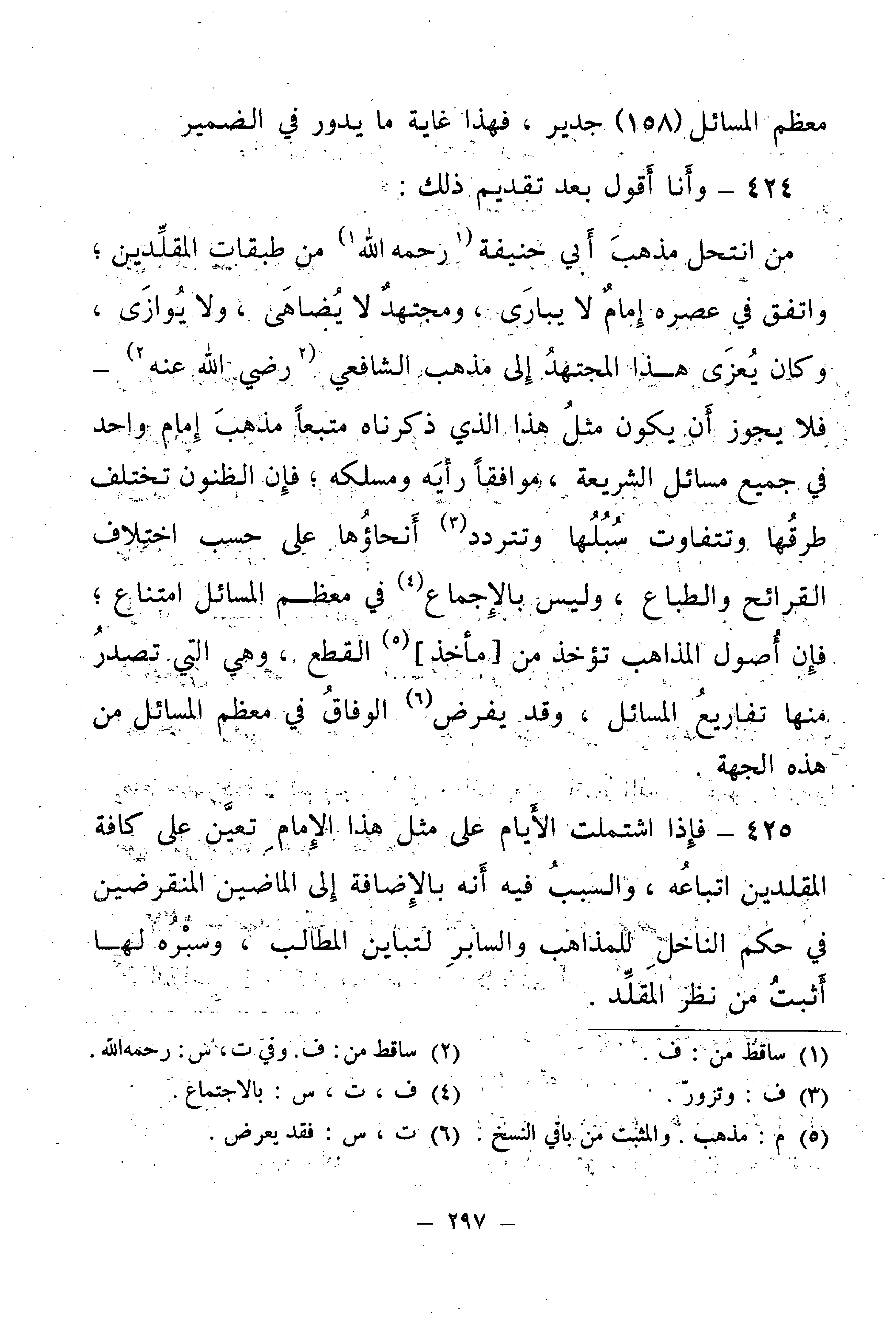 425 - فَإِذَا اشْتَمَلَتِ الْأَيَّامُ عَلَى مِثْلِ هَذَا الْإِمَامِ تَعَيَّنَ عَلَى كَافَّةِ الْمُقَلِّدِينَ اتِّبَاعُهُ، وَالسَّبَبُ فِيهِ أَنَّهُ بِالْإِضَافَةِ إِلَى الْمَاضِينَ الْمُنْقَرِضِينَ فِي حُكْمِ النَّاخِلِ لِلْمَذَاهِبِ، وَالسَّابِرِ لِتَبَايُنِ الْمُطَالِبِ، وَسَبْرُهُ لَهَا أَثْبَتُ مِنْ نَظَرِ الْمُقَلِّدِ.
