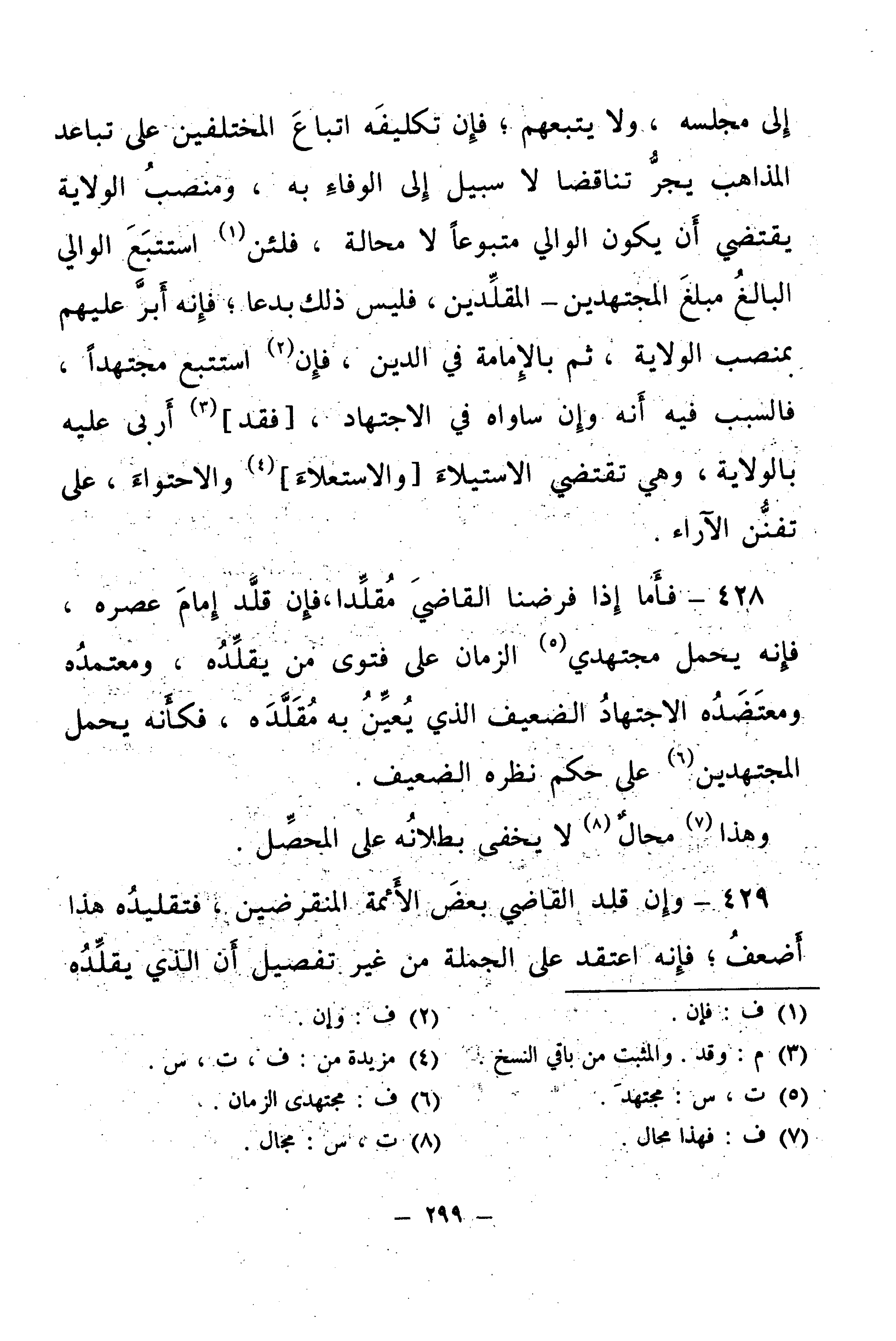 428 - فَأَمَّا إِذَا فَرَضْنَا الْقَاضِي مُقَلِّدًا، فَإِنْ قَلَّدَ إِمَامَ عَصْرِهِ، فَإِنَّهُ يَحْمِلُ مُجْتَهِدِي الزَّمَانِ عَلَى فَتْوَى مَنْ يُقَلِّدُهُ، وَمُعْتَمَدُهُ وَمُعْتَضَدُهُ الِاجْتِهَادُ الضَّعِيفُ الَّذِي يُعِينُ بِهِ مُقَلِّدَهُ، فَكَأَنَّهُ يَحْمِلُ الْمُجْتَهِدِينَ عَلَى حُكْمِ نَظَرِهِ الضَّعِيفِ.