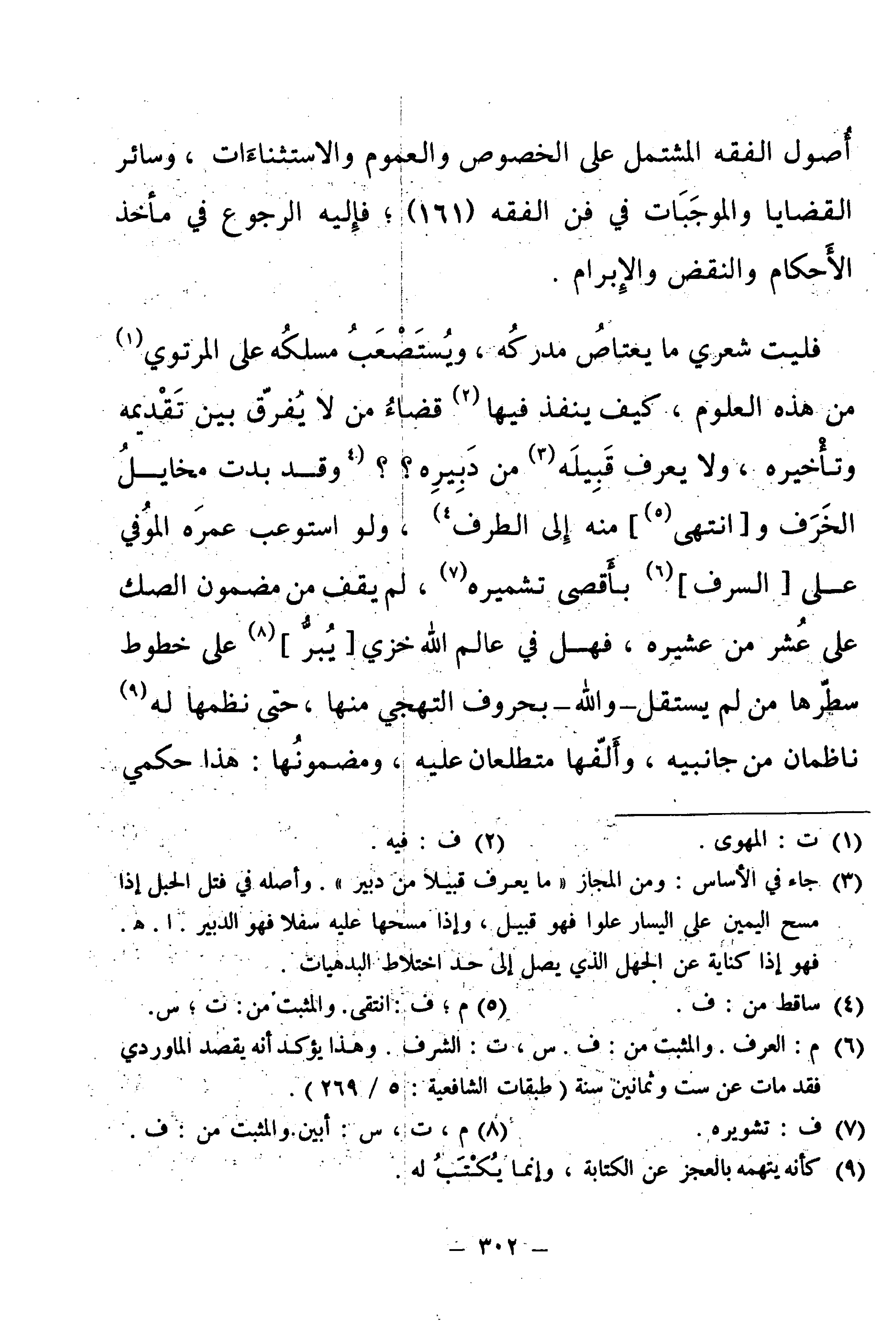 أُصُولِ الْفِقْهِ الْمُشْتَمِلِ عَلَى الْخُصُوصِ وَالْعُمُومِ وَالِاسْتِثْنَاءَاتِ، وَسَائِرِ الْقَضَايَا وَالْمُوجِبَاتِ فِي فَنِّ الْفِقْهِ (161) فَإِلَيْهِ الرُّجُوعُ فِي مَآخِذِ الْأَحْكَامِ وَالنَّقْضِ وَالْإِبْرَامِ.