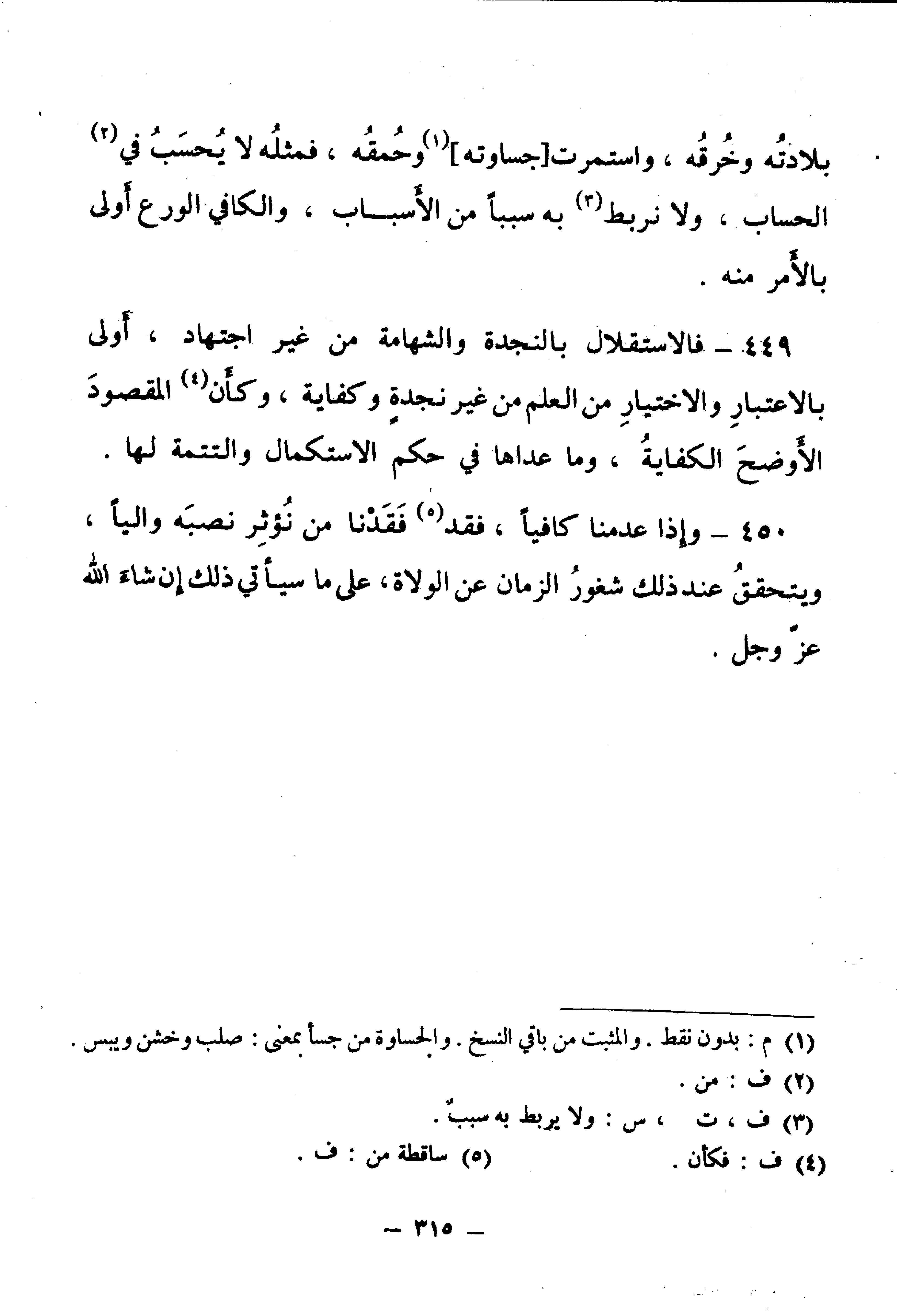 449 - فَالِاسْتِقْلَالُ بِالنَّجْدَةِ وَالشَّهَامَةِ مِنْ غَيْرِ اجْتِهَادٍ، أَوْلَى بِالِاعْتِبَارِ وَالِاخْتِيَارِ مِنَ الْعِلْمِ مِنْ غَيْرِ نَجْدَةٍ وَكِفَايَةٍ، وَكَأَنَّ الْمَقْصُودَ الْأَوْضَحَ الْكِفَايَةُ، وَمَا عَدَاهَا فِي حُكْمِ الِاسْتِكْمَالِ وَالتَّتِمَّةِ لَهَا.
