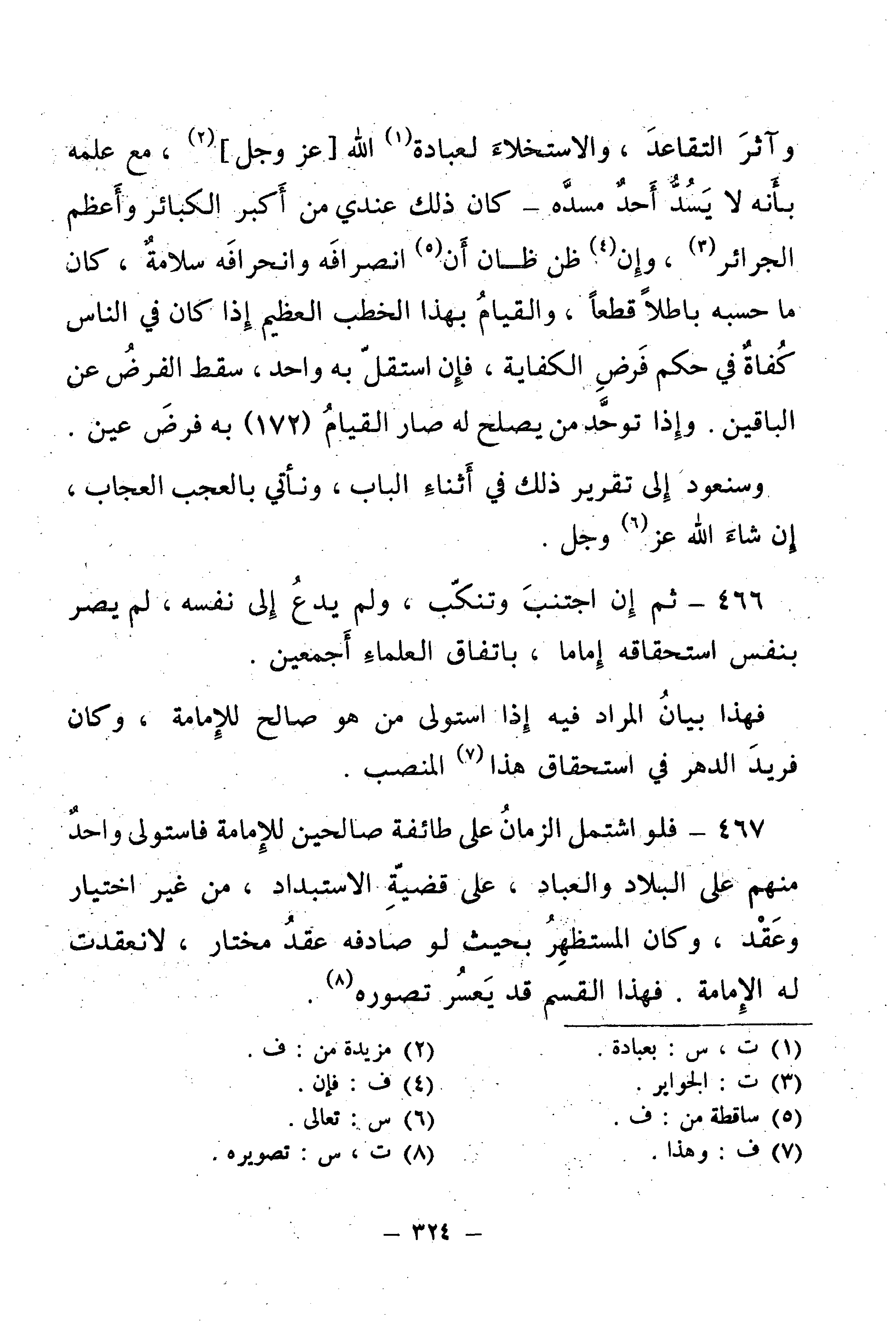 وَآثَرَ التَّقَاعُدَ، وَالِاسْتِخْلَاءَ لِعِبَادَةِ اللَّهِ [عَزَّ وَجَلَّ] مَعَ عِلْمِهِ بِأَنَّهُ لَا يَسُدُّ أَحَدٌ مَسَدَّهُ - كَانَ ذَلِكَ عِنْدِي مِنْ أَكْبَرِ الْكَبَائِرِ، وَأَعْظَمِ الْجَرَائِرِ، وَإِنْ ظَنَّ ظَانٌّ أَنَّ انْصِرَافَهُ وَانْحِرَافَهُ سَلَامَةٌ، كَانَ مَا حَسِبَهُ بَاطِلًا قَطْعًا، وَالْقِيَامُ بِهَذَا الْخَطْبِ الْعَظِيمِ إِذَا كَانَ فِي النَّاسِ كُفَاةٌ فِي حُكْمِ فَرْضِ الْكِفَايَةِ، فَإِذَا اسْتَقَلَّ بِهِ وَاحِدٌ، سَقَطَ الْفَرْضُ عَنِ الْبَاقِينَ.