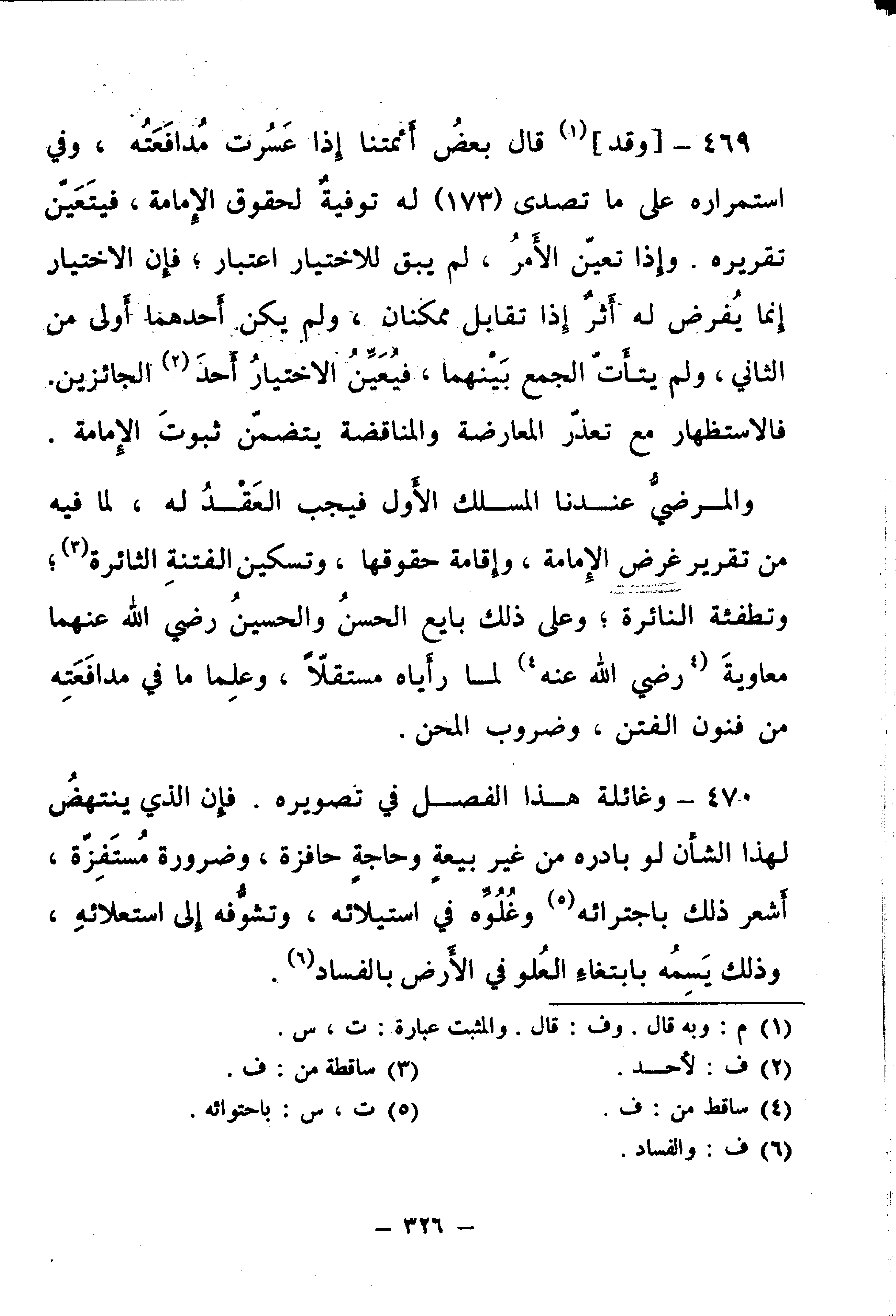 470 - وَغَائِلَةُ هَذَا الْفَصْلِ فِي تَصْوِيرِهِ، فَإِنَّ الَّذِي يَنْتَهِضُ لِهَذَا الشَّأْنِ لَوْ بَادَرَهُ مِنْ غَيْرِ بَيْعَةٍ وَحَاجَةٍ حَافِزَةٍ، وَضَرُورَةٍ مُسْتَفِزَّةٍ، أَشْعَرَ ذَلِكَ بِاجْتِرَائِهِ، وَغُلُوِّهِ فِي اسْتِيلَائِهِ، وَتَشَوُّفِهِ إِلَى اسْتِعْلَائِهِ، وَذَلِكَ يَسِمُهُ بِابْتِغَاءِ الْعُلُوِّ فِي الْأَرْضِ بِالْفَسَادِ.