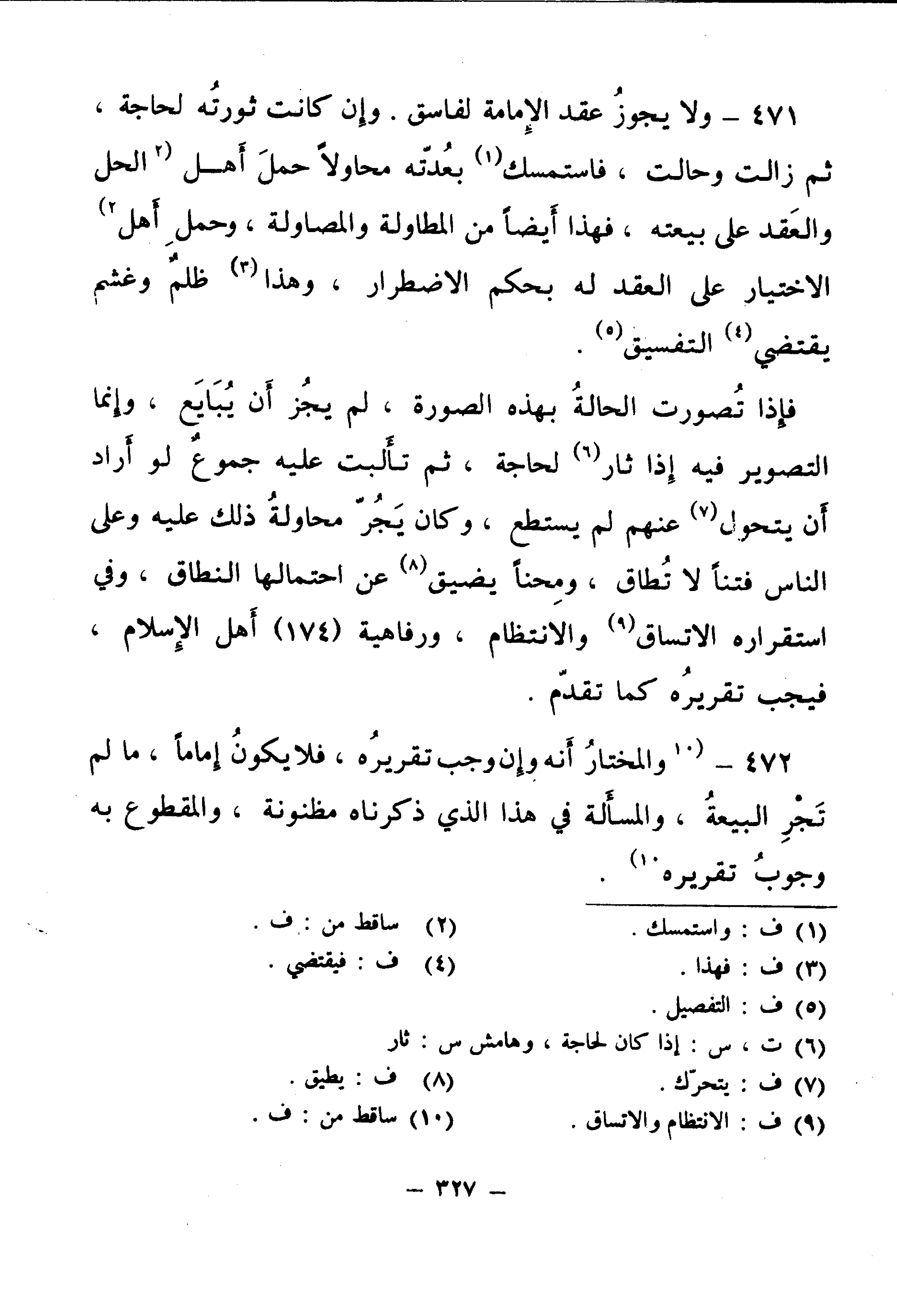 471 - وَلَا يَجُوزُ عَقْدُ الْإِمَامَةِ لِفَاسِقٍ، وَإِنْ كَانَتْ ثَوْرَتُهُ لِحَاجَةٍ ثُمَّ زَالَتْ وَحَالَتْ، فَاسْتَمْسَكَ بِعُدَّتِهِ مُحَاوِلًا حَمْلَ أَهْلِ الْحَلِّ وَالْعَقْدِ عَلَى بَيْعَتِهِ، فَهَذَا أَيْضًا مِنَ الْمُطَاوَلَةِ وَالْمُصَاوَلَةِ، وَحَمْلُ أَهْلِ الِاخْتِيَارِ عَلَى الْعَقْدِ لَهُ بِحُكْمِ الِاضْطِرَارِ، وَهَذَا ظُلْمٌ وَغَشْمٌ يَقْتَضِي التَّفْسِيقَ.