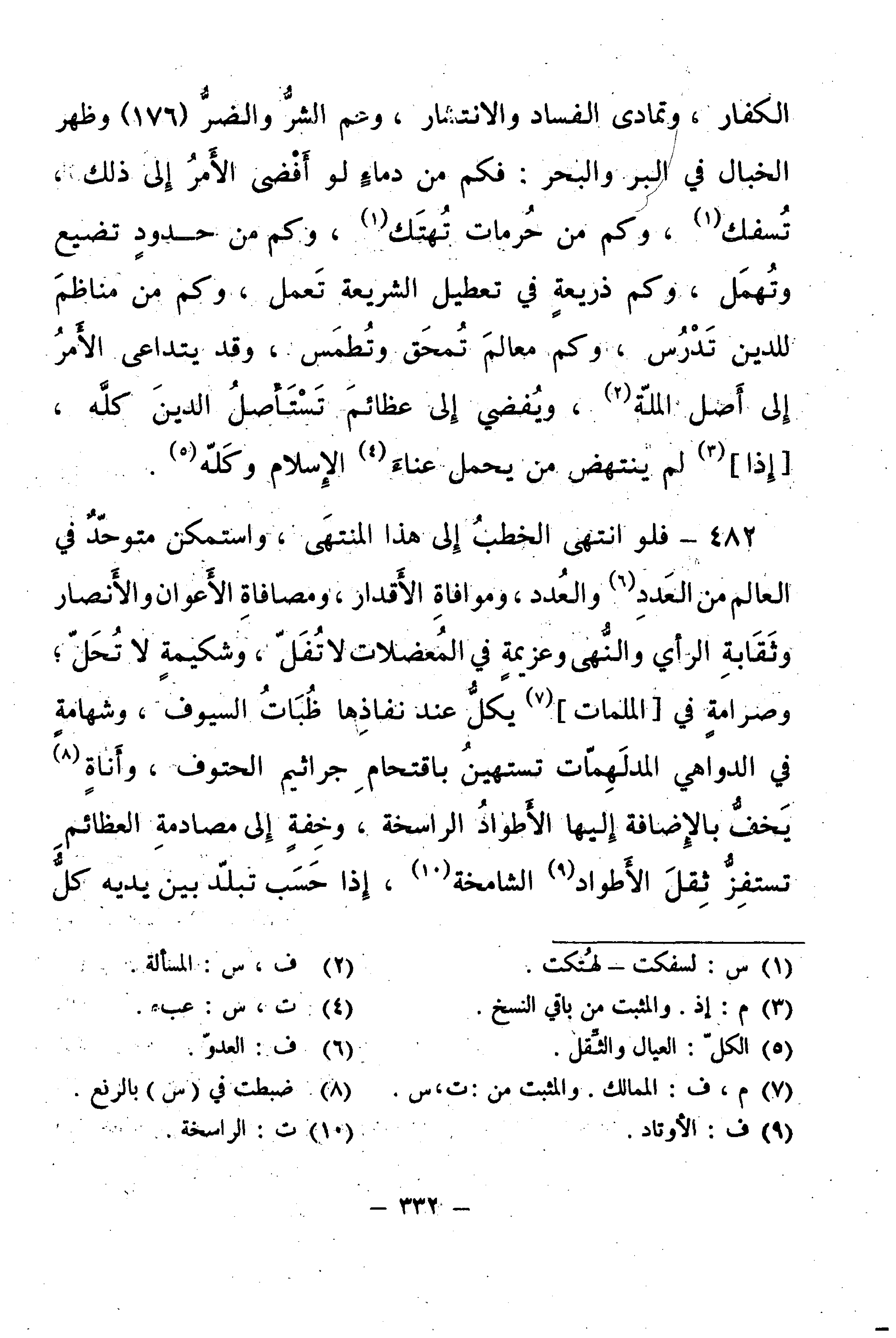 الْكُفَّارُ، وَتَمَادَى الْفَسَادُ وَالِانْتِشَارُ، وَعَمَّ الشَّرُّ وَالضُّرُّ (176) وَظَهَرَ الْخَبَالُ فِي الْبَحْرِ وَالْبَرِّ: فَكَمْ مِنْ دِمَاءٍ لَوْ أَفْضَى الْأَمْرُ إِلَى ذَلِكَ تُسْفَكُ، وَكَمْ مِنْ حُرُمَاتٍ تُهْتَكُ، وَكَمْ مِنْ حُدُودٍ تَضِيعُ وَتُهْمَلُ، وَكَمْ ذَرِيعَةٍ فِي تَعْطِيلِ الشَّرِيعَةِ تَعْمَلُ، وَكَمْ مِنْ مَنَاظِمَ لِلدِّينِ تَدْرَسُ، وَكَمْ مَعَالِمَ تُمْحَقُ وَتُطْمَسُ.