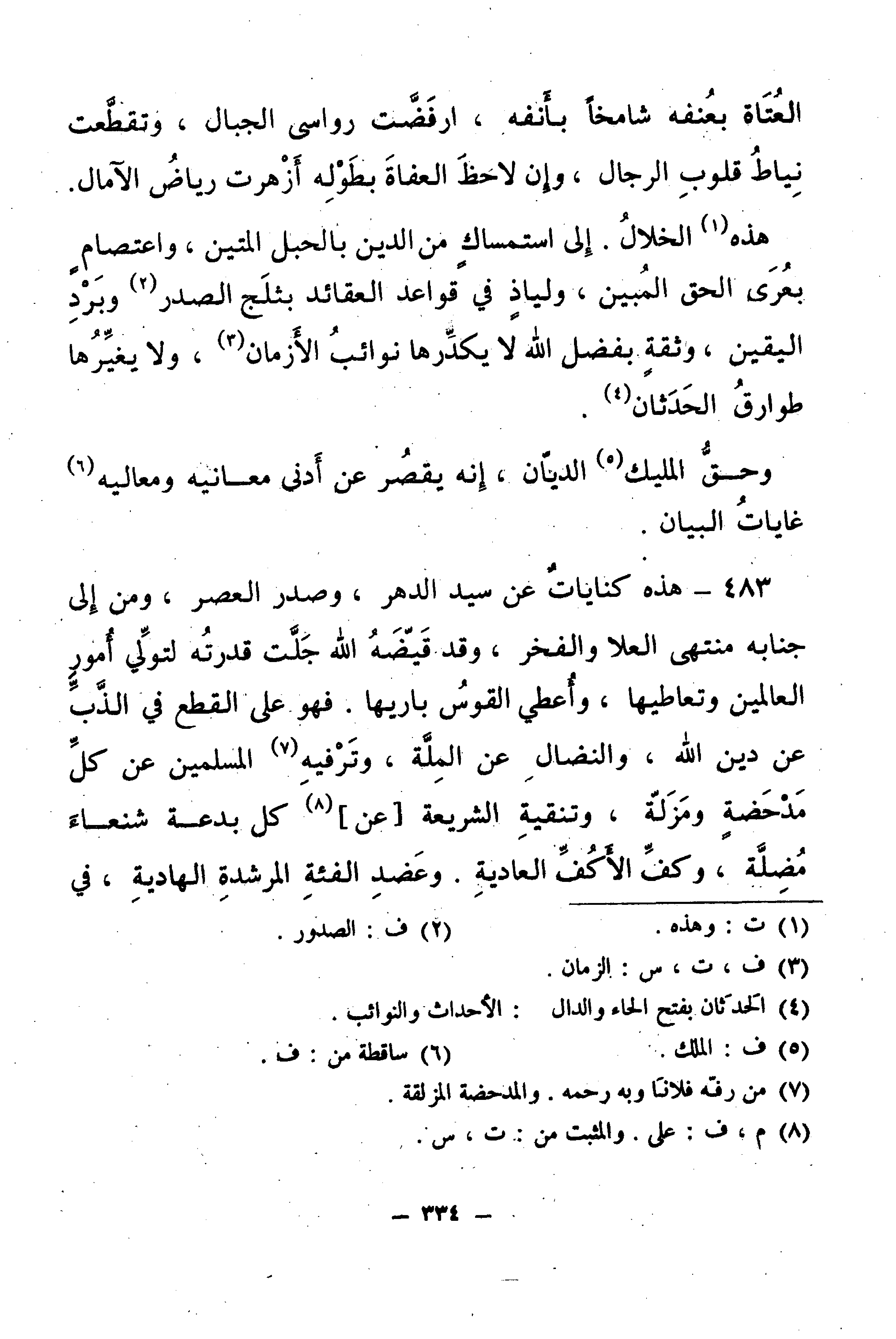 وَهَذِهِ الْخِلَالُ إِلَى اسْتِمْسَاكٍ مِنَ الدِّينِ بِالْحَبْلِ الْمَتِينِ، وَاعْتِصَامٍ بِعُرَى الْحَقِّ الْمُبِينِ، وَلِيَاذٍ فِي قَوَاعِدِ الْعَقَائِدِ بِثَلْجِ الصَّدْرِ، وَبَرْدِ الْيَقِينِ، وَثِقَةٍ بِفَضْلِ اللَّهِ لَا يُكَدِّرُهَا نَوَائِبُ الْأَزْمَانِ، وَلَا يُغَيِّرُهَا طَوَارِقُ الْحَدَثَانِ.