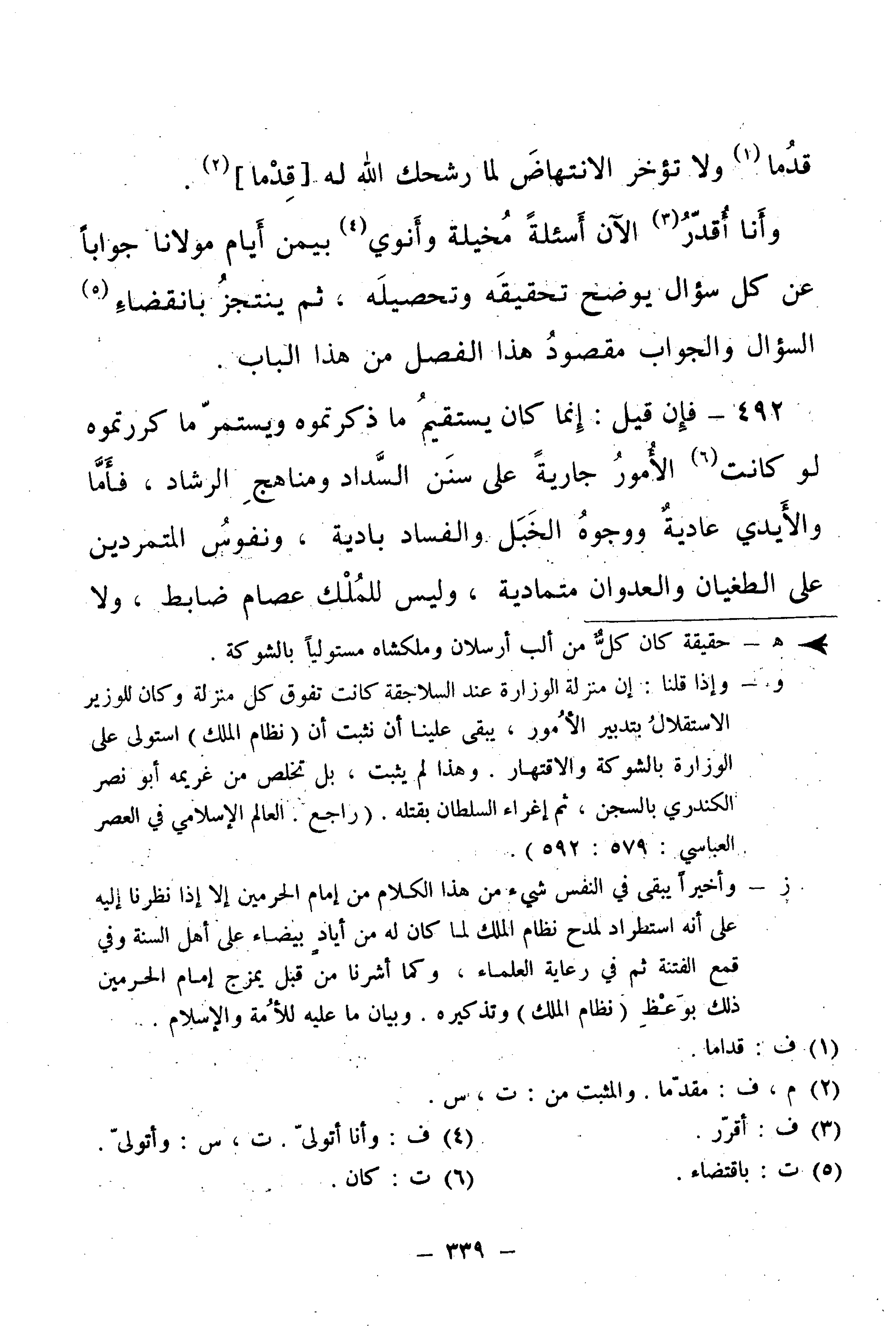 492 - فَإِنْ قِيلَ: إِنَّمَا كَانَ يَسْتَقِيمُ مَا ذَكَرْتُمُوهُ وَيَسْتَمِرُّ مَا كَرَّرْتُمُوهُ لَوْ كَانَتِ الْأُمُورُ جَارِيَةً عَلَى سُنَنِ السَّدَادِ وَمَنَاهِجِ الرَّشَادِ، فَأَمَّا وَالْأَيْدِي عَادِيَةٌ، وَوُجُوهُ الْخَبَلِ وَالْفَسَادِ بَادِيَةٌ، وَنُفُوسُ الْمُتَمَرِّدِينَ عَلَى الطُّغْيَانِ وَالْعُدْوَانِ مُتَمَادِيَةٌ، وَلَيْسَ لِلْمُلْكِ عِصَامٌ ضَابِطٌ، وَلَا
