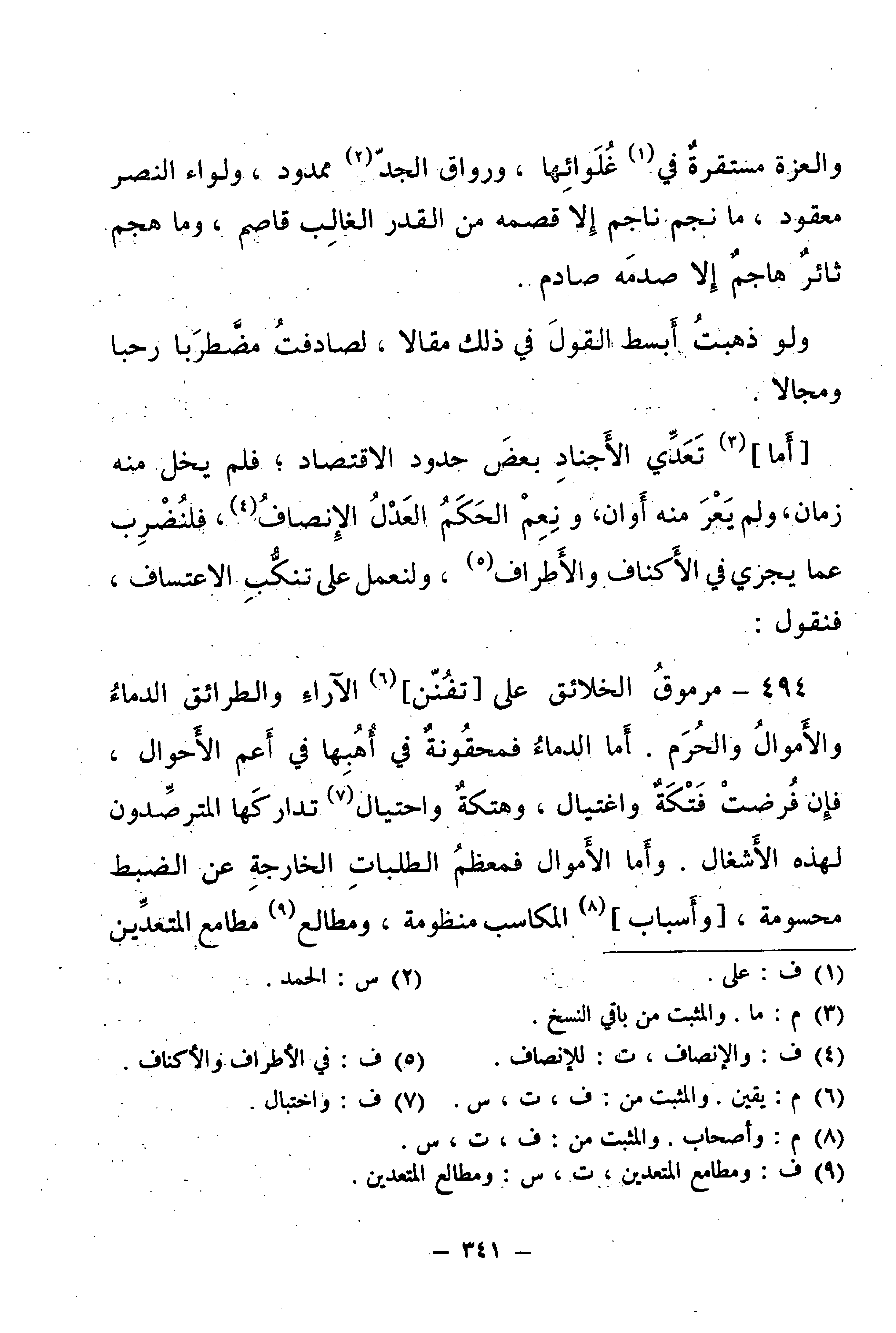 494 - مَرْمُوقُ الْخَلَائِقِ عَلَى [تَفَنُّنِ] الْآرَاءِ وَالطَّرَائِقِ الدِّمَاءُ وَالْأَمْوَالُ وَالْحُرَمُ. أَمَّا الدِّمَاءُ فَمَحْقُونَةٌ فِي أُهُبِهَا فِي أَعَمِّ الْأَحْوَالِ، فَإِنْ فُرِضَتْ فَتْكَةٌ وَاغْتِيَالٌ، وَهَتْكَةٌ وَاحْتِيَالٌ تَدَارَكَهَا الْمُتَرَصِّدُونَ لِهَذِهِ الْأَشْغَالِ.