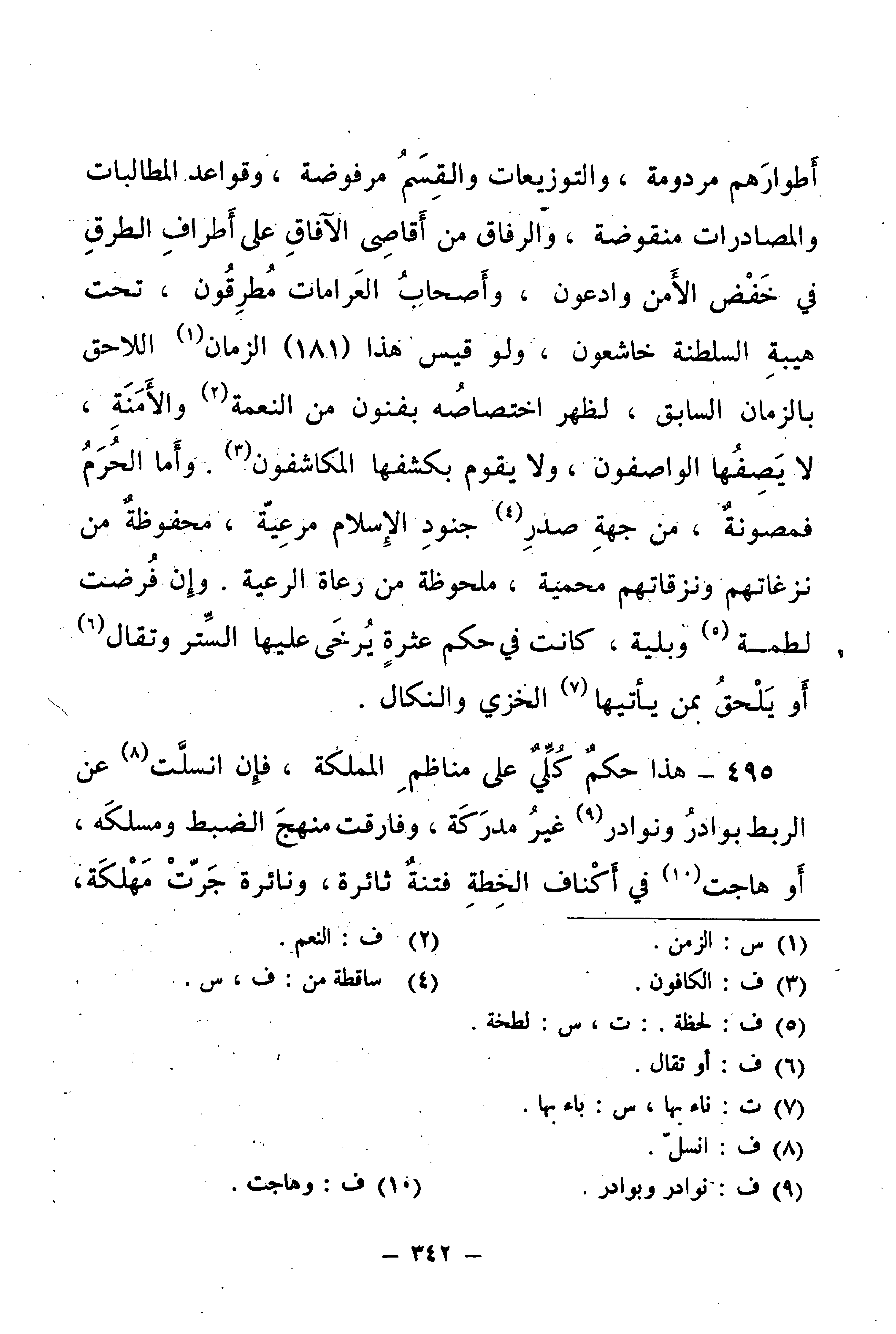 495 - هَذَا حُكْمٌ كُلِّيٌّ عَلَى مَنَاظِمِ الْمَمْلَكَةِ، فَإِنِ انْسَلَّتْ عَنِ الرَّبْطِ بَوَادِرُ وَنَوَادِرُ غَيْرُ مُدْرَكَةٍ، وَفَارَقَتْ مَنْهَجَ الضَّبْطِ وَمَسْلَكَهُ أَوْ هَاجَتْ فِي أَكْنَافِ الْخُطَّةِ فِتْنَةٌ ثَائِرَةٌ، وَنَائِرَةٌ جَرَّتْ مَهْلَكَةً،