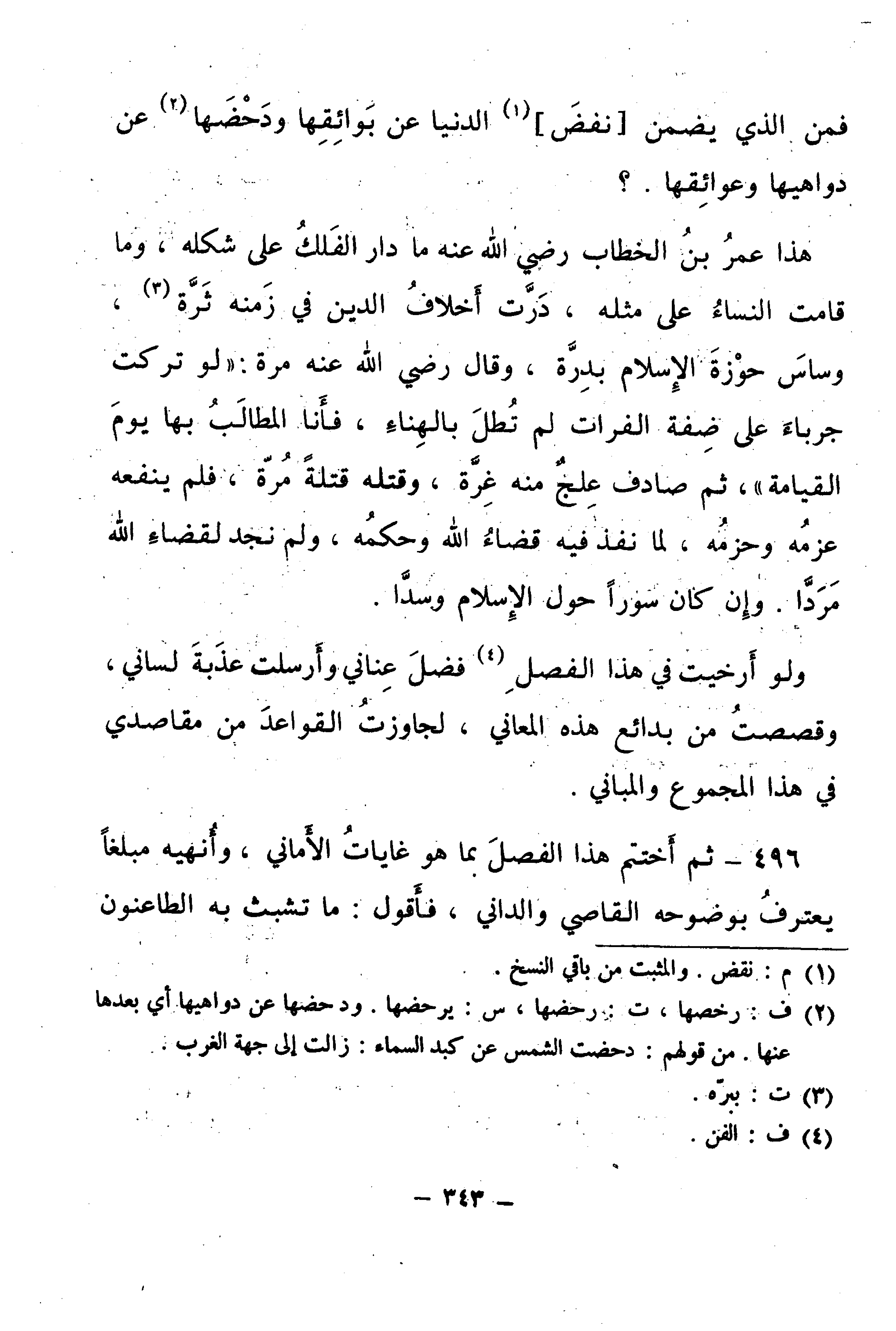496 - ثُمَّ أَخْتَتِمُ هَذَا الْفَصْلِ بِمَا هُوَ غَايَاتُ الْأَمَانِي، وَأُنْهِيهِ مَبْلَغًا يَعْتَرِفُ بِمَوْضُوعِهِ الْقَاصِي وَالدَّانِي، فَأَقُولُ: مَا تَشَبَّثَ بِهِ الطَّاعِنُونَ