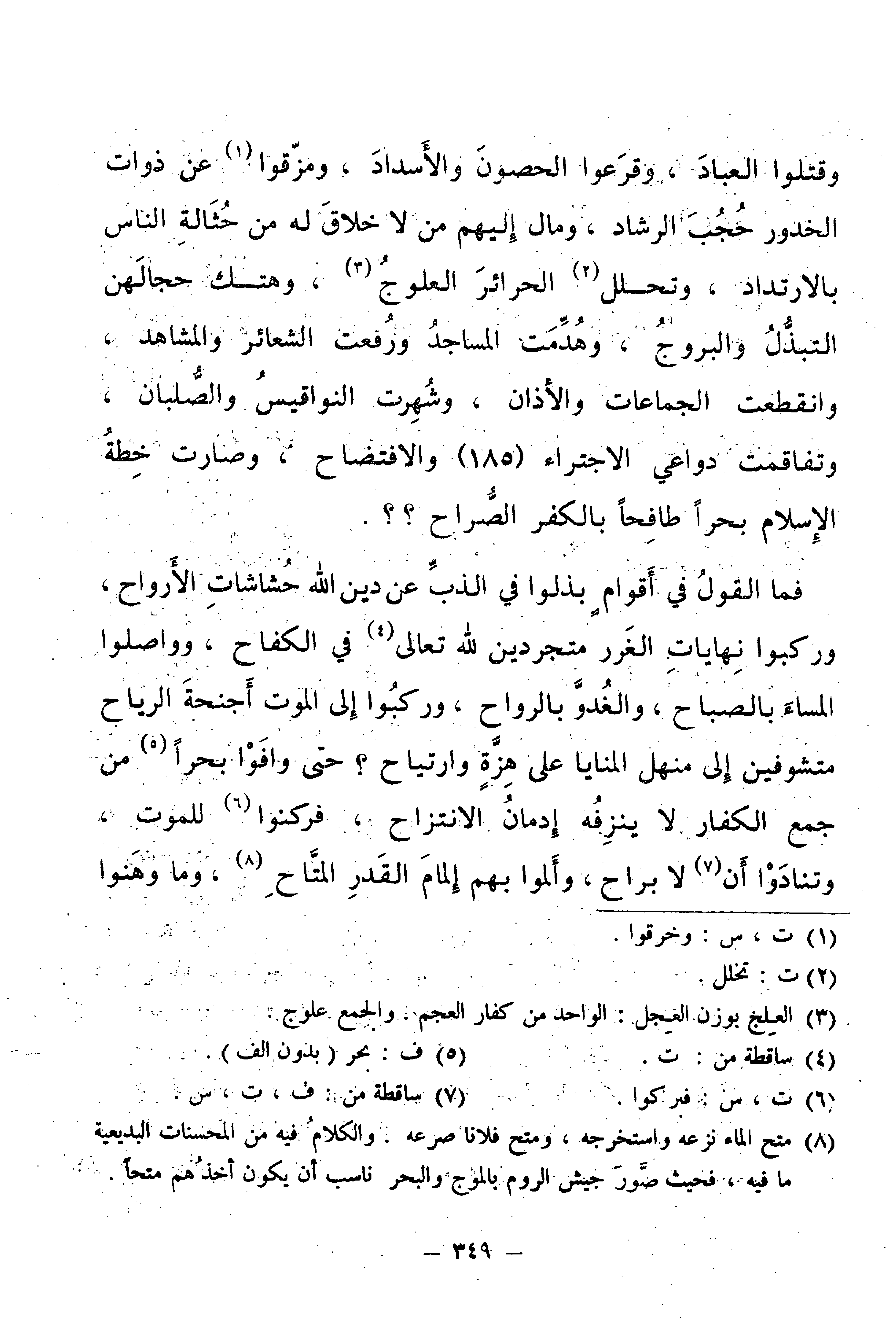 وَقَتَلُوا الْعِبَادَ، وَقَرَعُوا الْحُصُونَ وَالْأَسْدَادَ، وَخَرَقُوا عَنْ ذَوَاتِ الْخُدُورِ حُجُبَ الرَّشَادِ، وَمَالَ إِلَيْهِمْ مَنْ لَا خَلَاقَ لَهُ مِنْ حُثَالَةِ النَّاسِ بِالِارْتِدَادِ، وَتَخَلَّلَ الْحَرَائِرَ الْعُلُوجُ، وَهَتَكَ حِجَالَهُنَّ التَّبَذُّلُ وَالْبُرُوجُ، وَهُدِّمَتِ الْمَسَاجِدُ، وَرُفِعَتِ الشَّعَائِرُ وَالْمَشَاهِدُ، وَانْقَطَعَتِ الْجَمَاعَاتُ وَالْأَذَانُ وَشُهِرَتِ النَّوَاقِيسُ وَالصُّلْبَانُ وَتَفَاقَمَتْ دَوَاعِي الِاجْتِرَاءِ (185) وَالِافْتِضَاحِ، وَصَارَتْ خُطَّةُ الْإِسْلَامِ بَحْرًا طَافِحًا بِالْكُفْرِ الصُّرَاحِ؟ فَمَا الْقَوْلُ فِي أَقْوَامٍ بَذَلُوا فِي الذَّبِّ عَنْ دِينِ اللَّهِ حُشَاشَاتِ الْأَرْوَاحِ، وَرَكِبُوا نِهَايَاتِ الْغَرَرِ مُتَجَرِّدِينَ لِلَّهِ تَعَالَى فِي الْكِفَاحِ، وَوَاصَلُوا الْمَسَاءَ بِالصَّبَاحِ، وَالْغُدُوَّ بِالرَّوَاحِ، وَرَكِبُوا إِلَى الْمَوْتِ أَجْنِحَةَ الرِّيَاحِ، مُتَشَوِّفِينَ إِلَى مَنْهَلِ الْمَنَايَا عَلَى هِزَّةٍ وَارْتِيَاحٍ؟ حَتَّى وَافَوْا بَحْرًا مِنْ جَمْعِ الْكُفَّارِ لَا يَنْزِفُهُ إِدْمَانُ الِانْتِزَاحِ، فَرَكَنُوا لِلْمَوْتِ.
