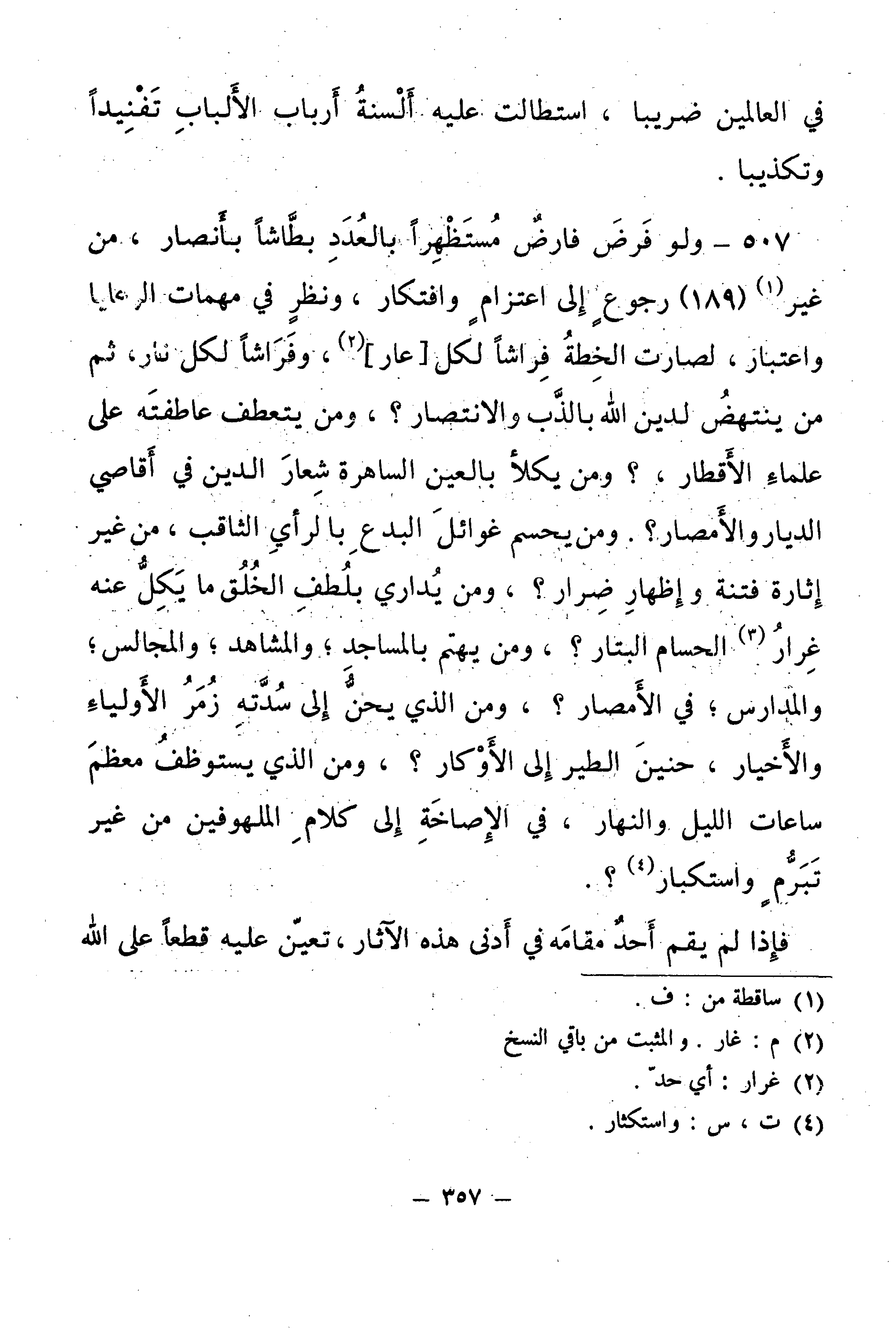 507 - وَلَوْ فَرَضَ فَارِضٌ مُسْتَظْهِرًا بِالْعُدَدِ بَطَّاشًا بِأَنْصَارٍ، مِنْ غَيْرِ (189) رُجُوعٍ إِلَى اعْتِزَامٍ وَافْتِكَارٍ، وَنَظَرٍ فِي مُهِمَّاتِ الرَّعَايَا وَاعْتِبَارٍ، لَصَارَتِ الْخُطَّةُ فِرَاشًا لِكُلِّ [عَارٍ] ، وَفَرَاشًا لِكُلِّ نَارٍ.