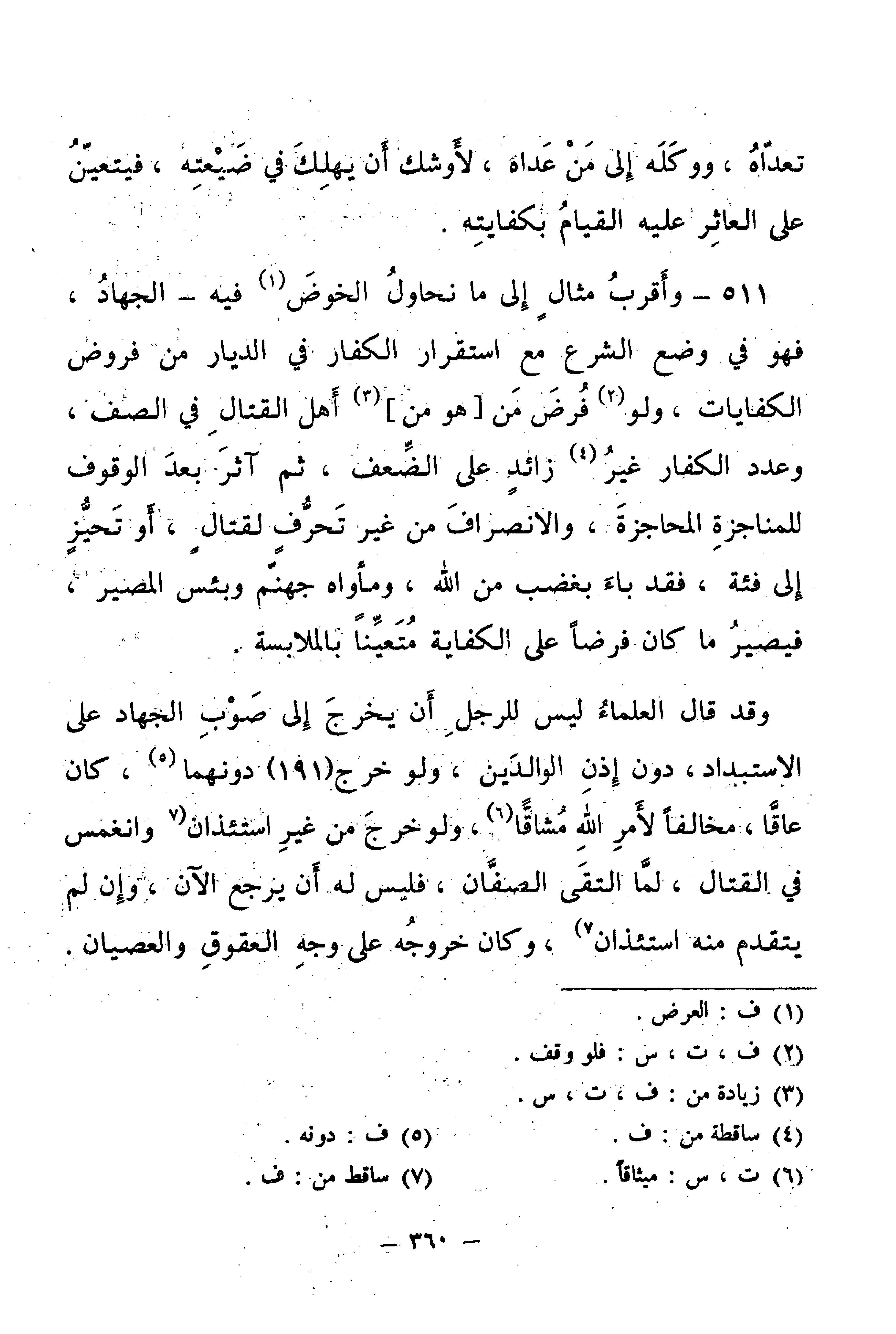 511 - وَأَقْرَبُ مِثَالٍ إِلَى مَا نُحَاوِلُ الْخَوْضَ فِيهِ - الْجِهَادُ، فَهُوَ فِي وَضْعِ الشَّرْعِ مَعَ اسْتِقْرَارِ الْكُفَّارِ فِي الدِّيَارِ مِنْ فُرُوضِ الْكِفَايَاتِ، وَلَوْ فُرِضَ مَنْ [هُوَ مِنْ] أَهْلِ الْقِتَالِ فِي الصَّفِّ، وَعَدَدُ الْكُفَّارِ غَيْرُ زَائِدٍ عَلَى الضِّعْفِ، ثُمَّ آثَرَ بَعْدَ الْوُقُوفِ لِلْمُنَاجَزَةِ الْمُحَاجَزَةَ وَالِانْصِرَافَ مِنْ غَيْرِ تَحَرُّفٍ لِقِتَالٍ، أَوْ تَحَيُّزٍ إِلَى فِئَةٍ، فَقَدْ بَاءَ بِغَضَبٍ مِنَ اللَّهِ، وَمَأْوَاهُ جَهَنَّمُ وَبِئْسَ الْمَصِيرُ، فَيَصِيرُ مَا كَانَ فَرْضًا عَلَى الْكِفَايَةِ مُتَعَيِّنًا بِالْمُلَابَسَةِ.