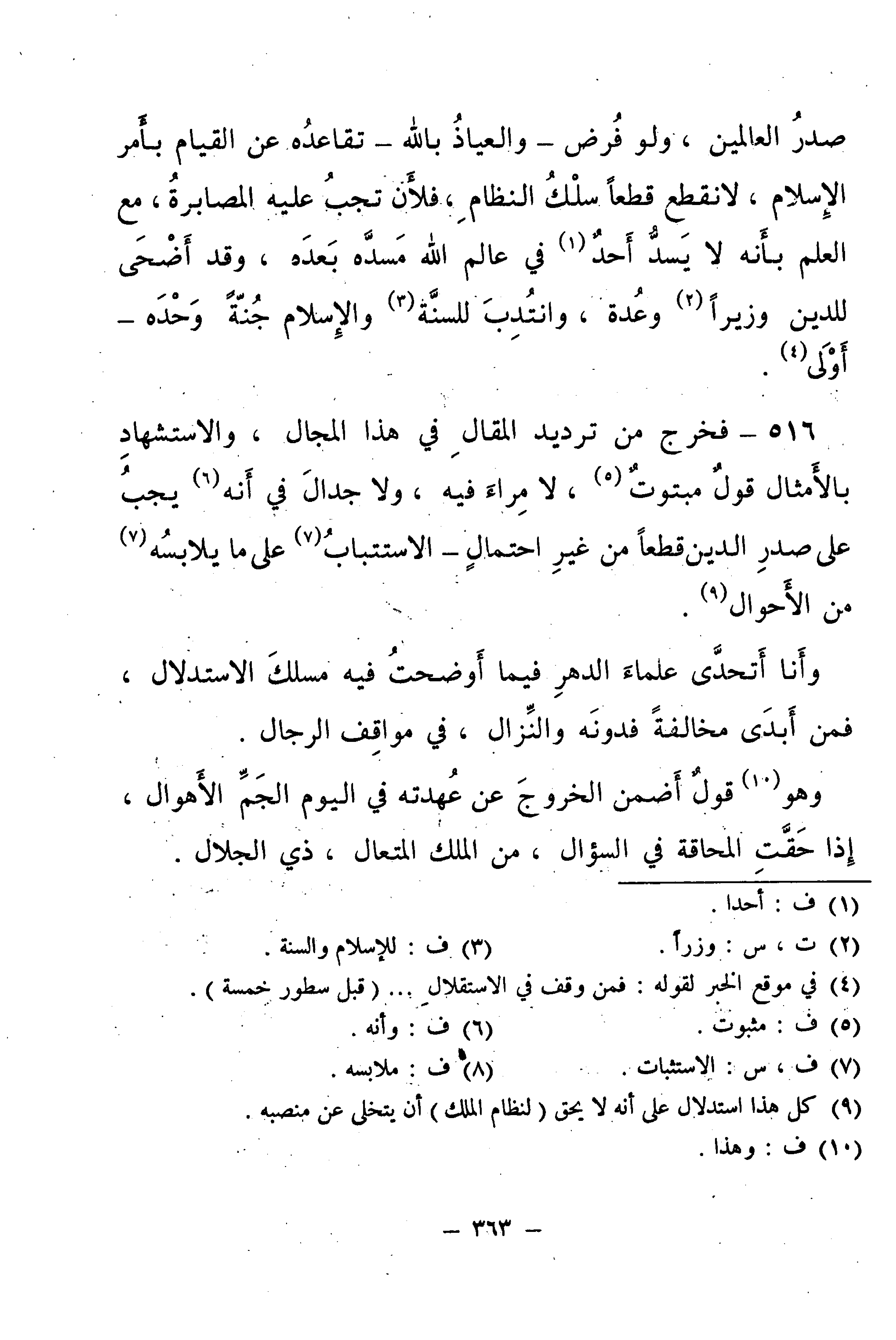 516 - فَخَرَجَ مِنْ تَرْدِيدِ الْمَقَالِ فِي هَذَا الْمَجَالِ، وَالِاسْتِشْهَادِ بِالْأَمْثَالِ قَوْلٌ مَبْتُوتٌ، لَا مِرَاءَ فِيهِ، وَلَا جِدَالَ فِي أَنَّهُ يَجِبُ عَلَى صَدْرِ الدِّينِ قَطْعًا مِنْ غَيْرِ احْتِمَالٍ - الِاسْتِثْبَاتُ عَلَى مَا يُلَابِسُهُ مِنَ الْأَحْوَالِ.
