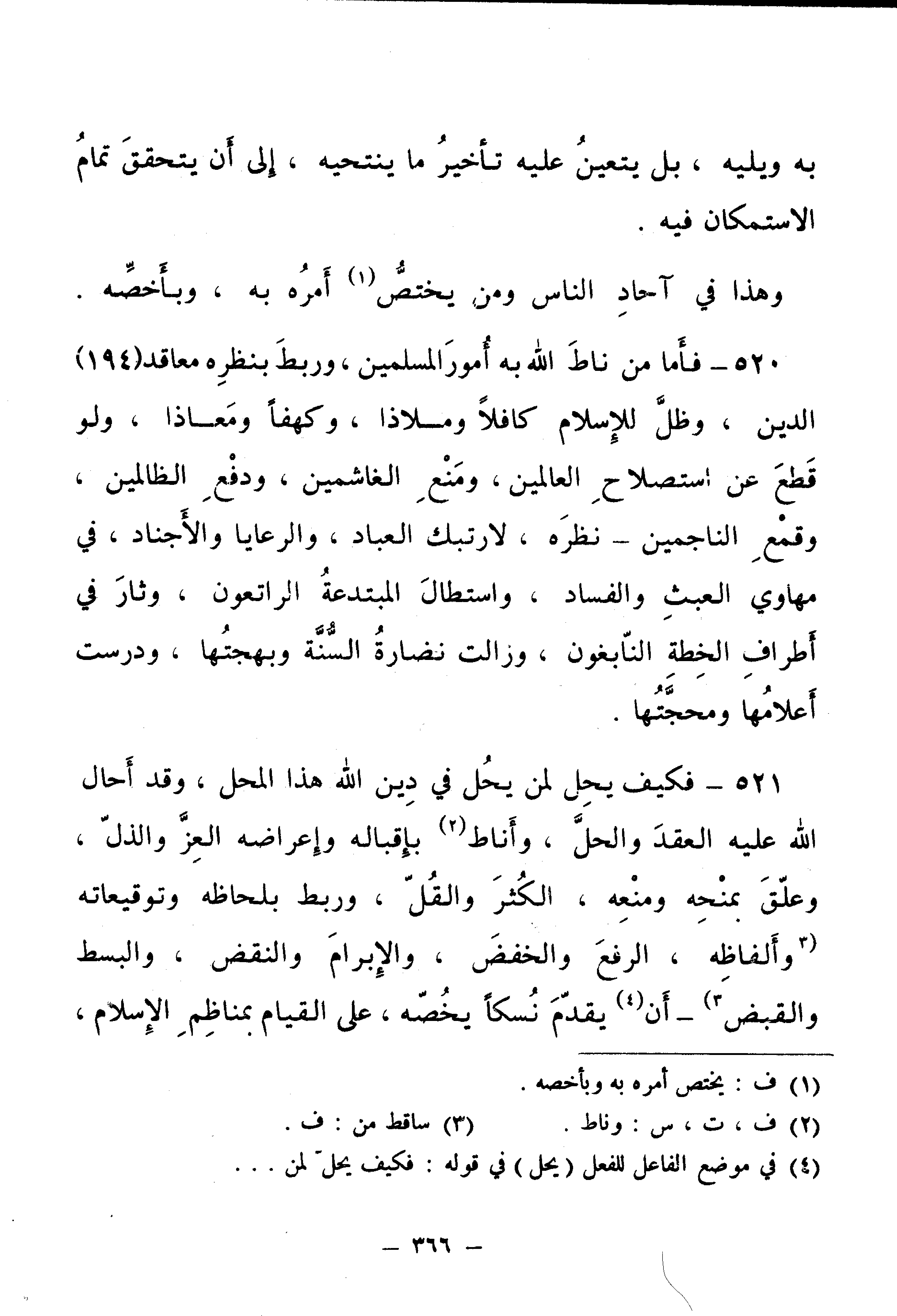 520 - فَأَمَّا مَنْ نَاطَ اللَّهُ بِهِ أُمُورَ الْمُسْلِمِينَ، وَرَبَطَ بِنَظَرِهِ مَعَاقِدَ (194) الدِّينِ، وَظَلَّ لِلْإِسْلَامِ كَافِلًا وَمَلَاذًا، وَكَهْفًا وَمُعَاذًا، وَلَوْ قَطَعَ عَنِ اسْتِصْلَاحِ الْعَالَمِينَ، وَمَنْعِ الْغَاشِمِينَ، وَدَفْعِ الظَّالِمِينَ، وَقَمْعِ النَّاجِمِينَ - نَظَرَهُ، لَارْتَبَكَ الْعِبَادُ، وَالرَّعَايَا وَالْأَجْنَادُ، فِي مَهَاوِي الْعَبَثِ وَالْفَسَادِ، وَاسْتَطَالَ الْمُبْتَدِعَةُ الرَّاتِعُونَ، وَثَارَ فِي أَطْرَافِ الْخُطَّةِ النَّابِغُونَ، وَزَالَتْ نَضَارَةُ السُّنَّةِ وَبَهْجَتُهَا، وَدَرَسَتْ أَعْلَامُهَا وَمَحَجَّتُهَا.