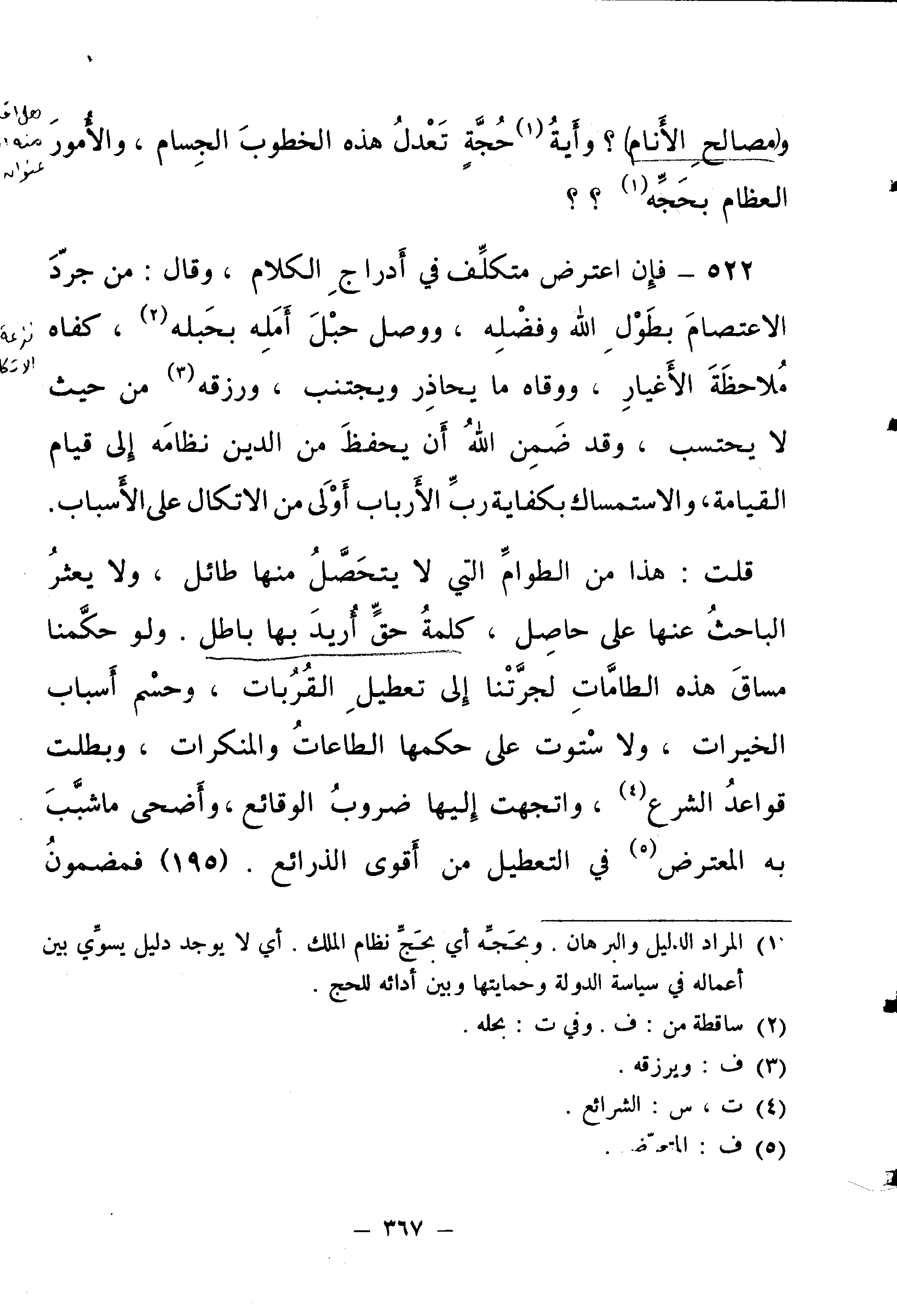 522 - فَإِنِ اعْتَرَضَ مُتَكَلِّفٌ فِي أَدْرَاجِ الْكَلَامِ، وَقَالَ: مَنْ جَرَّدَ الِاعْتِصَامَ بِطَوْلِ اللَّهِ وَفَضْلِهِ، وَوَصَلَ حَبْلَ أَمَلِهِ بِحَبْلِهِ، كَفَاهُ مُلَاحَظَةَ الْأَغْيَارِ، وَوَقَاهُ مَا يُحَاذِرُ وَيَجْتَنِبُ، وَرَزَقَهُ مِنْ حَيْثُ لَا يَحْتَسِبُ، وَقَدْ ضَمِنَ اللَّهُ أَنْ يَحْفَظَ مِنَ الدِّينِ نِظَامَهُ إِلَى قِيَامِ الْقِيَامَةِ، وَالِاسْتِمْسَاكُ بِكِفَايَةِ رَبِّ الْأَرْبَابِ أَوْلَى مِنَ الِاتِّكَالِ عَلَى الْأَسْبَابِ.