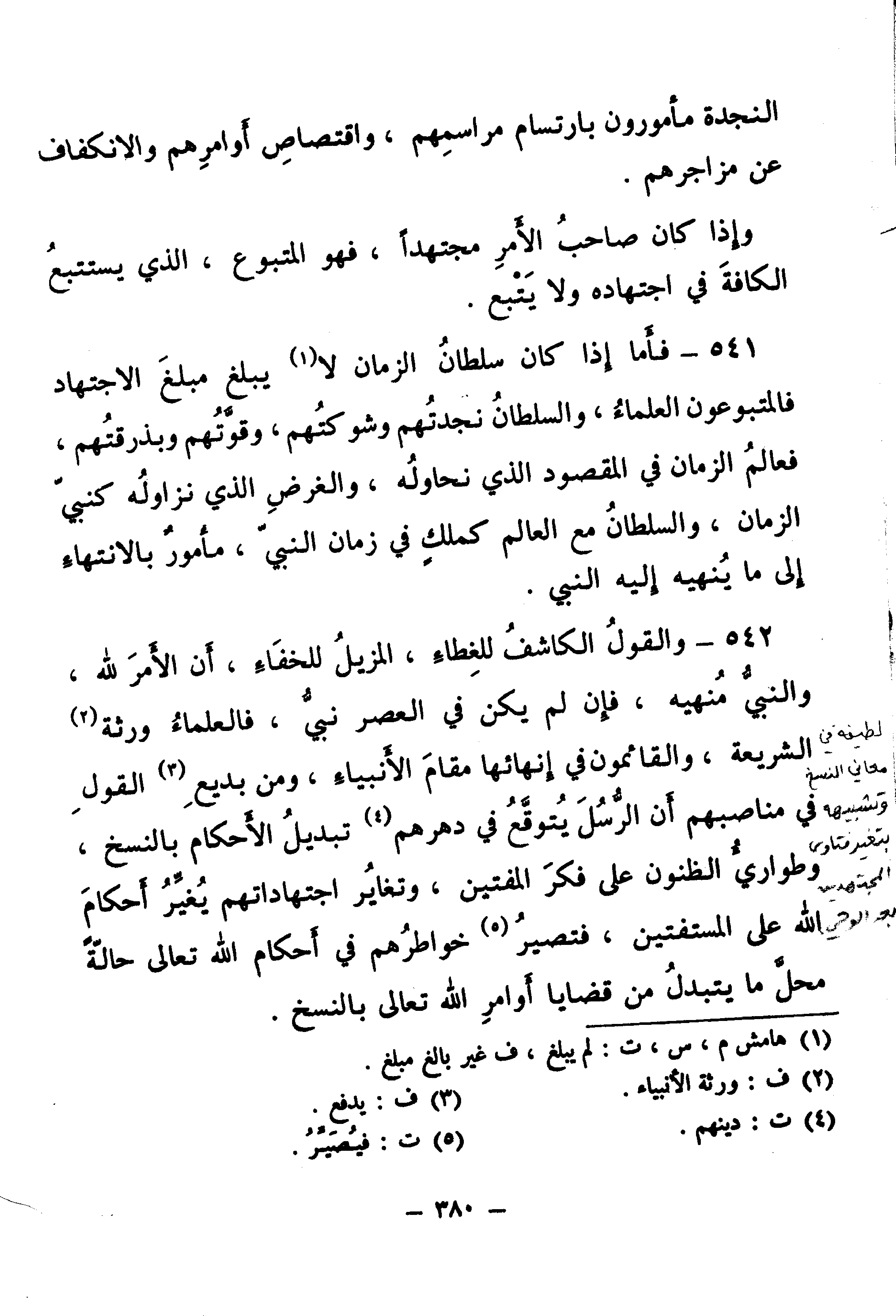 541 - فَأَمَّا إِذَا كَانَ سُلْطَانُ الزَّمَانِ لَمْ يَبْلُغْ مَبْلَغَ الِاجْتِهَادِ فَالْمَتْبُوعُونَ الْعُلَمَاءُ، وَالسُّلْطَانُ نَجَدَتُهُمْ وَشَوْكَتُهُمْ، وَقُوَّتُهُمْ وَبَذْرَقَتُهُمْ، فَعَالِمُ الزَّمَانِ فِي الْمَقْصُودِ الَّذِي نُحَاوِلُهُ، وَالْغَرَضِ الَّذِي نُزَاوِلُهُ كَنَبِيِّ الزَّمَانِ، وَالسُّلْطَانُ مَعَ الْعَالِمِ كَمَلِكٍ فِي زَمَانِ النَّبِيِّ، مَأْمُورٌ بِالِانْتِهَاءِ إِلَى مَا يُنْهِيهِ إِلَيْهِ النَّبِيُّ.
