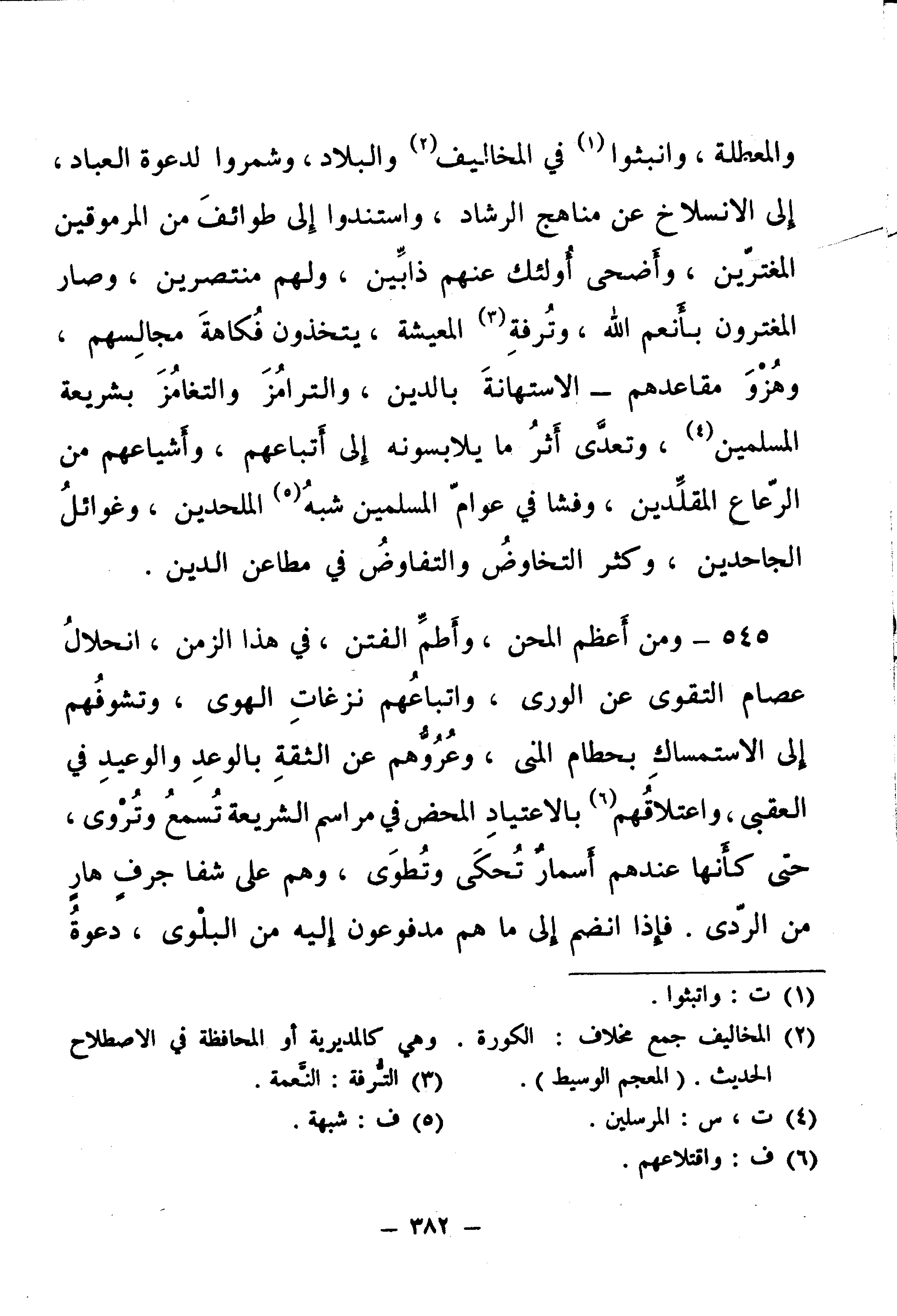 545 - وَمِنْ أَعْظَمِ الْمِحَنِ، وَأَطَمِّ الْفِتَنِ فِي هَذَا الزَّمَنِ، انْحِلَالُ عِصَامِ التَّقْوَى عَنِ الْوَرَى، وَاتِّبَاعُهُمْ نَزَعَاتِ الْهَوَى، وَتَشَوُّفُهُمْ إِلَى الِاسْتِمْسَاكِ بِحُطَامِ الْمُنَى، وَعُرُّوُهُمْ عَنِ الثِّقَةِ بِالْوَعْدِ وَالْوَعِيدِ فِي الْعُقْبَى، وَاعْتِلَاقُهُمْ بِالِاعْتِيَادِ الْمَحْضِ فِي مَرَاسِمِ الشَّرِيعَةِ تُسْمَعُ وَتُرْوَى، حَتَّى كَأَنَّهَا عِنْدَهُمْ أَسْمَارٌ تُحْكَى وَتُطْوَى، وَهُمْ عَلَى شَفَا جُرُفٍ هَارٍ مِنَ الرَّدَى.