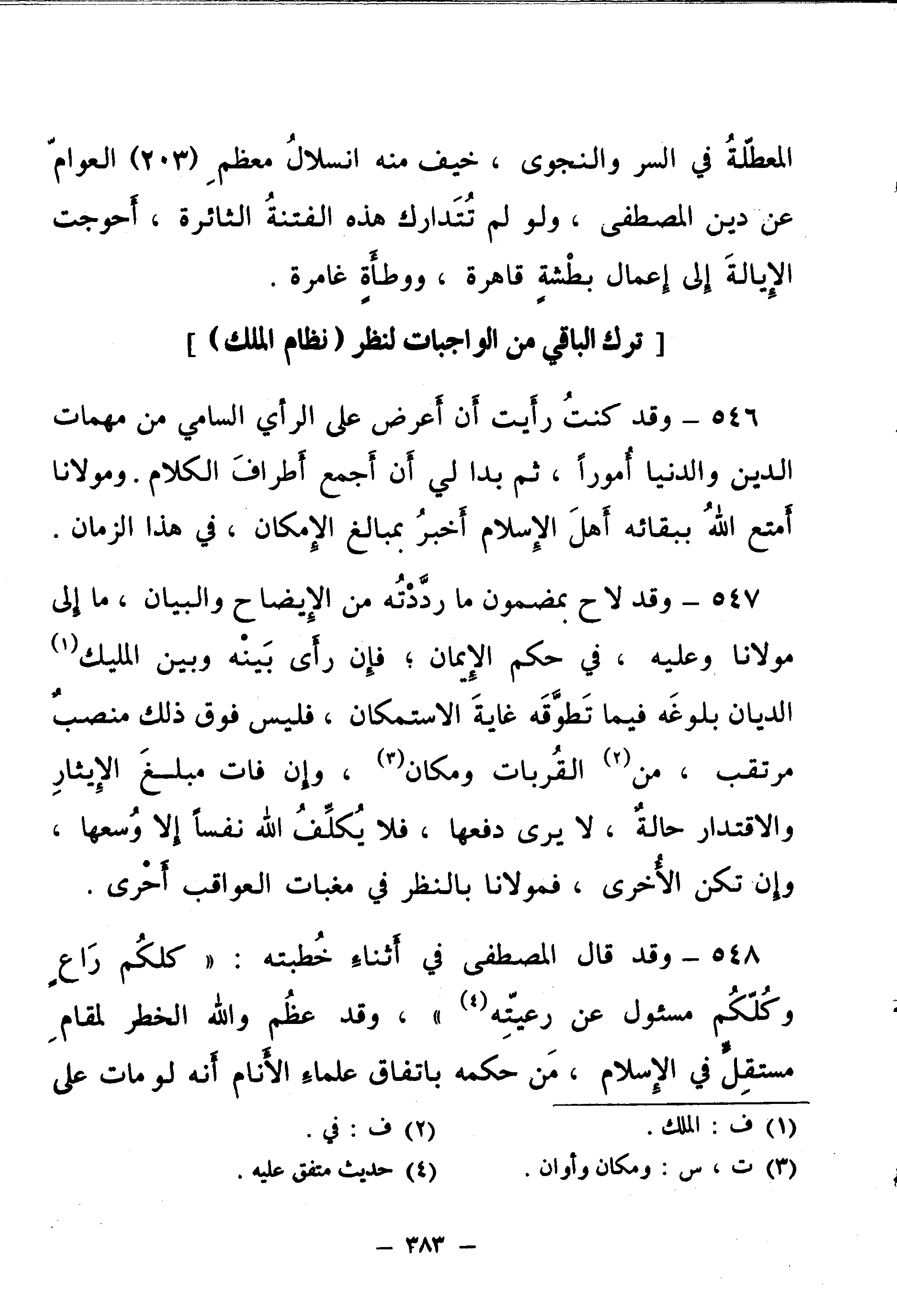 546 - وَقَدْ كُنْتُ رَأَيْتُ أَنْ أَعْرِضَ عَلَى الرَّأْيِ السَّامِي مِنْ مُهِمَّاتِ الدِّينِ وَالدُّنْيَا أُمُورًا، ثُمَّ بَدَا لِي أَنْ أَجْمَعَ أَطْرَافَ الْكَلَامِ. وَمَوْلَانَا أَمْتَعَ اللَّهُ بِبَقَائِهِ أَهْلَ الْإِسْلَامِ أَخْبَرُ بِمَبَالِغِ الْإِمْكَانِ، فِي هَذَا الزَّمَانِ.