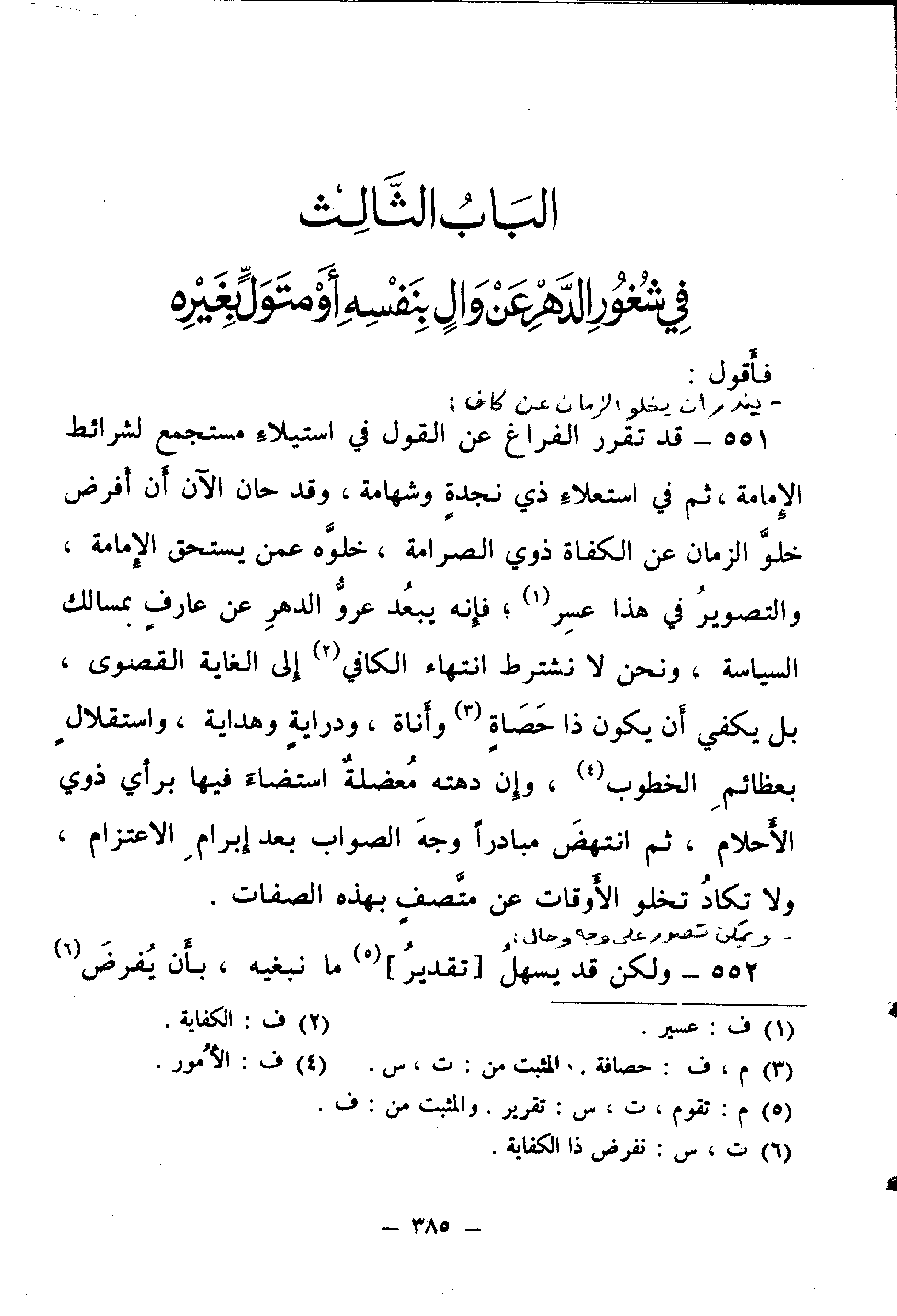 551 - قَدْ تَقَرَّرَ الْفَرَاغُ عَنِ الْقَوْلِ فِي اسْتِيلَاءِ مُسْتَجْمِعٍ لِشَرَائِطِ الْإِمَامَةِ، ثُمَّ فِي اسْتِعْلَاءِ ذِي نَجْدَةٍ وَشَهَامَةٍ، وَقَدْ حَانَ الْآنَ أَنْ أَفْرِضَ خُلُوَّ الزَّمَانِ عَنِ الْكُفَاةِ ذَوِي الصَّرَامَةِ، خُلُوَّهُ عَمَّنْ يَسْتَحِقُّ الْإِمَامَةَ، وَالتَّصْوِيرُ فِي هَذَا عَسِرٌ ; فَإِنَّهُ يَبْعُدُ عُرُوُّ الدَّهْرِ عَنْ عَارِفٍ بِمَسَالِكِ السِّيَاسَةِ، وَنَحْنُ لَا نَشْتَرِطُ انْتِهَاءَ الْكَافِي إِلَى الْغَايَةِ الْقُصْوَى، بَلْ كَفَى أَنْ يَكُونَ ذَا حَصَاةٍ وَأَنَاةٍ، وَدِرَايَةٍ وَهِدَايَةٍ، وَاسْتِقْلَالٍ بِعَظَائِمِ الْخُطُوبِ، وَإِنْ دَهَتْهُ مُعْضِلَةٌ اسْتَضَاءَ فِيهَا بِرَأْيِ ذَوِي الْأَحْلَامِ، ثُمَّ انْتَهَضَ مُبَادِرًا وَجْهَ الصَّوَابِ بَعْدَ إِبْرَامِ الِاعْتِزَامِ، وَلَا يَكَادُ تَخْلُو الْأَوْقَاتُ عَنْ مُتَّصِفٍ بِهَذِهِ الصِّفَاتِ.