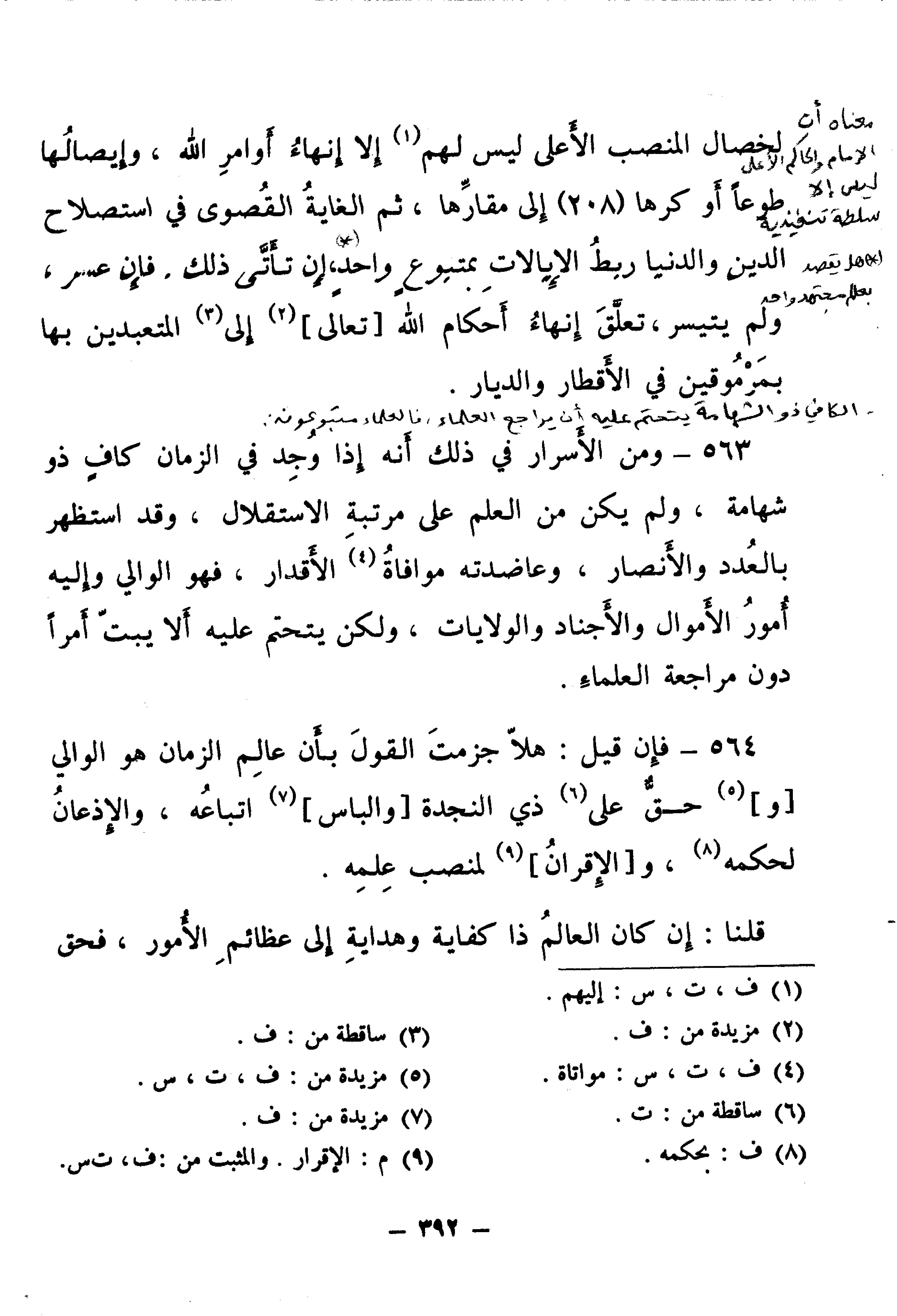 563 - وَمِنَ الْأَسْرَارِ فِي ذَلِكَ أَنَّهُ إِذَا وُجِدَ فِي الزَّمَانِ كَافٍ ذُو شَهَامَةٍ، وَلَمْ يَكُنْ مِنَ الْعِلْمِ عَلَى مَرْتَبَةِ الِاسْتِقْلَالِ، وَقَدِ اسْتَظْهَرَ بِالْعُدَدِ وَالْأَنْصَارِ، وَعَاضَدَتْهُ مُوَاتَاةُ الْأَقْدَارِ، فَهُوَ الْوَالِي وَإِلَيْهِ أُمُورُ الْأَمْوَالِ وَالْأَجْنَادِ وَالْوِلَايَاتِ، لَكِنْ يَتَحَتَّمُ عَلَيْهِ أَلَّا يَبُتَّ أَمْرًا دُونَ مُرَاجَعَةِ الْعُلَمَاءِ.