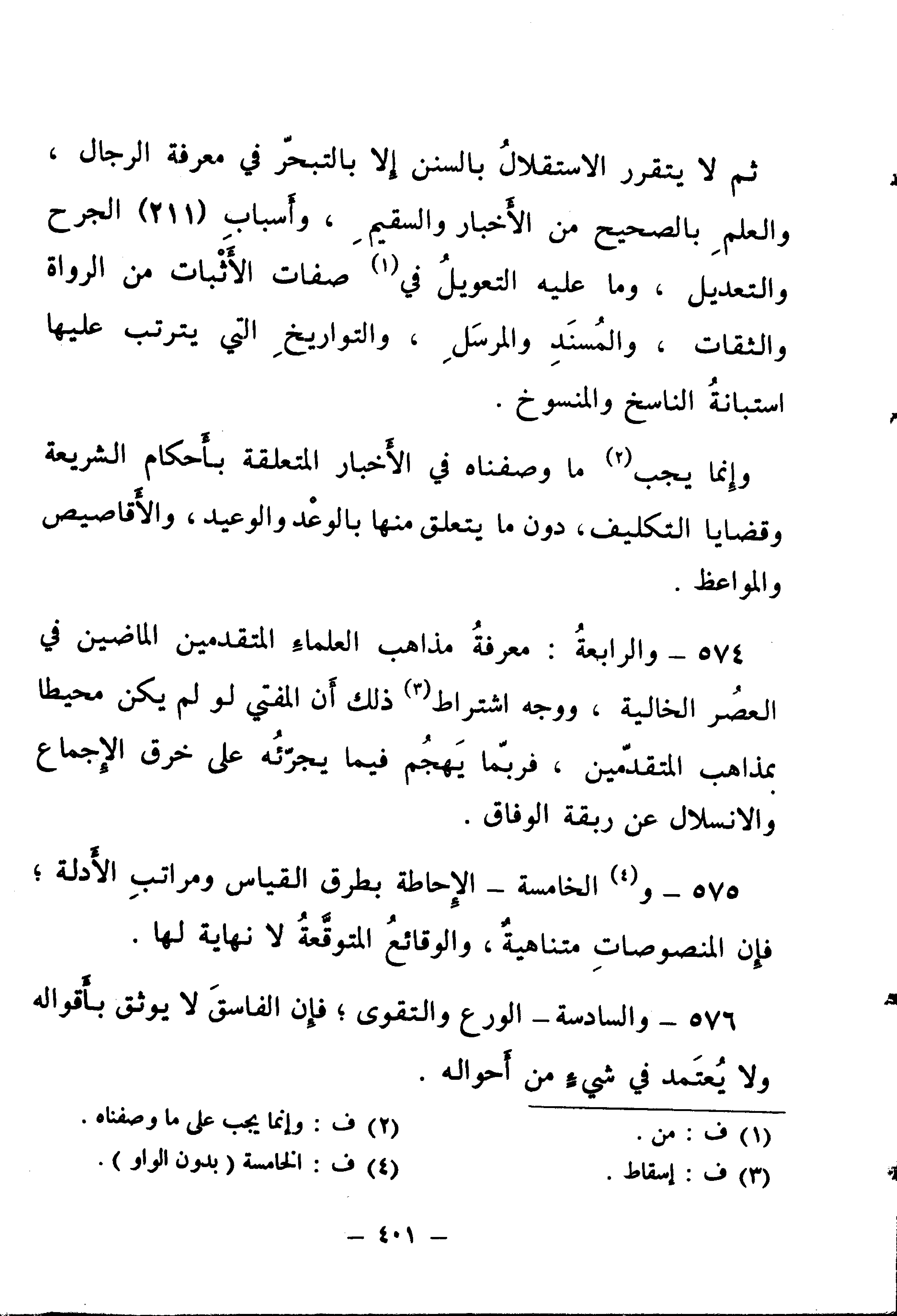 ثُمَّ لَا يَتَقَرَّرُ الِاسْتِقْلَالُ بِالسُّنَنِ إِلَّا بِالتَّبَحُّرِ فِي مَعْرِفَةِ الرِّجَالِ، وَالْعِلْمِ بِالصَّحِيحِ مِنَ الْأَخْبَارِ وَالسَّقِيمِ، وَأَسْبَابِ الْجَرْحِ وَالتَّعْدِيلِ، وَمَا عَلَيْهِ التَّعْوِيلُ فِي صِفَاتِ الْأَثْبَاتِ مِنَ الرُّوَاةِ وَالثِّقَاتِ، وَالْمُسْنَدِ وَالْمُرْسَلِ، وَالتَّوَارِيخِ الَّتِي تَتَرَتَّبُ عَلَيْهَا اسْتِبَانَةُ النَّاسِخِ وَالْمَنْسُوخِ.