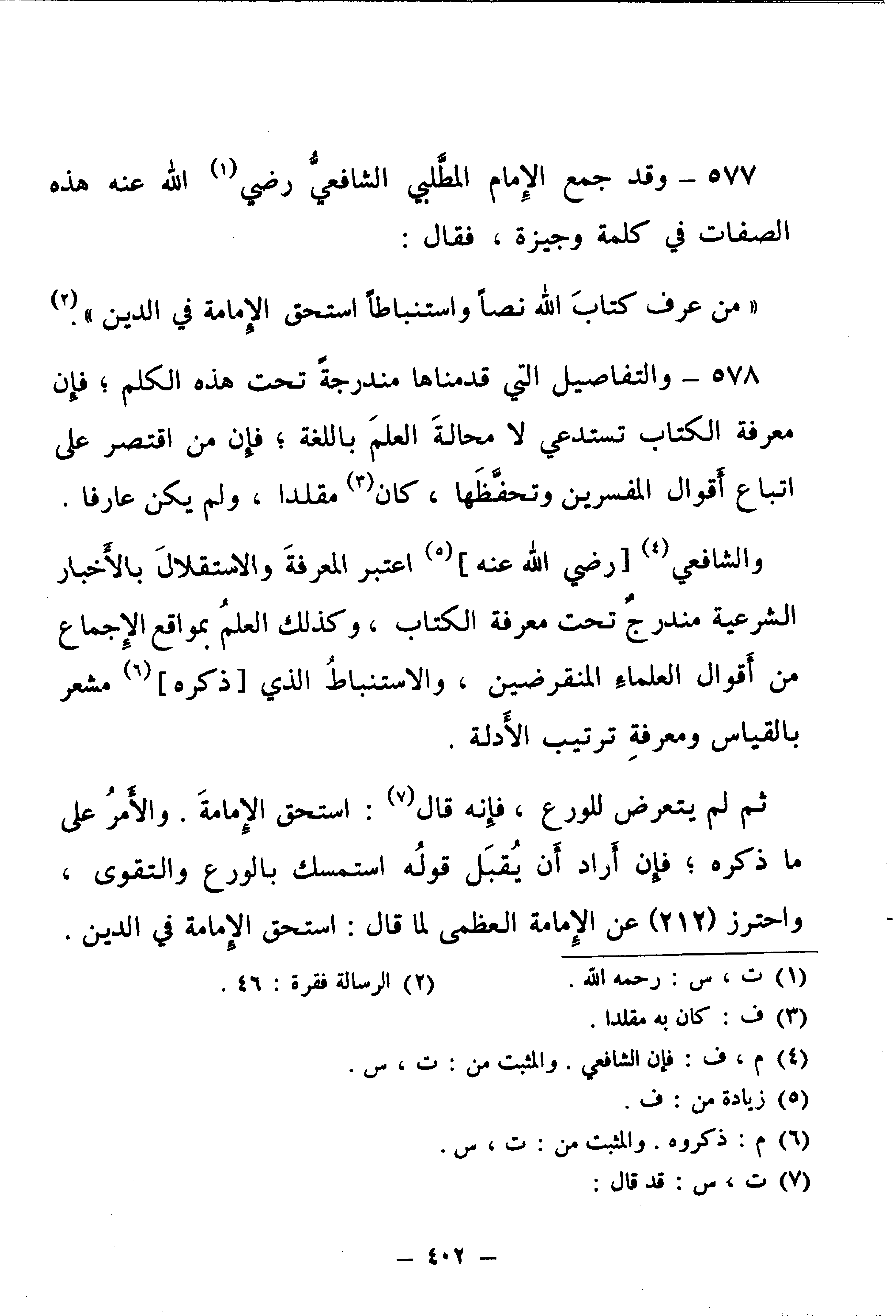 577 - وَقَدْ جَمَعَ الْإِمَامُ الْمُطَّلِبِيُّ الشَّافِعِيُّ - رَضِيَ اللَّهُ عَنْهُ - هَذِهِ الصِّفَاتِ فِي كَلِمَةٍ وَجِيزَةٍ، فَقَالَ: