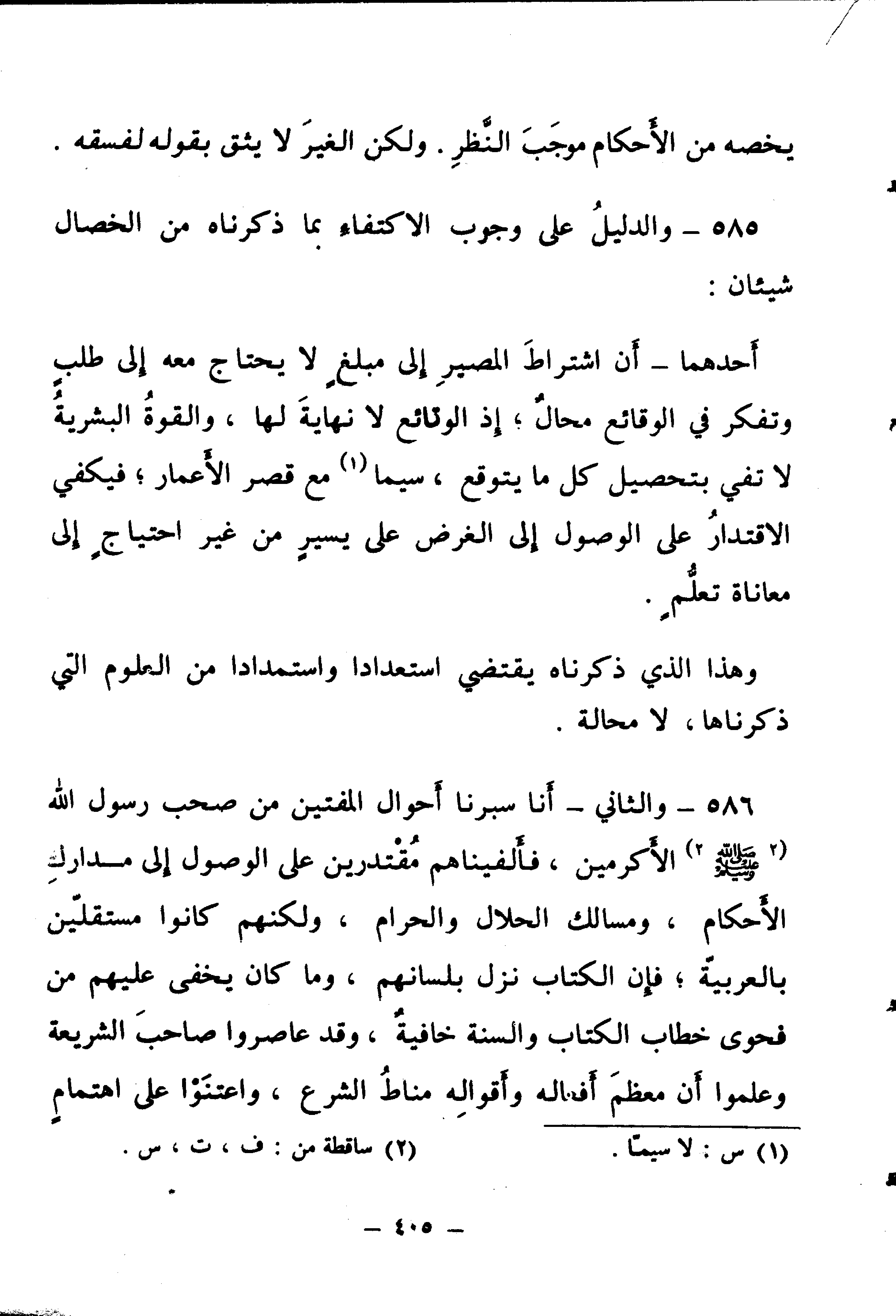 585 - وَالدَّلِيلُ عَلَى وُجُوبِ الِاكْتِفَاءِ بِمَا ذَكَرْنَاهُ مِنَ الْخِصَالِ شَيْئَانِ: أَحَدُهُمَا - أَنَّ اشْتِرَاطَ الْمَصِيرِ إِلَى مَبْلَغٍ لَا يَحْتَاجُ مَعَهُ إِلَى طَلَبٍ وَتَفَكُّرٍ فِي الْوَقَائِعِ مُحَالٌ، إِذِ الْوَقَائِعُ لَا نِهَايَةَ لَهَا، وَالْقُوَّةُ الْبَشَرِيَّةُ لَا تَفِي بِتَحْصِيلِ كُلِّ مَا يُتَوَقَّعُ، سِيَّمَا مَعَ قِصَرِ الْأَعْمَارِ ; فَيَكْفِي الِاقْتِدَارُ عَلَى الْوُصُولِ إِلَى الْغَرَضِ عَلَى يَسِيرٍ مِنْ غَيْرِ احْتِيَاجٍ إِلَى مُعَانَاةِ تَعَلُّمٍ.