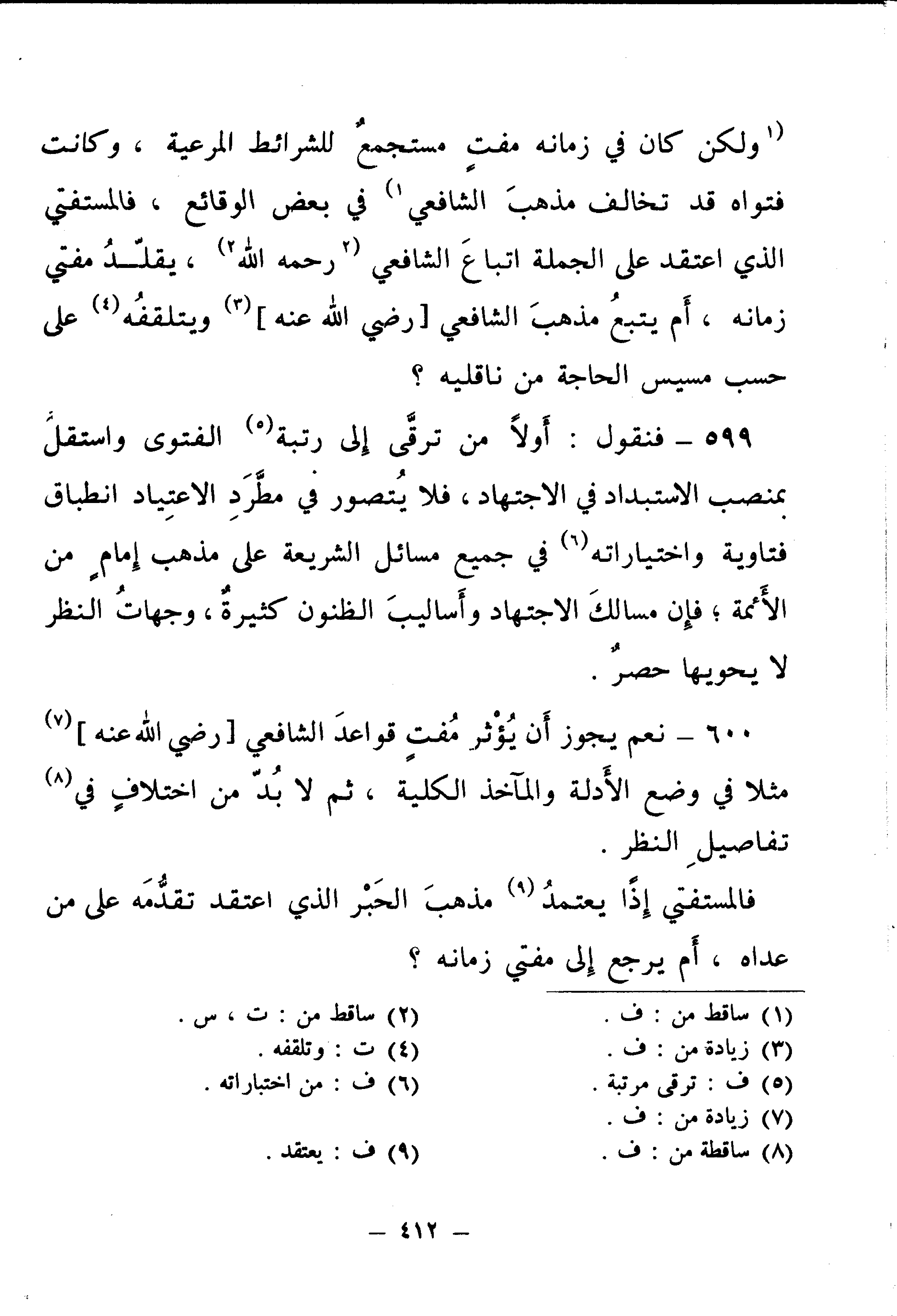 599 - فَنَقُولُ: أَوَّلًا مَنْ تَرَقَّى إِلَى رُتْبَةِ الْفَتْوَىِ وَاسْتَقَلَّ بِمَنْصِبِ الِاسْتِبْدَادِ فِي الِاجْتِهَادِ، فَلَا يُتَصَوَّرُ فِي مُطَّرِدِ الِاعْتِيَادِ انْطِبَاقُ فَتَاوِيهِ وَاخْتِيَارَاتِهِ فِي جَمِيعِ مَسَائِلِ الشَّرِيعَةِ عَلَى مَذْهَبِ إِمَامٍ مِنَ الْأَئِمَّةِ ; فَإِنَّ مَسَالِكَ الِاجْتِهَادِ وَأَسَالِيبَ الظُّنُونِ كَثِيرَةٌ، وَجِهَاتُ النَّظَرِ لَا يَحْوِيهَا حَصْرٌ.
