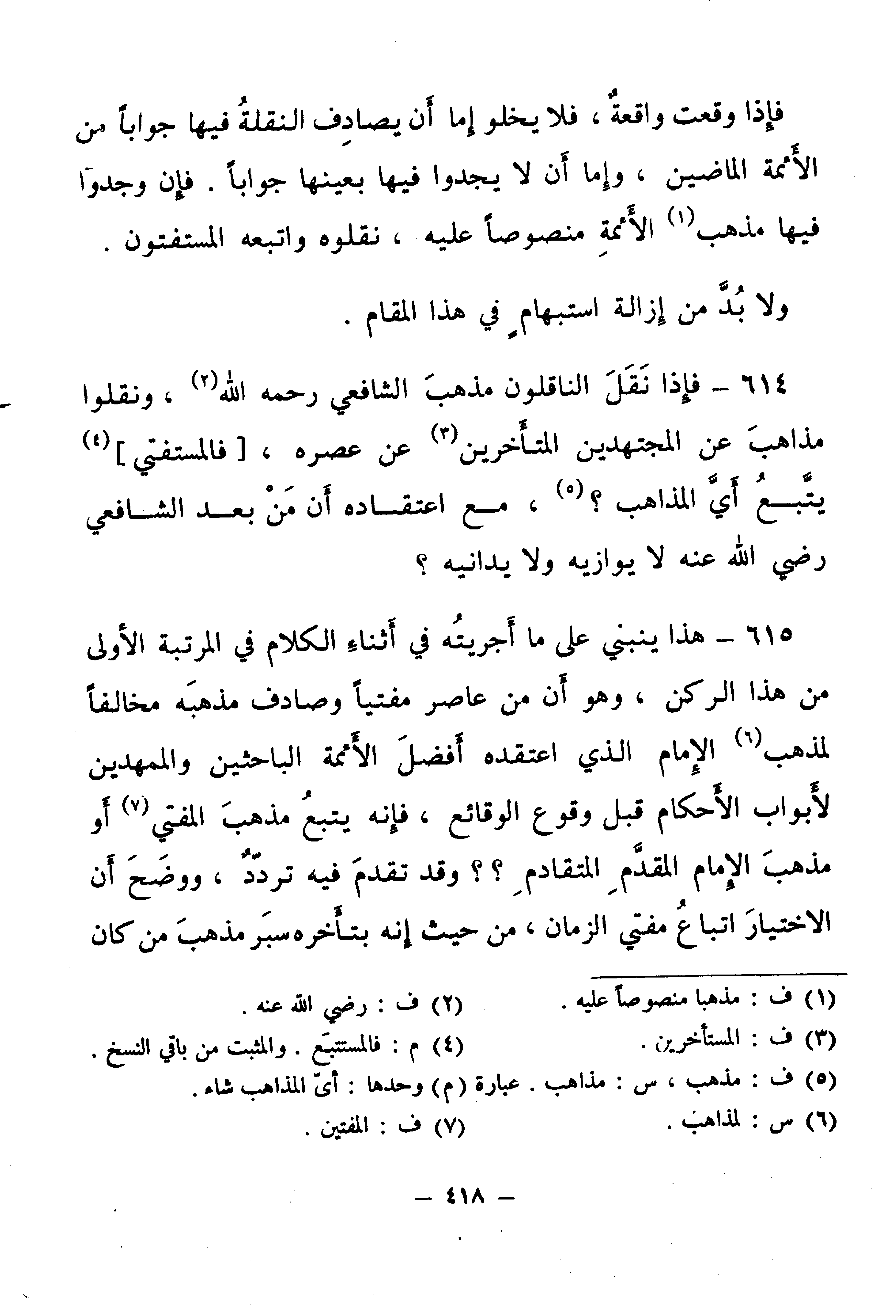 615 - هَذَا يَنْبَنِي عَلَى مَا أَجْرَيْتُهُ فِي أَثْنَاءِ الْكَلَامِ فِي الْمَرْتَبَةِ الْأُولَى مِنْ هَذَا الرُّكْنِ، وَهُوَ أَنَّ مَنْ عَاصَرَ مُفْتِيًا، وَصَادَفَ مَذْهَبَهُ مُخَالِفًا لِمَذْهَبِ الْإِمَامِ الَّذِي اعْتَقَدَهُ أَفْضَلُ الْأَئِمَّةِ الْبَاحِثِينَ وَالْمُمَهِّدِينَ لِأَبْوَابِ الْأَحْكَامِ قَبْلَ وُقُوعِ الْوَقَائِعِ، فَإِنَّهُ يَتَّبِعُ مَذْهَبَ الْمُفْتِي أَوْ مَذْهَبَ الْإِمَامِ الْمُقَدَّمِ الْمُتَقَادِمِ؟ وَقَدْ تَقَدَّمَ فِيهِ تَرَدَّدٌ، وَوَضَحَ أَنَّ الِاخْتِيَارَ اتِّبَاعُ مُفْتِي الزَّمَانِ، مِنْ حَيْثُ إِنَّهُ بِتَأَخُّرِهِ سَبَرَ مَذْهَبَ مَنْ كَانَ